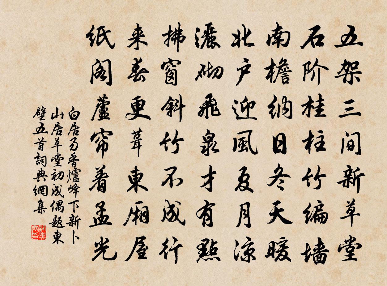 五架三間新草堂,石階桂柱竹編牆。南檐納日冬天暖,北戶迎風夏月涼。