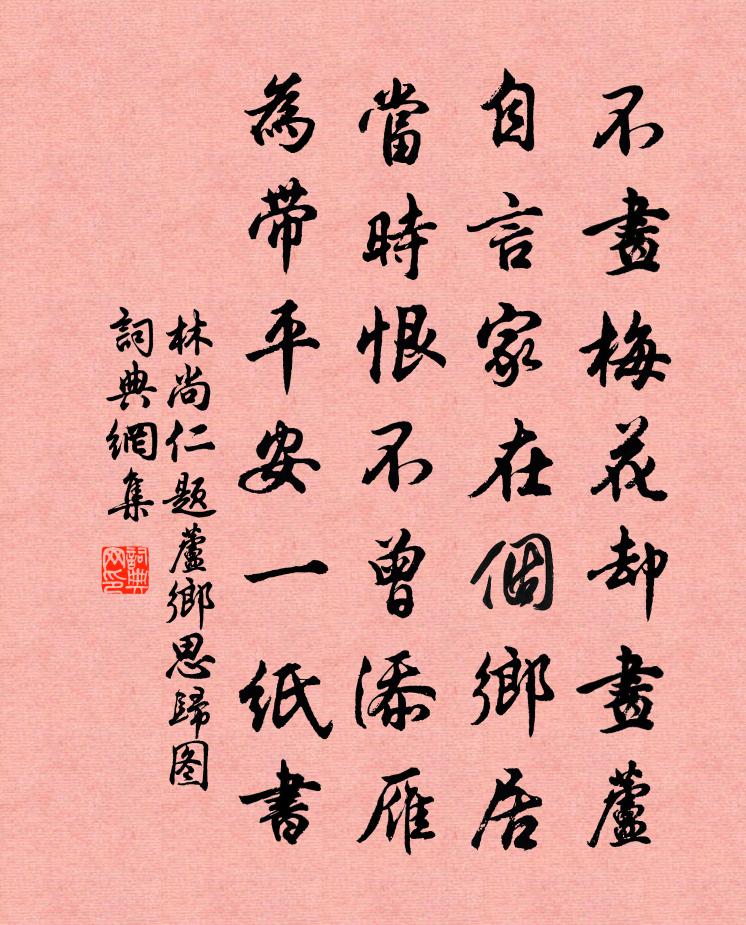 詩詞名句歷史字典書法欣賞書法字典國語詞典說文解字康熙字典古漢語字典標 題 作 者 詩 句 題蘆鄉思歸圖作者:林尚仁 朝代:宋代題蘆鄉思歸圖原文不畫梅花卻畫蘆,自言家在個鄉居。當時恨不曾添雁,為帶平安一紙書。詩詞問答問:題蘆鄉思歸圖的作者是誰?答:林尚仁問:題蘆鄉思歸圖寫於哪個朝代?答:宋代林尚仁題蘆鄉思歸圖書法欣賞題蘆鄉思歸圖書法作品詩詞推薦罪所留系,每夜聞長洲軍笛聲劉長卿〔唐代〕白日浮雲閉不開,黃沙誰問冶長猜。只憐橫笛關山月,知處愁人夜夜來。樂府雜曲。鼓吹曲辭。巫山高劉方平〔唐代〕楚國巫山秀,清猿日夜啼。萬重春樹合,十二碧峰齊。峽出朝雲下,江來暮雨西。陽台歸路直,不畏向家迷。夜來聞曾性之丘君就二友隔樓吟聲不絕以詩柬胡仲參〔宋代〕月下歸來深閉門,衾寒時倩博山溫。隔樓忽聽吟聲苦,引得清愁入夢魂。挽王夫人王柏〔宋代〕連山之岡兮,秋風肅肅。有永千古兮,幽宮迢迢。一編之女訓兮,慨遺音之寂寥。藹清芬其如在兮,鞶帨彯彯。忍和馬大夫闢佛五首胡宏〔宋代〕諸子隨流本既分,西天更有一般僧。高談性命稱仁者,支遁悠悠莫可憑。游宋衡送示登明錄詩卷次韻並呈同賦諸公趙蕃〔宋代〕赤氣排空勢且然,簿書何急又堆前。忽來疏雨微雲句,置以清冰寒露邊。想見坐中皆玉雪,更知眼界足風煙。雖然臨江仙(縣圃種花)劉克莊〔宋代〕落魄長官江海客,少豪萬里尋春。而今樵悴向溪濱。斷無觴詠興,惟有簿書塵。手插海棠三百本,等閒妝點芳辰。李鄠縣丈人胡馬行杜甫〔唐代〕丈人駿馬名胡騮,前年避胡過金牛。回鞭卻走見天子,朝飲漢水暮靈州。自矜胡騮奇絕代,乘出千人萬人愛。一聞秦王纜船石楊蟠〔宋代〕色陰長帶雨,疑是白雲根。欲問東巡事,今猶不敢言。元日示宗武杜甫〔唐代〕汝啼吾手戰,吾笑汝身長。處處逢正月,迢迢滯遠方。飄零還柏酒,衰病只藜床。訓喻青衿子,名慚白首郎。賦詩月中仙王哲〔元代〕遭遇中秋,近初更氣爽,風定雲散。虛空露降,闡萬里晴天,顯青玉案。舉頭瞻海岸,湧出金盤爛爛。不特門門煥失調名佚名〔宋代〕西風漸冷,園林萬木凋黃。虞美人·韶華爭肯偎人董士錫〔清代〕韶華爭肯偎人住?已是滔滔去。西風無賴過江來,歷盡千山萬水幾時回? 秋聲帶葉蕭蕭落,莫響城頭角!浮曾公岩劉宗傑〔宋代〕謝公高興在東山,尋得仙岩郡邑邊。萬果連峰凝碧乳,一溪鳴玉逗寒泉。由來物外無塵景,須信壺中有洞天。嶺服三月十二日晚雨因取淵明詩微雨洗高林清飈矯滕岑〔宋代〕風吹飛絮亂,日照遊絲高。晴景方可愛,暮雨忽瀟瀟。老人蚤睡眠,夢覺雞戒朝。檐聲鳴階除,雲氣冒山椒。依韻和達觀禪師山中見寄梅堯臣〔宋代〕豶豕在塗龍在澤,豺狼食肉麝食柏。蹄毛與角不對齒,啄觜兩足副以翮。既能閒閒住深谷,豈使于于佩鳴玉。水邊和雙溪曹勛〔宋代〕常憶雙溪老,伽陀日益多。津梁今坐斷,風月奈君何。清梵山藏路,南薰歸滿柯。何時話暌闊,芒屨入雲蘿。送從叔重赴海南從事馬戴〔唐代〕又從連帥請,還作嶺南行。窮海何時到,孤帆累月程。亂蟬吟暮色,哀狖落秋聲。晚路潮波起,寒葭霧雨聲。沙埋送劉虛白二首歐陽修〔宋代〕秘訣誰傳妙若神,能將題品◇朝紳。因言禍福兼忠孝,吾愛君平善誨人。五更出舍郎王哲〔元代〕二更哩出舍郎。變銀霜。湯燒火,火燒湯。夫婦二人齊下拜,住丹房。同眠宿,臥牙床。名句推薦橫笛驚征雁,嬌歌落塞雲。岑參《奉陪封大夫九日登高》 萬里鄉為夢,三邊月作愁。岑參《送人赴安西》 水流濕,火就燥。雲從龍,風從虎。佚名《易傳·文言傳·乾文言》 攻人之惡毋太嚴,要思其堪受;教人以善毋過高,當使其可從。洪應明《菜根譚·概論》 蓮渚收香,蘭皋浮爽,涼思頓欺班扇。王月山《齊天樂·夜來疏雨鳴金井》 翠娥執手送臨歧,軋軋開朱戶柳永《採蓮令·月華收》 重足而立,側目而視。司馬遷《史記·汲鄭列傳》 城頭鐵鼓聲猶震,匣里金刀血未乾。王昌齡《出塞二首》 易醉扶頭酒,難逢敵手棋。賀鑄《南歌子·疏雨池塘見》 藥醫不死病,死病無藥醫。張南莊《何典·第三回》
