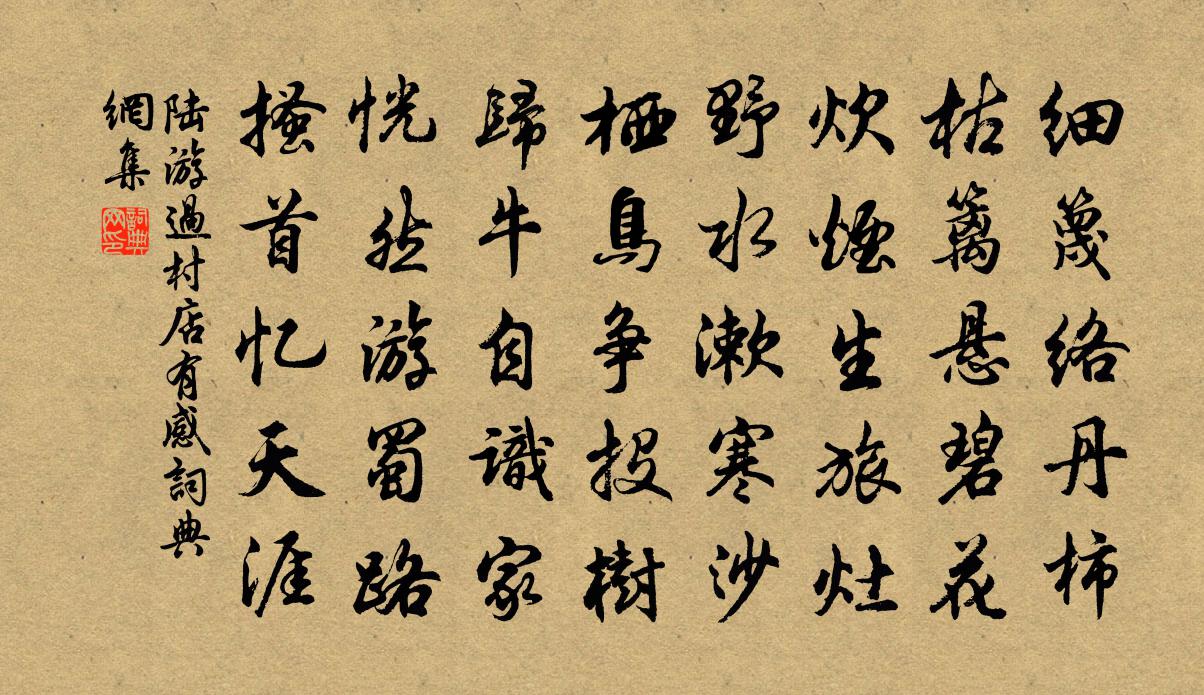 細篾絡丹柿,枯籬懸碧花。炊煙生旅灶,野水漱寒沙。