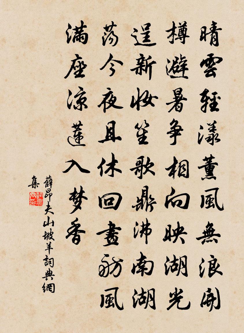 詩詞名句歷史字典書法欣賞書法字典國語詞典說文解字康熙字典古漢語字典標 題 作 者 詩 句 山坡羊作者:薛昂夫 朝代:元代山坡羊原文晴雲輕漾,薰風無浪,開樽避暑爭相向。映湖光,逞新妝,笙歌鼎沸南湖盪,今夜且休回畫舫。風,滿座涼;蓮,入夢香。詩詞問答問:山坡羊的作者是誰?答:薛昂夫問:山坡羊寫於哪個朝代?答:元代問:山坡羊是什麼體裁?答:散曲薛昂夫山坡羊書法欣賞山坡羊書法作品詩詞推薦偈頌三十六首釋如珙〔宋代〕三世如來說妙義,炎炎火燄雪火飛。面前總是聽法底,識取當頭底是誰。宋正紀輓詞二首郭印〔宋代〕振羽曾參上國鴻,偶飛不到廣寒宮。詩書教子心尤切,孝友承家德自豐。一命未酬耽學志,半途何負攝生功。新阡答李希淳屯田三首邵雍〔宋代〕去歲嘗蒙遠寄詩,當時已嘆友朋希。如今存者殆非半,不縱歡游待幾時。鹿鳴燕陳造〔宋代〕亂山森立圍古房,重碧疊青天與長。鍾奇孕秀為雋良,有如六子爭軒昂。胸次襞積雲錦章,漢之晁董唐常楊。當日盆中石菖蒲張九成〔宋代〕清姿水石間,相得不可無。如人飽道義,其色長敷腴。不受塵土覆,自與人世殊。我何愛軒冕,冒昧名利塗。聖人答常學士李夢符〔唐代〕罷修儒業罷修真,養拙藏愚春復春。到老不疏林里鹿,平生難見日邊人。洞桃深處千林錦,岩雪鋪時萬草新。深謝長洲覽古徐凝〔唐代〕吳王上國長洲奢,翠黛寒江一道斜。傷見摧殘舊宮樹,美人曾插九枝花。句楊諤〔宋代〕顧前明主席,一間洛陽人。送吳促庶待制出守長沙王珪〔唐代〕畫船催鼓送將行,一醉離觴下玉京。延閣漏間空紫橐,洞庭波起獵紅旌。曾冠獬廌奸回讋,卻佩龍泉種落驚。莫向送魏秘書赴召崔與之〔宋代〕國論參稽定,人材護養成。古來同此恨,老去向誰傾。太白雲猶溼,瞿塘水正生。掛帆乾斗極,屬耳鳳凰鳴。程待制輓詩虞儔〔宋代〕科第聯三世,聲名動九垓。激昂存壯志,盤錯見奇才。往者分邊閫,胡然避憲台。教忠知有待,餘慶接三台。寄南昌故人黃存之宋謙甫二首戴復古〔宋代〕謙甫多才思,存之重誼襟。一書愁話別,千里夢相尋。南浦扁舟上,東湖萬柳陰。舊時行樂處,何事不關心。海棠崔鶠〔宋代〕渾是華清出浴初,碧綃斜掩見紅膚。便教桃李能言語,要比嬌妍比得無。謝潔齋惠爐瓶馬廷鸞〔宋代〕宴坐渾如槁木枝,罏煙瓶蕊小窗宜。書慵捲起閒今古,回向心源不動時。謝潘閬寄惠白雞魏野〔宋代〕遠惠雞同雪,應圖警臥雲。如君鳴有信,似我素無文。映樹迷蟾彩,臨流雜鷺群。朝昏可所恨,不共隔籬聞。水龍吟 雪次韻吳存〔元代〕一天雲似穹廬,山川慘澹還非舊。興來欲喚,贏童瘦馬,尋梅隴首。有客遮留,左援蘇二,右招歐九。問聚星堂上江上王令〔宋代〕浩渺煙波不可名,我來閒自渥塵纓。久思滄海收身去,安得長舟破浪行。天闊水雲連黯淡,日閒鷗鷺自飛鳴。屈平元日司空圖〔唐代〕甲子今重數,生涯只自憐。殷勤元日日,欹午又明年。贈吳氏甥二首袁燮〔宋代〕農夫力耕耘,歲功必倍疏。吾儒用心苦,學業亦有秋。聖賢有遺訓,好古敏以求。韋編至三絕,發憤窮深幽。寢食送新除國博徐員外知婺州徐鉉〔唐代〕憐君盡室泛安流,職重官新未白頭。楚老歡迎歸舊里,春風留戀過揚州。逢時肯更嗟庭樹,屬詠還應上郡樓。宗黨名句推薦竹里繰絲挑網車,青蟬獨噪日光斜。李賀《南園十三首》 秋風別蘇武,寒水送荊軻。庾信《擬詠懷二十七首·其二十六》 搜句忌於顛倒,裁章貴於順序劉勰《文心雕龍·章句》 花枝出建章,鳳管發昭陽。皇甫冉《婕妤怨》 野橋古梅獨臥寒屋角,疏影橫斜暗上書窗敲。明本《九字梅花詠》 天仙碧玉瓊瑤,點點揚花,片片鵝毛。薛昂夫《蟾宮曲·雪》 況是清明好天氣,不妨游衍莫忘歸。程顥《郊行即事》 庶人莫與官爭,貴人不結人怨。來俊臣《羅織經·保身卷第七》 驚風飄白日,忽然歸西山曹植《贈徐幹詩》 江上小堂巢翡翠,苑邊高冢臥麒麟。杜甫《曲江二首》