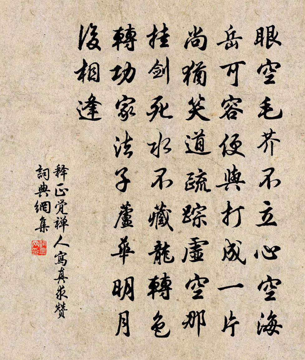 詩詞名句歷史字典書法欣賞書法字典國語詞典說文解字康熙字典古漢語字典標 題 作 者 詩 句 禪人寫真求贊作者:釋正覺 朝代:宋代禪人寫真求贊原文眼空毛芥不立,心空海岳可容。便與打成一片,尚猶笑道疏蹤。虛空那掛劍,死水不藏龍。轉色轉功家法子,蘆華明月後相逢。詩詞問答問:禪人寫真求贊的作者是誰?答:釋正覺問:禪人寫真求贊寫於哪個朝代?答:宋代釋正覺禪人寫真求贊書法欣賞禪人寫真求贊書法作品詩詞推薦昭君怨 江行王寂〔元代〕一曲清江環碧。兩岸蕭蕭蘆荻。煙雨暗西山。有無間。有酒須當痛飲。百歲黃梁一枕。瞰莫放愁閒。上眉端。偶成晁公溯〔宋代〕深深小合夜籠香,日上珠簾逗曉光。為喚蜀帷春睡起,翠盆添水試新妝。霅溪夜宴詩(霅溪神歌)水神〔唐代〕山勢縈迴水脈分,水光山色翠連雲。四時盡入詩人詠,役殺吳興柳使君。題臘藥梅堯臣〔宋代〕頹顏早覺衰,乃藉藥扶持。及此季冬日,預修來歲宜。鼎成無犬見,蜜煉有蜂知。借問月中兔,長年何所為。青玉案沈端節〔宋代〕使君標韻如徐庾。更名節、高千古。臥治姑溪才小駐。閒雲無定,陽春有腳,又作南昌去。興來亭上清歌度。盡能題君山愛松軒李呂〔宋代〕青青窗外松,高下如羽蓋。不論霜雪晨,屹立風雨外。深根養茯苓,千歲坐可待。世情苦炎涼,一日幾變態。此物和蒲泰亨四首黃庭堅〔宋代〕我已人間無所用,鬢飄霜雪眼生花。東坡兄弟來雖晚,折箭堪除蝕月蛙。送子威兄鈐兵池陽曹勛〔宋代〕伊昔侍伯父,一官尉池陽。時年方九齡,讀書未知方。於今涉五紀,皤然鬚鬚霜。茲喜伯兄官,鈐兵總戎行。素風自嘆虞儔〔宋代〕明經青史不難收,怪底依然處士裘。誰謂封侯安事筆,我聞定霸必焚舟。驥騰夷路須聯轡,鰲負三山好擲鉤。對策贈薛瑤英賈至〔唐代〕舞怯銖衣重,笑疑桃臉開。方知漢成帝,虛築避風台。正陽驛舍夢鄭并州寄書開之即三山圖也梅堯臣〔宋代〕我來清淮側,夢得鄭公書。開書一把玩,乃是三山圖。山形雄且邃,筆畫簡而疏。紙幅不盈尺,萬仞勢有餘。卷置喜友至留宿白居易〔唐代〕村中少賓客,柴門多不開。忽聞車馬至,雲是故人來。況值風雨夕,愁心正悠哉。願君且同宿,盡此手中杯。人生奉和永豐殿下言志詩 六庾信〔南北朝〕興雲榆莢晚。燒薙杏花初。滮池侵黍稷。谷水播菑畬。六月蟬鳴稻。千金龍骨渠。含風搖古度。防露動林於。予客三池王正卿以四絕見寄姿其韻李流謙〔宋代〕我來在處說君名,小軸人爭睹鳳星。放卻他時能致此,定知阮眼為君青。寄江上人賈島〔唐代〕紫閣舊房在,新家中嶽東。煙波千里隔,訊息一朝通。寒日汀洲路,秋晴島嶼風。分明杜陵葉,別後兩經紅。陪尚書游中財夜大風雨尚書及任卿史石泉皆耆程公許〔宋代〕中在台殿倚竛竮,憶昨深登六歲零。霧鎖岩扉須玉鑰,雲扶革履上青冥。三峰靜對龐眉秀,雙璧驚回醉眼醒。風雨魏夫人壇黃庭堅〔宋代〕獨掃蛾眉作遠山,春風瑤草照朱顏。我來欲問許玉斧,二十四峰如髻鬟。周希父見寄次韻林季仲〔宋代〕松菊荒三徑,風塵走十年。家山憶到骨,世路厭摩肩。懶計詩工拙,寧分酒聖賢。從他誚便腹,老去只貪眠。無題一首劉克莊〔宋代〕死以子托友,病將身付醫。友今多市道,醫或似屠兒。景福殿前柏王安石〔宋代〕香葉由來耐歲寒,幾經真賞駐鳴鑾。根通御水龍應蟄,枝觸宮雲鶴更盤。怪石誤蒙三品號,老松先得大夫官。知君名句推薦有理言自壯,負屈聲必高。馮夢龍《警世通言·卷十五》 吏呼一何怒,婦啼一何苦。杜甫《石壕吏》 知我者,謂我心憂;不知我者,謂我何求。佚名《黍離》 雲鬟綠鬢罷梳結,愁如回飆亂白雪。李白《久別離》 上有愁思婦,悲嘆有餘哀。曹植《明月上高樓》 十年種木,一年種穀,都付兒童。元好問《人月圓·重岡已隔紅塵斷》 伏雨朝寒愁不勝,那能還傍杏花行。納蘭性德《浣溪沙·伏雨朝寒愁不勝》 吾言甚易知,甚易行。天下莫能知,莫能行。老子《老子·德經·第七十章》 當時父母念,今日爾應知。白居易《燕詩示劉叟》 知古不知今,謂之陸沉,然則儒生,所謂陸沉者也。王充《論衡·卷十二·謝短篇》