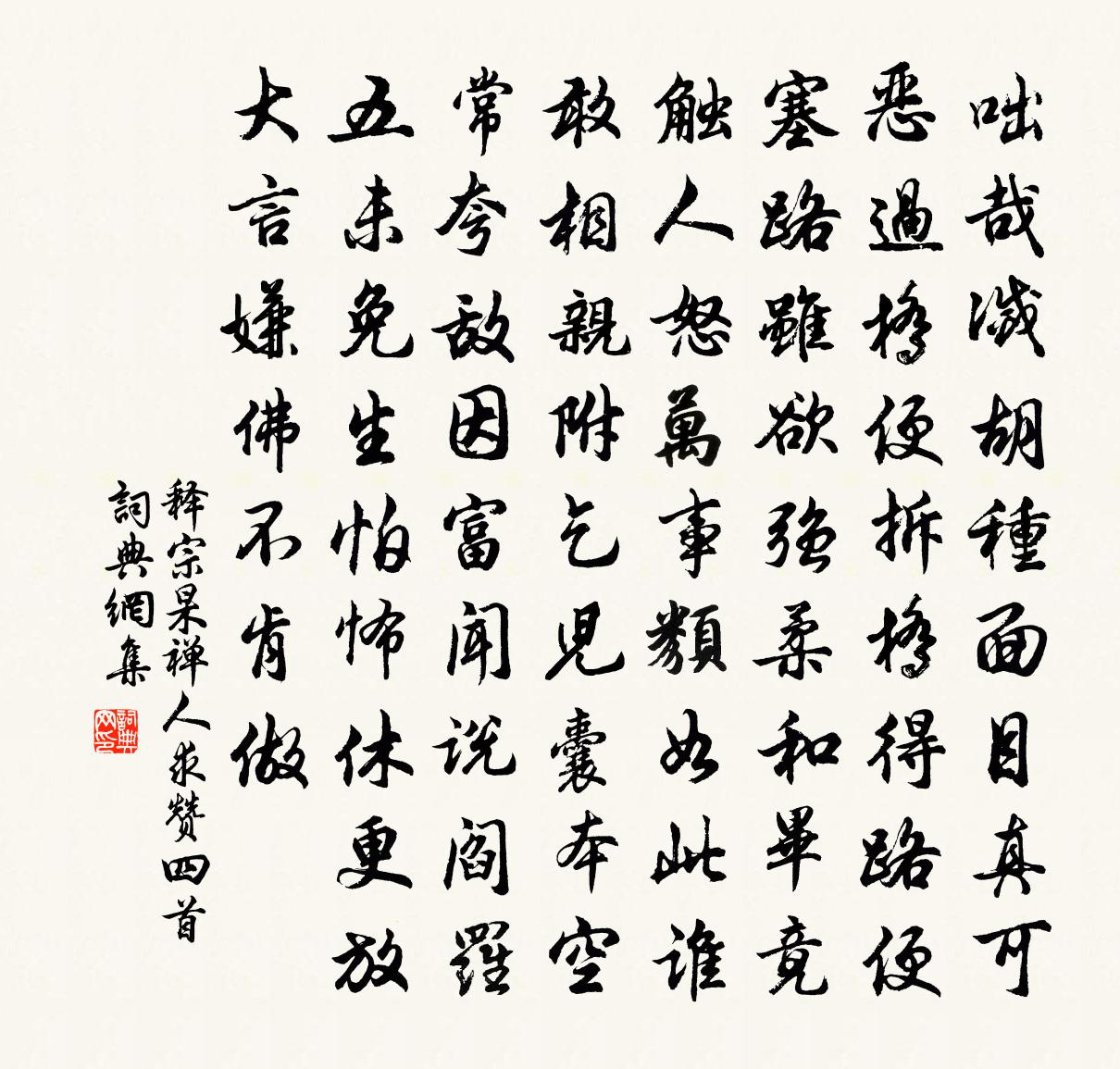 詩詞名句歷史字典書法欣賞書法字典國語詞典說文解字康熙字典古漢語字典標 題 作 者 詩 句 禪人求贊四首作者:釋宗杲 朝代:宋代禪人求贊四首原文咄哉滅胡種,面目真可惡。過橋便拆橋,得路便塞路。雖欲強柔和,畢竟觸人怒。萬事類如此,誰敢相親附。乞兒囊本空,常夸敵因富。聞說閻羅五,未免生怕怖。休更放大言,嫌佛不肯做。詩詞問答問:禪人求贊四首的作者是誰?答:釋宗杲問:禪人求贊四首寫於哪個朝代?答:宋代釋宗杲禪人求贊四首書法欣賞禪人求贊四首書法作品詩詞推薦和詩送茶寄孫之翰蔡襄〔宋代〕北苑靈芽天下精,要須寒過入春生。故人偏愛雲腴白,佳句遙傳玉律清。衰病萬緣皆絕慮,甘香一味未忘情。封題通判國博中齋詩強至〔宋代〕天下以中為大本,天地得中能自生。古之聖賢一用中,政刑禮樂萬事平。於戲後世中道喪,政分寬猛刑重輕。禮非讀正觀政要楊萬里〔宋代〕拔士新豐逆旅中,懷賢鴨綠水波東。酒頃一斗鳶肩客,醋設三杯羊鼻公。新年作劉長卿〔唐代〕鄉心新歲切,天畔獨潸然。老至居人下,春歸在客先。嶺猿同旦暮,江柳共風煙。已似長沙傅,從今又幾年。題畫九首唐寅〔明代〕煙水雲山天地寬,盡容樵斧與漁竿。麒麟閣上丹青筆,要畫須看得見難。悼阿駒七首劉克莊〔宋代〕隔日猶能喚女兄,兒於孝友殆天成。直須見汝蓮花上,才得胸中一點平。聽航船歌十首方回〔宋代〕家住斜塘大戶邊,時荒米貴欠他錢。從此駕船歸不得,無錢且駕小航船。送元厚之資政致仕歸蘇州曾鞏〔宋代〕笑指家園是五湖,畫船東下載圖書。收功玉鉉丹青後,得老銅樓羽翼初。醒醉放懷從野服,登臨乘興屬安車。都門偈五首釋子淳〔宋代〕乾坤之內,宇宙這間,中有一寶,秘在形山。兼考遂寧補試鎖宿在學戲題一絕度正〔宋代〕壯士縛雞聊爾耳,小兒相鼎竟何如。眼前萬事不堪說,惟有秋風解得渠。早朝司空圖〔唐代〕白日新年好,青春上國多。街平雙闕近,塵起五雲和。廬山桑落洲胡玢〔唐代〕莫問桑田事,但看桑落洲。數家新住處,昔日大江流。古岸崩欲盡,平沙長未休。想應百年後,人世更悠悠。感事吟邵雍〔宋代〕為善大宜量力分,知幾都在近人情。人情盡後疑難人,力分量時事自平。酴醾四首劉子翬〔宋代〕蒙籠春幰頂,夭矯赤虬身。雨蓓猶緘暖,精神照晚春。行役有嘆二首楊萬里〔宋代〕百年幾暄涼,再歲三征行。卻羨路旁叟,白首不到城。人生如風花,去來能與爭。且隨風吹起,會當風自停。讌集宋祁〔宋代〕素節倐已宴,高風送浮涼。拂席進賓客,釃酒羅壺觴。黃鷄跖跖美,紫蟹螯螯香。莫矜來歡早,須念後戚長。奔川長相思佚名〔宋代〕花滿枝。柳滿枝。眼底春光似舊時。燕歸人未歸。淚沾衣。酒沾衣。煩惱長多歡事稀。此情風月知。梅花劉子翬〔宋代〕玉骨綃裳韻太孤,天教飛雪伴清癯,林寒疏蕊半開落,野迥暗香疑有無。庾嶺風光仍似舊,漢宮鉛粉莫相污。驚心頌釋智同〔宋代〕雲門透法身,法身何許人。雁回沙塞北,鸚鵡慕西秦。蜀城哭台州樂安少府蘇頲〔唐代〕遠遊躋劍閣,長想屬天台。萬里隔三載,此邦余重來。音容曠不睹,夢寐殊悠哉。邊郡饒藉藉,晚庭正回回。喜傳名句推薦何處是歸程?長亭連短亭。李白《菩薩蠻·平林漠漠煙如織》 箭徑酸風射眼,膩水染花腥。吳文英《八聲甘州·靈岩陪庾幕諸公游》 淚濕羅衣脂粉滿。四疊陽關,唱到千千遍。李清照《蝶戀花·淚濕羅衣脂粉滿》 善學者盡其理,善行者究其難。荀子《荀子·大略》 對秋深,離恨苦,數夜滿庭風雨。孫光憲《更漏子·對秋深》 總把春山掃眉黛,不知供得幾多愁?李商隱《代贈二首》 不知何日始工愁。記取那回花下一低頭。王國維《虞美人·弄梅騎竹嬉遊日》 閒夢江南梅熟日,夜船吹笛雨蕭蕭。皇甫松《夢江南·蘭燼落》 去好去惡,臣乃見素;去舊去智,臣乃自備。韓非及後人《韓非子·主道》 小童疑是有村客,急向柴門去卻關。崔道融《溪居即事》