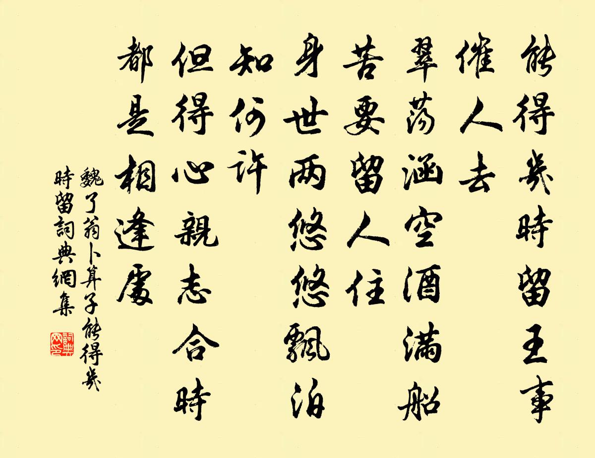 詩詞名句歷史字典書法欣賞書法字典國語詞典說文解字康熙字典古漢語字典標 題 作 者 詩 句 卜運算元·能得幾時留作者:魏了翁 朝代:宋代卜運算元·能得幾時留原文能得幾時留,王事催人去。翠盪涵空酒滿船,苦要留人住。身世兩悠悠,飄泊知何許。但得心親志合時,都是相逢處。詩詞問答問:卜運算元·能得幾時留的作者是誰?答:魏了翁問:卜運算元·能得幾時留寫於哪個朝代?答:宋代問:卜運算元·能得幾時留是什麼體裁?答:詞魏了翁卜運算元·能得幾時留書法欣賞卜運算元·能得幾時留書法作品詩詞推薦候仙亭即事顧逢〔宋代〕一峰飛到此,勝景幻幽林。蒼徑望不盡,白雲行漸深。鐘聲傳日午,笠影卸松陰。候得神仙否,神仙不可尋。試院二首王阮〔宋代〕老催人才彌滄浪,十幅輕帆便可張。尚有選材王事在,夜深來此校文章。華亭吳江道中偶作十絕朱長文〔唐代〕賢哲多為貴勢拘,人人空道愛江湖。誰將五鼎盈前食,肯換秋風一箸鱸。六言雜興陸游〔宋代〕失馬詎知非福,亡羊不妨補牢。病里正須周易,醉中卻要離騷。木蘭花慢佚名〔宋代〕臘前冬至後,報春意、動南坡。見葭管浮灰,梅英綴玉,漏泄陽和。階蓂呈瑞五葉,祥開崧岳聳嵯峨。笑擁兩行珠句張釜〔宋代〕我今客氣渾消盡。雪寒取酒司馬光〔宋代〕雪意久未就,寒雲低不收。飄揚插孤幟,迢遞映高樓。試假賢人濁,聊攻客子愁。呼僮攜小榼,更淮黑貂裘。和任師見寄之韻辛棄疾〔宋代〕幾年魂夢隔高門,嘆息潭間闕異聞。剩喜風情筋力在,尚能詩似鮑參軍。菊花徐介軒〔宋代〕獨向鄰園看菊回,隔籬驚見一枝梅。西風憐我太寂寞,特地遣花將句來。中秋無月范成大〔宋代〕兒女無悰坐客稀,今年孤負隔年期。誰從天上牢遮月,不管人間大欠詩。次韻蘇主管青溪十絕句項安世〔宋代〕與君相別若耶溪,十載湘航與蜀梯。恰到六朝行樂處,台城東畔冶亭西。柳梢青張履信〔宋代〕雨歇桃繁,風微柳靜,日淡湖灣。寒食清明,雖然過了,未覺春閒。行雲掩映春山。真水墨、山 * 間。燕語侵愁竹殷堯藩〔唐代〕窗戶盡蕭森,空階凝碧陰。不緣冰雪裡,為識歲寒心。四月晦日小雨陸游〔宋代〕霏霏亂點暗朝光,蔌蔌奇聲渡野塘。一浦未輸新漲綠,四郊聊壓旱塵黃。風生團扇清無暑,衣覆熏籠潤有香。竹屋龍湖歸丘葵〔宋代〕策蹇下玉崗,東風忽吹晴。不暖亦不寒,夜氣覺自清。書生澹無事,復戀舊短檠。開卷見聖賢,愧我猶編氓。便思十六日夜邀二劉饒錢同成父飲趙蕃〔宋代〕籍甚中秋月,飄然四海兄。詩兼淡仍泊,酒任濁還清。柳映蕭蕭影,灘聞活活聲。明年當此夕,擊柝政重城。烏息隱山堂覓詩洪咨夔〔宋代〕未出為遠志,出則為小草。請看耆闍窟,幾年黃面老。柳州陶弼〔宋代〕唐室衣冠四百秋,元和台省盡名流。誰人肯為交朋死,乞以羅池換播州。送葛謙問運乾周必大〔宋代〕少年扶犁事西疇,老隌英游帝王州。才高韻勝各有得,志合情親君更優。離筵忽席洛定鼎,戌期雲異齊葵丘。君行偶成裘萬頃〔宋代〕松徑煩風掃,柴門為雨扃。行攜道院集,坐對敬齋銘。好事心常記,閒談耳不聽。觀空為時悞,無異醉初醒。名句推薦客有哀時失職而聽者,淚淋浪以沾襟。李白《幽澗泉》 以陽求陰,苞以德也;以陰結陽,施以力也。王詡《鬼谷子·捭闔》 有桃花紅,李花白,菜花黃。秦觀《行香子·樹繞村莊》 海闊山遙,未知何處是瀟湘柳永《玉蝴蝶·望處雨收雲斷》 鶯啼燕語報新年,馬邑龍堆路幾千。皇甫冉《春思》 紅橋路,正一派、畫船蕭鼓中流住。納蘭性德《摸魚兒·午日雨眺》 記得舊時,探梅時節。老來舊事無人說。呂本中《踏莎行·雪似梅花》 清愁滿眼共誰論。卻應台下草,不解憶王孫。李之儀《臨江仙·登凌歊台感懷》 菩薩妖精,總是一念。若論本來,皆屬無有。吳承恩《西遊記·第十七回》 遺民淚盡胡塵里,南望王師又一年。陸游《秋夜將曉出籬門迎涼有感》