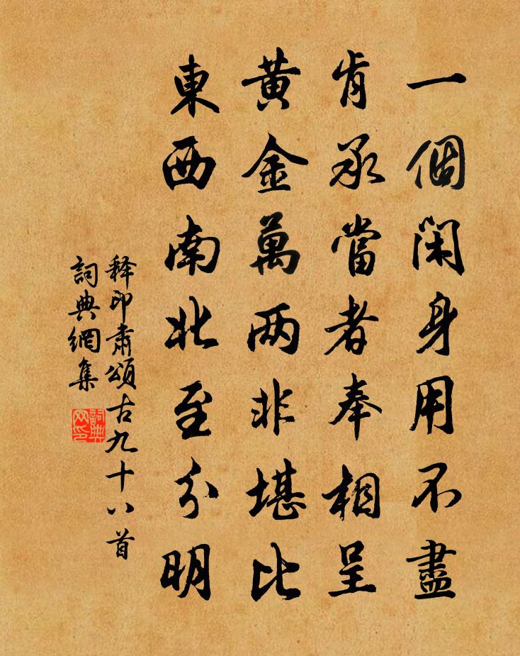 詩詞名句歷史字典書法欣賞書法字典國語詞典說文解字康熙字典古漢語字典標 題 作 者 詩 句 頌古九十八首作者:釋印肅 朝代:宋代頌古九十八首原文一個閒身用不盡,肯承當者奉相呈。黃金萬兩非堪比,東西南北至分明。詩詞問答問:頌古九十八首的作者是誰?答:釋印肅問:頌古九十八首寫於哪個朝代?答:宋代釋印肅頌古九十八首書法欣賞頌古九十八首書法作品詩詞推薦和南安余宰題翠陰亭致爽軒二首黃公度〔宋代〕溪光山色兩幽深,更結新亭倚翠林。老木參天煙漠漠,虛檐掛日影沉沉。三年此地留喬舄,六月涼風颯楚襟。趁取雜劇·崔鶯鶯待月西廂記·崔鶯鶯夜聽琴(第二本)王實甫〔元代〕第一折(孫飛虎上,開)自家姓孫,名彪,字飛虎。方今天下擾攘。因主將丁文雅失政,俺分統五千人馬,鎮守河龍瑞宮蘇泂〔宋代〕嶂密峰圓不似山,桃花流水做春閒。神仙只在人間世,妄意虛無縹緲間。送參議李器之喻良能〔宋代〕人間今北海,天上謫仙人。雄論堪醫國,新詩可泣神。搖毫雲落紙,揮麈坐生春。芸閣登吟慣,綾衾入直頻。三十觀張中樂書大字梅堯臣〔宋代〕芝旭馳名世有孫,大書如曉過秋原。長松怪柏皆成炭,豫氏觀傍不解吞。汩羅廟趙希鄂〔宋代〕懷沙一死固堪傷,千載修名實未亡。舉國無人君不悟,斯文有幸日爭光。讒言枉以艾蕭惡,正論終歸蘭芷香。解印簡蔡天任吳則禮〔宋代〕天公與此強健身,故遣雨洗南徐春。梅柳暮年經老眼,江湖疇昔著覉臣。要穿遙集腳底屐,不負淵明頭上巾。頗欲庵中睡起五頌寄海印長老韓維〔宋代〕飯後西堂百步行,困來合眼是無營。從生至老非他物,道著如今已是情。赴長洲縣作王禹偁〔宋代〕移任長洲縣,辭親淚滿衣。折腰雖未免,搔首欲何歸。曉白霜華重,晴紅栗葉飛。江頭鷗鳥在,應怪不忘機。題鬼門關陶弼〔宋代〕朝過鬼門關,虎跡印玄室。暮過鬼門關,猿聲嘯蒼壁。朝暮悲行人,森然增慘栗。駐馬看飛雲,蠻煙不見日。回首【越調】寨兒令_憶別花見羞張可久〔元代〕憶別花見羞,淚凝眸,別時語言不應日。柳下秦謳,馬上吳鉤,何處寄風流?五湖范蠡漁舟,西風季子貂裘,青鸞玉樓春歐陽修〔宋代〕池塘水綠春微暖。記得玉真初見面。從頭歌韻響錚鏦,入破舞腰紅亂旋。玉鉤簾下香階畔。醉後不知紅日晚。當時寄編修龔郎中陳郁〔宋代〕說著池陽舊歲時,星郎事業世皆知,淮人自在於堪用,天下如今尚可為。江南烽高黃塞近,街頭箭急赤囊馳。多應和孔教授武仲濟南四詠其一環波亭蘇轍〔宋代〕南山迤邐入南塘,北渚迢嶢枕北牆。過盡綠荷橋斷處,忽逢朱檻水中央。鳧鷖聚散湖光淨,魚鱉浮沉瓦影涼。清境傷歌行(元和中,楊憑貶臨賀尉)張籍〔唐代〕黃門詔下促收捕,京兆尹系御史府。出門無復部曲隨,親戚相逢不容語。辭成謫尉南海州,受命不得須臾留。身著滿庭芳 贈辛五翁姜四翁馬鈺〔元代〕豪富過人,作為異眾,萊陽姜鑒辛通。文登趁醮,不憚冒霜風。來往近乎千里,投壇告、馬鈺姜公。持孝道,宰公煙雨樓唐天麟〔宋代〕百尺樓高尺賞心,我來猶記舊登臨。四時天色有晴雨,一片湖光無古今。遠塔連雲知寺隱,小舟穿柳覺村深。憑闌二十七日復有旨除帥江西一旬之間兩奉除音再岳珂〔宋代〕披腹忱詞久未呈,浹旬兩詔下宸京。老臣何路通忱悃,聖主無私燭物情。鶴隴未渝耕隴志,牛衣空換錦衣榮。九重詠史詩夷陵胡曾〔唐代〕夷陵城闕倚朝雲,戰敗秦師縱火焚。何事三千珠履客,不能西御武安君。雲杜牧〔唐代〕東西那有礙,出處豈虛心。曉入洞庭闊,暮歸巫峽深。渡江隨鳥影,擁樹隔猿吟。莫隱高唐去,枯苗待作霖。名句推薦寧可濕衣,不可亂步李汝珍《鏡花緣·第二十回》 白雪關山遠,黃雲海戍迷。李白《紫騮馬》 眾人助之以力,近者結之以成,遠者譽之以名,尊者載之以勢。韓非及後人《韓非子·功名》 瞿塘嘈嘈十二灘,此中道路古來難。劉禹錫《竹枝詞九首·其七》 舊相思、偏供閒晝。吳文英《夜遊宮·春語鶯迷翠柳》 天上若無修月戶,桂枝撐損向西輪。米芾《中秋登樓望月》 曉鏡但愁雲鬢改,夜吟應覺月光寒。李商隱《無題·相見時難別亦難》 昔我往矣,楊柳依依。佚名《採薇》 紅豆不堪看,滿眼相思淚。牛希濟《生查子·新月曲如眉》 芳菲歇。故園目斷傷心切。向子諲《秦樓月·芳菲歇》
