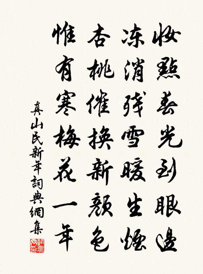 詩詞名句歷史字典書法欣賞書法字典國語詞典說文解字康熙字典古漢語字典標 題 作 者 詩 句 新年作者:真山民 朝代:宋代新年原文妝點春光到眼邊,凍消殘雪暖生煙。杏桃催換新顏色,惟有寒梅花一年。詩詞問答問:新年的作者是誰?答:真山民問:新年寫於哪個朝代?答:宋代真山民新年書法欣賞新年書法作品詩詞推薦夜歸舟中作陸游〔宋代〕意薄楊修喚小兒,孤舟自笑發成絲。放開痴腹無非夢,拈起幽懷總是詩。霜下忽驚桐葉盡,灘生更覺水聲奇。餘年天池燈洪咨夔〔宋代〕山谷人家避李成,誰知劫數莫逃兵。至今鬼燐青無數,認作文殊佛火明。寄獻王中丞強至〔宋代〕近侍才俱傑,明公望獨尊。紀綱新獻府,德業舊王門。禮樂陪朱邸,文章落紫垣。訓辭含鼓動,氣概獨飛騫。厭直懷子仁師釋智圓〔宋代〕寥寥塵跡遠,禪外動閒思。水國人歸後,秋軒月白時。鳴蛩藏壞壁,幽鳥立寒枝。獨坐誰相問,微吟鑷病髭。永遇樂(客答梅)佚名〔宋代〕玉骨冰肌,野牆山徑,煙雨蕭索。公子豪華,貪紅戀紫,誰分憐孤萼。想應窺見,潘 * 似,故把素懷相托。豈知春遊遇雨樓鑰〔宋代〕公子喜青春,歡迎弗厭頻。久晴都不問,好雨卻成嗔。桃杏紅方入,禾苗綠未勻。請君停杖履,俯念耦耕人。前之十首次詩釋行海〔宋代〕十五遊方今五十,駸駸白盡少年頭。看來造物真兒戲,憶著平生冷汗流。宇宙何須三兔窟,山川總是一菟裘。眼前不二門白居易〔唐代〕兩眼日將暗,四肢漸衰瘦。束帶剩昔圍,穿衣妨寬袖。流年似江水,奔注無昏晝。志氣與形骸,安得長依舊。亦曾次仲舅韻寄拙庵樓鑰〔宋代〕明月堂前玉幾山,倦遊雙徑卻來還。舅甥相與成三隱,城郭山林等是閒。齊鬱林王孫元晏〔唐代〕強哀強慘亦從伊,歸到私庭喜可知。喜字漫書三十六,到頭能得幾多時。興德寺逢張居士李復〔宋代〕掃葉開新徑,攜瓶汲曉泉。偶逢岩下客,來問室中禪。鳥去空還寂,薪窮火自傳。四方行已徧,歸老舊林邊。謝曉純送衲襪黃庭堅〔宋代〕剗草曾升馬祖堂,暖窗接膝話還鄉。贈行百衲兜羅襪,處處相隨入道場。送陳明府赴萍縣盧綸〔唐代〕素舸載陶公,南隨萬里風。梅花成雪嶺,橘樹當家僮。祠掩荒山下,田開野荻中。歲終書善績,應與古碑同。驀山溪王哲〔元代〕筆兼紅墨,硯子同為事。甲乙緊相隨,缺一物、難能作使。閒來靜坐,屈指細尋思,要為書,不時思,須用清泉水訴衷情(春情)仲殊〔宋代〕楚江南岸小青樓。樓前人艤舟。別來後庭花晚,花上夢悠悠。山不斷,水空流,謾凝眸。建康宮殿,燕子來時,多刮鼓社王哲〔元代〕刮鼓社,這刮鼓食中飽。我看豌豆將來後,且*起須入窖。莫收多、不須收少。上頭自有三光照。似象棋何勞 * 酒中十詠酒床皮日休〔唐代〕糟床帶松節,酒膩肥如羜。滴滴連有聲,空疑杜康語。開眉既壓後,染指偷嘗處。自此得公田,不過渾種黍。芰荷香万俟詠〔宋代〕小瀟湘。正天影倒碧,波面容光。水仙朝罷,間列綠蓋紅幢。吹風細雨,盪十頃、浥浥清香。人在水精中央。霜綃鷓鴣天向子諲〔宋代〕兩個鴛鴦波上來。一ь楊柳掌中回。已愁共雪因風去,更著繁弦急管催。含淺笑,勸深杯。桃花氣暖眼邊開。司空江上喜洛中親友繼至許渾〔唐代〕戰馬昔紛紛,風驚嵩少塵。全家南渡遠,舊友北來頻。罷酒松筠晚,賦詩楊柳春。誰言今夜月,同是洛陽人。名句推薦風鳴兩岸葉,月照一孤舟。孟浩然《宿桐廬江寄廣陵舊遊》 萬歲山前珠翠繞,蓬壺殿里笙歌作岳飛《滿江紅·登黃鶴樓有感》 錢財如糞土,仁義值千金。馮夢龍《醒世恆言·卷十七》 回日樓台非甲帳,去時冠劍是丁年溫庭筠《蘇武廟》 知君仙骨無寒暑。蘇軾《木蘭花令·次馬中玉韻》 桃根桃葉終相守,伴殷勤、雙宿鴛鴦。納蘭性德《一叢花·詠並蒂蓮》 寂寞風蟬至,連翩霜雁來。陰行先《和張燕公湘中九日登高》 憑誰問,廉頗老矣,尚能飯否?辛棄疾《永遇樂·京口北固亭懷古》 青溪水,流得到紅橋。張景祁《小重山·幾點疏雅謄柳條》 磧里征人三十萬,一時回向月明看。李益《從軍北征》