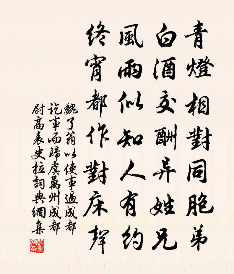 詩詞名句歷史字典書法欣賞書法字典國語詞典說文解字康熙字典古漢語字典標 題 作 者 詩 句 以使事過成都訖事而歸虞萬州成都尉高表史拉作者:魏了翁 朝代:宋代原文青燈相對同胞弟,白酒交酬異姓兄。風雨似知人有約,終宵都作對床聲。詩詞問答問:《以使事過成都訖事而歸虞萬州成都尉高表史拉》的作者是誰?答:魏了翁問:該詩寫於哪個朝代?答:宋代書法欣賞以使事過成都訖事而歸虞萬州成都尉高表史拉書法作品詩文賞析【原題】:以使事過成都訖事而歸虞萬州成都尉高表史拉訪靈泉宰高表史風雨連明遂謁朱祭酒祠即事賦詩詞推薦句釋惠崇〔宋代〕月高山舍迥,霜落石門深。扳子磯張舜民〔宋代〕石上紅花低照水,山頭翠篠細含煙。天生一本徐熙畫,祇欠鷓鴣相對眠。和鄭閎中仙居十一首陳襄〔宋代〕我愛仙居好,公餘日在房。憂民極反覆,責已未周詳。法律行隨手,詩書坐滿箱。老來須向學,多病喜平康。潤卿遺青?飯兼之一絕,聊用答謝皮日休〔唐代〕傳得三元?飯名,大宛聞說有仙卿。分泉過屋舂青稻,拂霧彯衣折紫莖,蒸處不教雙鶴見,服來唯怕五雲生。草堂登岱查道〔宋代〕凌空疊嶂絕凡埃,青帝高居絳節開。捧出海天紅日近,迓將蓬島碧霞來。石閭閃爍迎陽洞,玉簡光華封禪台。一自禪人並化主寫真求贊釋正覺〔宋代〕清淨本然,如合因緣。涅不緇而磨不磷,仰彌高而鑽彌堅。隨之無後,迎之無前,空空空處亡中邊。而今信手拈來題澉浦金粟寺二首曹勛〔宋代〕我聞金粟名,來謁示病相。不見隱几老,松竹空函丈。雨花誰聲聞,擎缽定非想。歸去一笑粲,春風快雙漿。和安這喜雨司馬光〔宋代〕吁嗟花方請雨,花潤溽果如占。黍稷固有望,來麰亦未嫌。聲繁清倦花,氣冷入疏花。蔓喜龍頭舉,泉驚虎抓添。訊囚唐庚〔宋代〕參軍坐廳事,據案嚼齒牙。引囚到庭下,囚口爭喧譁。參軍氣益振,聲厲語更切:“自古官中財,一一民膏血。為奉送六舅歸陸渾王維〔唐代〕伯舅吏淮泗。卓魯方喟然。悠哉自不競。退耕東皋田。條桑臘月下。種杏春風前。酌醴賦歸去。共知陶令賢。移官巴陵行有日矣書呈唐德輿程士和梁和仲於趙蕃〔宋代〕客里仍為客,天邊懶問天。春風幾經歷,老病一蹁躚。君句真嚴律,儂詩但散禪。錦囊如許借,不憚手親傳。千秋嶺下趙嘏〔唐代〕知有岩前萬樹桃,未逢搖落思空勞。年年盛發無人見,三十六溪春水高。送吳菊潭游越丁西湖〔宋代〕春江柳色新,別酒易成醺。自厭久為客,難堪又送君。溪晴沙度鶴,地暖水生兮。若到蘭亭上,應須吊右軍。馮公嶺葉適〔宋代〕馮公此山民,昔開此山居。屈盤五十里,陟降皆林廬。公今去不存,耕鑿自有餘。鳳篁生谷隧,雨旆來岩虛。人隨題李氏敬聚堂家鉉翁〔宋代〕一矜字十年除得,一信字五年乃成。我贈君家一敬字,須知受用在平生。老舅寓陳諸況不能盡布以二詩代書得閒為和佳張耒〔宋代〕浮生已老付悠悠,未免饑寒目下憂。全仗黃庭能卻老,那堪白髮更悲秋。所欣耳界常清淨,漸放心君得自由。壘塊寫真汪晫〔宋代〕鬚眉數得莖莖古,果是環谷山中人。道眼靜觀付一笑,借問兩個若個真。梅花喜神譜大蕊八枝宋伯仁〔宋代〕高山流水音,泠泠生指下。無與俗 * ,伯牙恐嘲罵。將軍行陸游〔宋代〕將軍入奏平燕策,持笏榻前親指畫;天山熱海在目中,下殿即日名烜赫。馳出都門雪初霽,直過黃河冰未坼。繡旗偈頌二百零五首釋正覺〔宋代〕差之毫厘,失之千里。會也打草驚蛇,不會也燒錢引鬼。荒田不揀老俱胝,只今信手拈來底。名句推薦死生驚懼不入乎其胸,是故忤物而不懾。列子及其弟子《列子·黃帝》 白馬誰家子,黃龍邊塞兒。李白《獨不見》 因思杜陵夢,鳧雁滿回塘。溫庭筠《商山早行》 九日黃花才過了,一尊聊慰秋容老。趙可《鳳棲梧·霜樹重重青嶂小》 獨上小摟春欲暮,愁望玉關芳草路。韋莊《木蘭花·獨上小樓春欲暮》 長相思,長相思。晏幾道《長相思·長相思》 新園鎖卻愁陰,露黃漫委,寒香半畝。吳文英《瑞龍吟·送梅津》 遍身羅綺者,不是養蠶人張俞《蠶婦》 鄉書不可寄,秋雁又南回。韋莊《章台夜思》 天地之道,可一言而盡也。其為物不貳,則其生物不測。子思《中庸·第二十六章》
