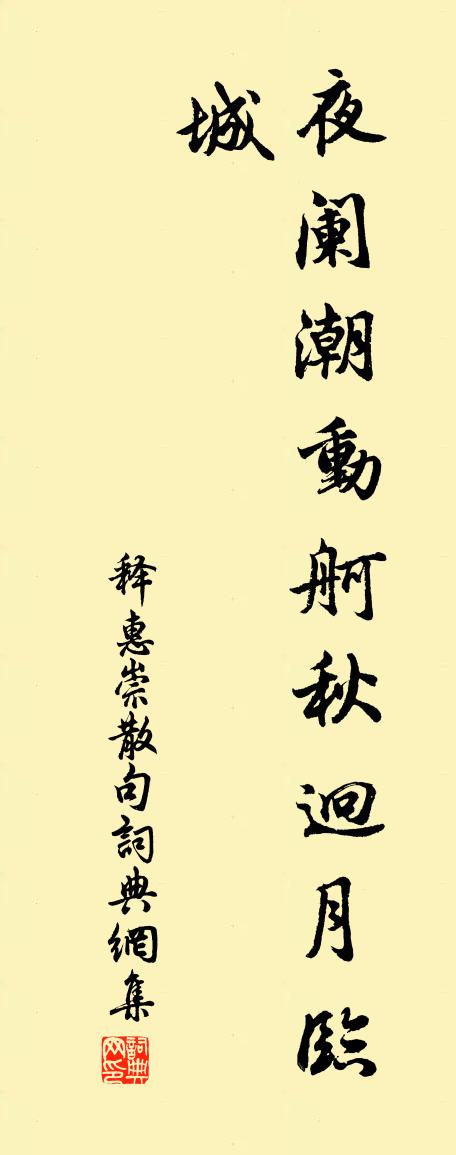 詩詞名句歷史字典書法欣賞書法字典國語詞典說文解字康熙字典古漢語字典標 題 作 者 詩 句 句作者:釋惠崇 朝代:宋代句原文夜闌潮動舸,秋迥月臨城。詩詞問答問:句的作者是誰?答:釋惠崇問:句寫於哪個朝代?答:宋代釋惠崇句書法欣賞句書法作品詩詞推薦聞邑中燈夕頗盛作詩呈子肅趙蕃〔宋代〕晨起猶如欲雪天,晚來旋覺散晴煙。傳聞隘郭沸燈火,想見當筵雜管弦。鐵馬春冰期異日,賣薪買酒看今年。誰憐鄭尚書新開涪江二首賈島〔唐代〕岸鑿青山破,江開白浪寒。日沉源出海,春至草生灘。梓匠防波溢,蓬仙畏水乾。從今疏決後,任雨滯峰巒。不侵紅佛見笑花張鎡〔宋代〕芳菲成夢雨廉纖,慰眼嬌紅敢浪嫌。不但瞿曇當發笑,老夫初看亦掀髯。偶題李師中〔宋代〕燕子知時節,還尋舊宇歸。新人方按曲,不許傍簾飛。和鄧子及見賀韻項安世〔宋代〕虛舟不記坎和流,槁木何心春共秋。幸自一生甘辟穀,更須萬戶苦封留。頗懲吾族騅千里,且學鄉人橘滿洲。平生送樓國正罷荊幕東歸項安世〔宋代〕一江秋水散芙渠,笑賣扁舟下五湖。北學自憐非楚產,東歸安得與公俱。同年進士今丞相,六館諸生舊講徒。朱橘過鄱陽湖華岳〔宋代〕北風翻雪鼓雷霆,舟子停蘭亦斷魂。看我金鱗三十六,為君一躍上龍門。次韻馬樞密二首許月卿六〔宋代〕臥聽爭雨半篙深,曉展芭蕉數尺心。攜手方山行樂處,滿林松竹翠陰陰。昭武太守王子文日舉李賈嚴羽共觀前輩一兩家戴復古〔宋代〕欲參詩律似參禪,妙趣不由文字傳。個裡稍關心有誤,發為言句自超然。簡中朝貴人王志道〔宋代〕場屋辛勤偵未償,又隨宦轍到河陽。米無五斗腰徒折,醋有三升鼻慣嘗。屢典朝衣賙過客,時沽坊酒滌愁腸。此心寒食書懷二首2舒岳祥〔宋代〕天機妙處莫形容,難把丹青定太空。萬古碧山留色在,千江皓月此心同。烏紗燕子開門雨,白髮楊妃掠面風。欲問疏影(西湖社友賦紅梅,分韻得落字)汪元量〔宋代〕虬枝茜萼。使輕盈態度,香透簾幕。淨洗鉛華,濃抹胭脂,風前伴我孤酌。詩翁瘦硬□□□,斷不被、春風熔鑠。重陽前一日張栻〔宋代〕九日明朝是,清樽強自開。蕭蕭疎雨暗,滾滾大江來。野菊閒無數,沙鷗靜不猜。何須騎台飲,此興亦悠哉。依韻答淮南祝秘校初春見寄梅堯臣〔宋代〕客有袖中書,初憑春燕寄。春燕不時來,秋鴻今始至。水落蒲藻寒,悠悠江浦意。喜劉邦瑞遷居采芹坊二首林景熙〔宋代〕鄉心幾夢海壇居,半老儒冠計未疏。岸竹色侵春壓酒,牆花香度曉翻書。卜鄰俎豆三遷後,負郭田疇二頃初。雨過次韻王待制游東坡留題十一絕喻良能〔宋代〕先生仙去幾經年,赤壁依然浪接天。去棹來舟相指示,曾游元佑玉堂賢。題江郎廟六絕陳淳〔宋代〕緣爾江家兄弟三,平生愛此石岩岩。寓居石下多年代,陋俗因成附會談。次韻子瞻送穆父二絕黃庭堅〔宋代〕謫官猶得住蓬萊,抱牘人稀書卷開。張敞憮眉應急召,董宣強項莫低回。感寓三首戴復古〔宋代〕誼利不同道,盛衰何用疑。布衣甘寂寞,紈袴自矜持。勿謂人為巧,待觀天定時。銅山或餓死,富貴五羊皮。【南呂】七賢過關 四時思情佚名〔元代〕春風花草香,遲日江山麗。萬紫千紅,總是傷情處。懨懨為伊,愁懷為伊。只聽得管聲,管聲喧天地,總有笙歌不名句推薦春陰垂野草青青,時有幽花一樹明。蘇舜欽《淮中晚泊犢頭》 一者階於道,幾於神。姜子牙《六韜·文韜·兵道》 人生到處知何似,應似飛鴻踏雪泥。蘇軾《和子由澠池懷舊》 朔方正月雪澌澌,單于策馬至京西沈約《昭君辭》 惱他香閣濃睡,撩亂有啼鶯。晏殊《訴衷情·東風楊柳欲青青》 欲系青春,少住春還去。朱淑真《蝶戀花·送春》 萬里煙塵。回首中原淚滿巾。朱敦儒《採桑子·彭浪磯》 日出入安窮?時世不與人同。佚名《日出入》 黃河怒浪連天來,大響谹谹如殷雷。溫庭筠《拂舞詞 / 公無渡河》 時見幽人獨往來,縹緲孤鴻影。蘇軾《卜運算元·黃州定慧院寓居作》