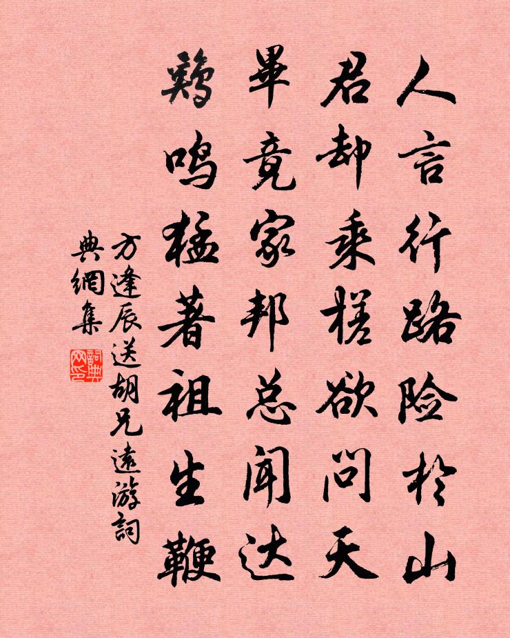 詩詞名句歷史字典書法欣賞書法字典國語詞典說文解字康熙字典古漢語字典標 題 作 者 詩 句 送胡兄遠遊作者:方逢辰 朝代:宋代送胡兄遠遊原文人言行路險于山,君卻乘槎欲問天。畢竟家邦總聞達,雞鳴猛著祖生鞭。詩詞問答問:送胡兄遠遊的作者是誰?答:方逢辰問:送胡兄遠遊寫於哪個朝代?答:宋代方逢辰送胡兄遠遊書法欣賞送胡兄遠遊書法作品詩詞推薦次韻宋德器春晚即事五首李流謙〔宋代〕靈明觀自己,糾錯漫殊途。睨柱夸完璧,探懷失系珠。封侯真不願,作佛尚堪圖。解我無還語,根塵法本粗。奉酬寇十侍御錫見寄四韻,復寄寇杜甫〔唐代〕往別郇瑕地,於今四十年。來簪御府筆,故泊洞庭船。詩憶傷心處,春深把臂前。南瞻按百越,黃帽待君偏。惠山寺並簡竇公蘇紳〔宋代〕綺塍行盡入松門,暫拂塵纓袖惹雲。海月未升樓上見,湖波初起坐中聞。寶扉膜拜青蓮相,石案傍行白{在疊右毛第一百八十三文天祥〔宋代〕名賢慎出處,志士懷感傷。猶殘數行淚,引古惜興亡。贈故人馬子喬詩鮑照〔南北朝〕躑躅城上羊。攀隅食玄草。俱共日月輝。昏明獨何早。夕風飄野籜。飛塵被長道。親愛難重陳。懷憂坐空老。送知府滕光祿朱長文〔唐代〕榜登龍虎亞倫魁,一紀橫飛長憲台。謨議軒昂開日月,辭章雄偉鼓風雷。朝端已慶明良會,廟論鹹推將相才。一跌西江月(十三)張伯端〔宋代〕丹是色身至寶,煉成變化無窮。更於性上究真宗。決了死生妙用。不待他身後世,現前獲福神通。自從龍虎著斯功又送前人琴棋書畫四首文天祥〔宋代〕不知甲子定何年,題滿柴桑日醉眠。意不在言君解否,壁間琴本是無弦。我愛商山茹紫芝,逍遙勝似橘中時。紛紛哭女二首李覯〔宋代〕妻死女已病,踰年成二喪。此生誰骨肉,末識好衣裳。看面雖猶小,聞言盡可傷。最知憐祖母,句句刮人腸。梅花陳景沂〔宋代〕標薰江雪情偏韻,影墨窗蟾夢半回。耐凍有何香可述,雅交還喜淡相陪。朝陽穿破衲贊釋了惠〔宋代〕一衲橫肩遮百醜, * 冷風吹不透。待伊穿線要重聯,金烏已在西山後。悼玉溪張九成〔宋代〕聞名四十載,茲地忽相逢。每聽談前事,相看淚滿胸。干戈今偃息,詩酒曷從容。寂寞千秋恨,新阡植萬松。和龔同叔春日即事五首趙善括〔宋代〕苦雨不肯霽,花愁都落紅。老農欣歲兆,遊子恨途窮。寒尚衣難褪,春侵酒易中。城頭喧角弄,輕度一簾風。贈方叔姜特立〔宋代〕世間曠士如君少,天下閒人似我稀。一曠一閒無一事,只應鷗鳥共忘機。臥梅李龍高〔宋代〕月橫鶴膝影闌乾,枕石眠雲幾歲寒。宇宙一身今老矣,瀟瀟風雪擁袁安。諸公和淵明止酒詩因同賦陳與義〔宋代〕愛河漂一世,既溺不能止。不如淡生活,吟詩北窗里。肺肝亦何罪,困此毛錐子。不如友麯生,是子差可喜。三杯初入汴強至〔宋代〕山勢隨淮斷,河流帶地渾。嚴風疏樹影,落日露沙痕。客興雙蓬鬢,吟懷一酒尊。舟行那敢緩,霜意滿乾坤。春日田園雜興王進之〔宋代〕東君私我此閒身,脫欲青衫野服更。桑可以絲麻可貴,麥宜續食韭宜羹。分甘壟上耕雲隱,夢不湖邊拾翠行。物意賢者之孝二百四十首雷紹林同〔宋代〕行莫大於孝,其如違養何。只消一句子,安用讀書多。洋州三十景此君奄鮮于侁〔宋代〕結庵已忘情,植竹更端操。迢遙月 * ,習靜誰能造。名句推薦嗟萬事難忘,惟是輕別。周邦彥《浪淘沙慢·曉陰重》 海水夢悠悠,君愁我亦愁。佚名《西洲曲》 人之性惡,其善者偽也。荀子《荀子·性惡》 伏久者,飛必高;開先者,謝獨早。陳繼儒《小窗幽記·集醒篇》 叢菊兩開他日淚,孤舟一系故園心。杜甫《秋興八首·其一》 神女生涯原是夢,小姑居處本無郎。李商隱《無題·重幃深下莫愁堂》 經年塵土滿征衣,特特尋芳上翠微。岳飛《池州翠微亭》 勝法之務莫急於去奸,去奸之本莫深於嚴刑。商鞅《商君書·開塞》 旋開旋落旋成空,白髮多情人更惜。司空圖《酒泉子·買得杏花》 夕陽牛背無人臥,帶得寒鴉兩兩歸。張舜民《村居·水繞陂田竹繞籬》