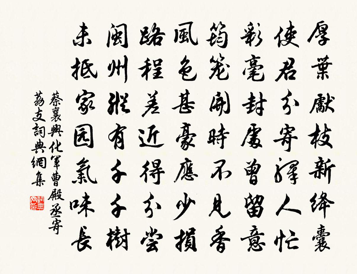 詩詞名句歷史字典書法欣賞書法字典國語詞典說文解字康熙字典古漢語字典標 題 作 者 詩 句 興化軍曹殿丞寄荔支作者:蔡襄 朝代:宋代興化軍曹殿丞寄荔支原文厚葉先枝新絳囊,使君分寄驛人忙。彩毫封處曾留意,筠籠開時不見香。風色甚豪應少損,路程差近得分嘗。閩州縱有千千樹,未抵家園氣味長。詩詞問答問:興化軍曹殿丞寄荔支的作者是誰?答:蔡襄問:興化軍曹殿丞寄荔支寫於哪個朝代?答:宋代蔡襄興化軍曹殿丞寄荔支書法欣賞興化軍曹殿丞寄荔支書法作品詩詞推薦正月將晦繁星滿天楊萬里〔宋代〕兔冷蟾寒不出時,群仙無睡尚游嬉。可憐深夜無燈火,碧玉枰前暗著棋。硤石遇雨,宴前主簿從兄子英宅劉長卿〔唐代〕縣城蒼翠里,客路兩崖開。硤石雲漠漠,東風吹雨來。吾兄此為吏,薄宦知無媒。方寸抱秦鏡,聲名傳楚材。折腰辛春日詞東宮閣晏殊〔宋代〕青幡乍帖宜春字,翠旆初迎入律風。一有元良昭大慶,問安長在紫宸中。憩靈隱寫懷釋紹嵩〔宋代〕莫恨征途遠,題詩記獨游。十年行路飽,萬里此生浮。宇宙知何極,山川慰久留。倚欄喔五字,不覺散人愁。和鮑守次韻林德祖十四首傅察〔宋代〕九萬鵬程舉翮輕,蚤年高譽滿江亭。曾分蘭省趨墀赤,行從荷囊拜瑣青。雅度最宜鏘玉佩,精忠不用綠沈屏。欲令山南鄭相公樊員外酬答為詩…樊封以示愈依賦十四韻以獻韓愈〔唐代〕梁維西南屏,山厲水刻屈。稟生肖剿剛,難諧在民物。滎公鼎軸老,烹斡力健倔。帝咨女予往,牙纛前岔坲。威風甲寅十一月朔旦冬至適值先妣太夫人服闋從吉虞儔〔宋代〕維摩應待散花天,無復稱觴壽母前。從隔蓬壺三萬里,尚期華表一千年。弟兄黃髮三人在,故舊青雲眾目憐。自愧大熱二首歐陽修〔宋代〕陽暉爍四野,萬里纖雲收。羲和困路遠,正午當空留。枝條不動影,草木皆含愁。深林虎不嘯,臥喘如吳牛。蜩蟬淨居勸農三首陳造〔宋代〕簿書堆里得抽身,梅柳風前觸眼新。報答好春還著語,今朝猶喜是閒人。和陸務觀用張季長吏部韻,寄季長兼簡老夫補楊萬里〔宋代〕別去公懷我,詩來我夢公。半輪笠澤月,一信鏡湖風。豈有詩名世,而無鬼作窮。管城言曉事,猶欲策元功。親舊見過多見賀強健戲作此篇陸游〔宋代〕偶向人間脫駭機,玉池中夜自生肥。據鞍馬援雖堪笑,強飯廉頗亦未非。道貌安能希睟盎?世緣但可付猗違。它年峽州渡江入寺李復〔宋代〕雪暗離秦地,春歸入楚邦。平生憐匹馬,將老渡長江。解纜辭亭樹,中流見寺窗。舟人喜風色,略得寸心降。春日獨酌郭祥正〔宋代〕江草綠未齊,林花飛已亂。霽景殊可樂,陰雲幸飄散。且致百斛酒,醉倒落花畔。元日試筆姚勉〔宋代〕今歲新元最喜晴,宿陰都化作清明。氣從地角天涯轉,春向梅邊柳上生。鵷路五更鏘劍佩,虎關半夜出弓旌。群賢同餘汝霖游西湖觀天竺觀音永懷林和靖三絕胡寅〔宋代〕莫話蔣陵陳跡,青松翠碧躋攀。此別再游何日,夢魂長繞湖山。讀《開元天寶遺事》三首蘇軾〔宋代〕潭裡舟船百倍多,廣陵銅器越溪羅。三郎官爵如泥土,爭唱弘農得寶歌。婦女之孝二十首如姬林同〔宋代〕底事能令妾,為君死不辭。不思君遣客,報妾父讎時。六言五首為倉部弟壽劉克莊〔宋代〕天既勞我佚我,侯偶得之失之。安用爾銅魚使,且伴吾竹馬嬉。日出吟李覯〔宋代〕日出百鳥喜,覊人懶舉眸。長恨年光緩,祿養未可求。若至年光過,高堂又白頭。義和君有知,奈我心悠悠。殢人嬌毛滂〔宋代〕雪做屏風,花為行帳。屏帳里、見春模樣。小晴未了,輕陰一餉。酒到處、恰如把春拈上。官柳黃輕,河堤綠漲。名句推薦仁之實,事親是也;義之實,從兄是也。孟子《孟子·離婁章句上·第二十七節》 扶桑已在渺茫中,家在扶桑東更東。韋莊《送日本國僧敬龍歸》 秦時明月漢時關,萬里長征人未還。王昌齡《出塞二首·其一》 疾風知勁草,板蕩識誠臣。李世民《賜蕭瑀》 工欲善其事,必先利其器。佚名《論語七則》 人而無儀,不死何為?佚名《相鼠》 卻看妻子愁何在,漫捲詩書喜欲狂杜甫《聞官軍收河南河北》 學然後知不足,教然後知困。戴聖《禮記·學記》 赤闌橋盡香街直,籠街細柳嬌無力。陳克《菩薩蠻·赤闌橋盡香街直》 故國梅花歸夢,愁損綠羅裙。孔夷《南浦·旅懷》