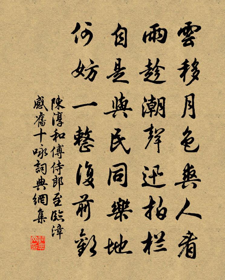 詩詞名句歷史字典書法欣賞書法字典國語詞典說文解字康熙字典古漢語字典標 題 作 者 詩 句 和傅侍郎至臨漳感舊十詠作者:陳淳 朝代:宋代和傅侍郎至臨漳感舊十詠原文雲移月色爽人看,雨趁潮聲迅拍欄。自是與民同樂地,何妨一整復前歡。詩詞問答問:和傅侍郎至臨漳感舊十詠的作者是誰?答:陳淳問:和傅侍郎至臨漳感舊十詠寫於哪個朝代?答:宋代陳淳和傅侍郎至臨漳感舊十詠書法欣賞和傅侍郎至臨漳感舊十詠書法作品詩詞推薦春貼子詞太皇太后閣六首司馬光〔宋代〕慶壽風煙接未央,飛樓復道郁相望。春來無以銷長日,閒取經書教小生。酷熱釋智圓〔宋代〕酷熱如小人,到處苦相侵。清風如君子,時來寬我心。酷熱驅不去,清風留不住。此情無以訴,吟傍陰陰樹。王監簿南墅新樓落成林景熙〔宋代〕玉佩珊珊不可招,眼空塵界等秋毫。山林貞白三層迥,湖海元龍百尺高。自笑行藏關氣數,肯將歌舞換風騷。捲簾生茨詩繁欽〔魏晉〕有茨生蘭圃。布葉翳芙蕖。寄根膏壤隈。春澤以養軀。太陽曝真色。翔風發其旉。甘液潤其中。華實與氣俱。族類性地頌張伯端〔宋代〕求生本自無生,畏滅何曾暫滅。眼見不如耳見,口說爭如鼻說。元紀二首李覯〔宋代〕君道乾剛豈易柔,謬牽文義致優遊。高皇馬上辛勤得,總被儒生斷送休。楚翁別五年丙午四月來山中風雨數日因話舊作黎廷瑞〔宋代〕三千年待桃花結,五百歲還銅狄磨。我輩相期非旦暮,五年離別未為多。江中誦經張說〔唐代〕實相歸懸解,虛心暗在通。澄江明月內,應是色成空。題太姥墓陳嘉官〔宋代〕吾聞堯時種藍嫗,世代更移好壞可數。帝堯朽骨無微塵,此閒猶有堯時墓。墓中老嫗知不知,五帝三王奚以為。狼送馬明府歸山王貞白〔唐代〕辭秩入匡廬,重修靖節居。免遭黑綬束,不與白雲疏。送吏各獻酒,群兒自擔書。到時看瀑布,為我謝清虛。過靜林寺用琳老韻作四絕句毛滂〔宋代〕寒溪只數尺,炯炯涵晴空。寄目誰與論,翠芊牽春風。句釋曉瑩〔宋代〕悠悠落日懸。玉川茶吳泳〔宋代〕一旗初試蜀山春,團銙誰論蔡與丁。更出苦言澆諫味,世間醉夢合俱醒。偶成張耒〔宋代〕低雲著地曉悠悠,雨濕簾旌不上鉤。江北江南千萬里,年年長向此時愁。蜀道難·其二蕭綱〔南北朝〕巫山七百里,巴水三回曲。笛聲下復高,猿啼斷還續。重送文處厚,因寄蜀父老三首范成大〔宋代〕灌口江源不斷流,峨眉山月幾番秋。江山好處吾能記,為問江山記客否?止所吳公輓歌辭方鳳〔宋代〕嶽嶽花文豪共識花名,歸來花風月恣彈評。竹階過鶴窺棋局,花院流鶯和樂聲。燈酌蕭間期鄭老,盆歌疏達慕莊生循吏曲上王使君貫休〔唐代〕需宿需宿,炳爛光合。蒸蒸婺民,鍾此多福。自東自西,自南自北。伊飛伊走,乳乳良牧。和氣無形,春光自成。送施元光赴江西幕府范成大〔宋代〕鎮南旌旆照江皋,入幕如今客最高。月暗秋城稀擊柝,雲飛朝棟剩揮毫。長亭酒盡歌三疊,半夜溪深雨一篙。莫戀春分後一日山堂述事張鎡〔宋代〕老圃工夫愈可嘉,種藤縈樹盡開花。人間似我能閒少,石上看雲到日斜。樵徑有苔休埽葉,茅庵無客亦煎茶。兩邊名句推薦且憑天子怒,復倚將軍雄。高適《塞下曲》 野竹交淇水,秋瓜蔓帝邱。司馬光《送雲卿知衛州》 輦轂繁華事可傷,師師垂老過湖湘劉子翬《汴京紀事》 城外蕭蕭北風起,城上健兒吹落耳。劉基《北風行》 琴瑟在御,莫不靜好。佚名《女曰雞鳴》 墜粉飄香,日日喚愁生。盧祖皋《江城子·畫樓簾暮卷新晴》 功不可以虛成,名不可以偽立班固《漢書·傳·敘傳上》 少無適俗韻,性本愛丘山。陶淵明《歸園田居·其一》 無由持一碗,寄與愛茶人。白居易《山泉煎茶有懷》 家國興亡自有時,吳人何苦怨西施。羅隱《西施》