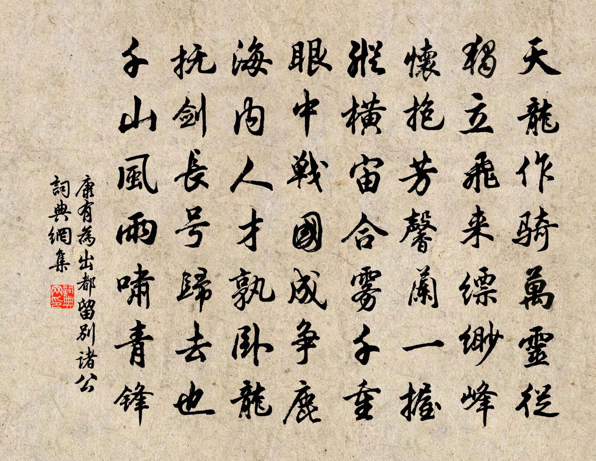 詩詞名句歷史字典書法欣賞書法字典國語詞典說文解字康熙字典古漢語字典標 題 作 者 詩 句 出都留別諸公作者:康有為 朝代:清代出都留別諸公原文天龍作騎萬靈從,獨立飛來縹緲峰。懷抱芳馨蘭一握,縱橫宙合霧千重。眼中戰國成爭鹿,海內人才孰臥龍。撫劍長號歸去也,千山風雨嘯青鋒。詩詞問答問:出都留別諸公的作者是誰?答:康有為問:出都留別諸公寫於哪個朝代?答:清代問:出都留別諸公是什麼體裁?答:七律康有為出都留別諸公書法欣賞出都留別諸公書法作品詩文賞析此詩題下作者自注曰:“吾以諸生請變法,開國未有。群疑交集,乃行。”共五首,選其一。詩詞推薦初起李商隱〔唐代〕想像鹹池日欲光,五更鐘後更迴腸。三年苦霧巴江水,不為離人照屋樑。次韻程德遠登清淮樓王之道〔宋代〕西望中原懶轉頭,十年空見水東流。塗山漫想諸侯會,濠上聊追二子游。大劍長刀秋正擾,淡煙疏雨暮還愁。誰能拜明招塔釋智朋〔宋代〕稍硬風頭早已乖,更歸暖處自沉埋。翻令千古成蹤跡。枉吃羅山白飯來。贈萬年陸郎中孟郊〔唐代〕天子憂劇縣,寄深華省郎。紛紛風響珮,蟄蟄劍開霜。舊事笑堆案,新聲唯雅章。誰言百里才,終作橫天梁。江鴻和并州大資政鄭侍郎秋晚書事范仲淹〔宋代〕太原兵重壓強胡,莫對秋風憶鱠鱸。萬里天聲揚紫塞,十年人望在黃樞。定應松柏心無改,自信雲龍道不孤。應笑杜鵑張衡〔兩漢〕猛為春歸苦口嘶,桐花滿地綠蔭齊。自從康節先生後,孤汝天津故意啼。毋忽詩周端臣〔宋代〕毋忽咫尺水,中恐有伏龍。毋忽尋丈山,中恐有毒蟲。是以古君子,不敢欺盲聾。審密言語間,戒謹闇室中。幾微過楊二渡三首楊萬里〔宋代〕春跡無痕可得尋,不將詩眼看春心。鶯邊楊柳鷗邊草,一日青來一日深。中夜起望西園值月上柳宗元〔唐代〕覺聞繁露墜,開戶臨西園。寒月上東嶺,泠泠疏竹根。石泉遠逾響,山鳥時一喧。倚楹遂至旦,寂寞將何言。殘句:勢不可使盡陳師道〔宋代〕勢不可使盡,福不可享盡。事不可做盡,話不可說盡。人生如此耳,文字已其閏。雜興陸游〔宋代〕詩人肝肺困雕鐫,往往壽非金石堅。我獨適情無傑句,化工不忌遣長年。慶羅氏祖母百歲文天祥〔宋代〕麗日萱花照五雲,升堂風采見乾淳。蓬萊會上逢王母,婺女光中見老人。雨露一門華發潤,江山滿座彩衣新。只將失題四首曾國藩〔清代〕金堤舊潰高家堰,復道今年盛昔年。自古塵沙同浩劫,斯民塗炭豈前緣?沉江欲禱王尊壁,擊揖誰揮祖逖鞭?大廈還京樂楊 * 〔宋代〕春光至,欲訪清歌妙舞重為理。念鶯輕燕怯媚容,百斛明珠須費。算枕前盟誓。深誠密約堪憑委。意正美,嬌眼又再赴桂州先寄李大夫戎昱〔唐代〕玷玉甘長棄,朱門喜再游。過因讒後重,恩合死前酬。養驥須憐瘦,栽松莫厭秋。今朝兩行淚,一半血和流。題度儀堂四首張繼先〔宋代〕驟爾升堂者,同乎白日仙。崇深鄰聖像,超卓愧吾年。微月兼寒露,喬松間野田。宮成方數載,猶使扣鍾錢。和章序臣梅花二首王之道〔宋代〕三月詩筒絕往來,有時談麈許追陪。梅花雅欲撩佳句,犯雪凌霜為我開。村市醉歸陸游〔宋代〕伏櫪元知免駭機,翦翎豈復慕群飛。坐中客滿知心少,囊里詩多得意稀。小市雨余尋酒去,野橋日落策驢歸,不辭復用前韻李彌遜〔宋代〕青精飯熟思留客,碧澗芹香可厭君。睡起茶甌風兩腋,功名何啻等池雲。沁園春趙師俠〔宋代〕羊角飄塵,金烏爍石,雨涼念秋。有虛堂臨水,披襟散發,紗幮霧卷,湘潭波浮。遠列雲峰,近參荷氣,臥看文書名句推薦粽包分兩髻,艾束著危冠。陸游《乙卯重五詩》 問君何事輕離別,一年能幾團圓月。納蘭性德《菩薩蠻·問君何事輕離別》 食之以時,用之以禮。孟子《孟子·盡心章句上·第二十三節》 烏鵲倦棲,魚龍驚起,星斗掛垂楊。陳亮《一叢花·溪堂玩月作》 功名炊黍尋常夢,怪事書空感激人。王遜《西夏重陽》 不躓于山,而躓於垤。韓非及後人《韓非子·六反》 一身猶在,亂山深處,寂寞溪橋畔。黃公紹《青玉案·年年社日停針線》 眼孔淺時無大量,心田偏處有奸謀。馮夢龍《醒世恆言·卷一》 冥冥寒食雨,客意向誰親?劉一止《冥冥寒食雨》 今人嗤點流傳賦,不覺前賢畏後生。杜甫《戲為六絕句》