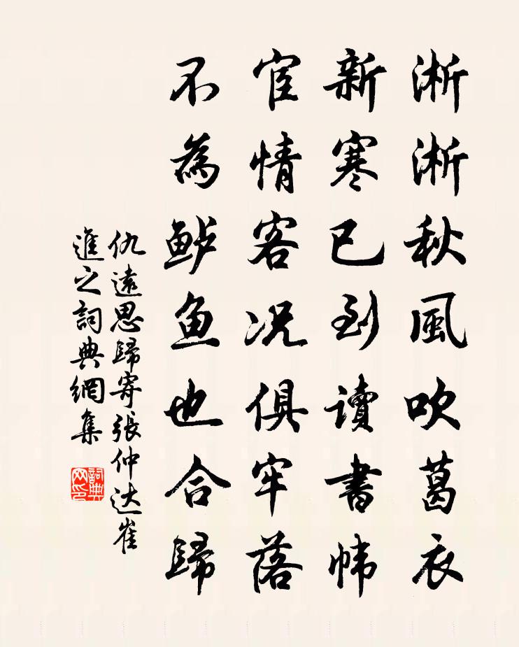 詩詞名句歷史字典書法欣賞書法字典國語詞典說文解字康熙字典古漢語字典標 題 作 者 詩 句 思歸寄張仲達崔進之作者:仇遠 朝代:宋代思歸寄張仲達崔進之原文淅淅秋風吹葛衣,新寒已到讀書幃。宦情客況俱牢落,不為鱸魚也合歸。詩詞問答問:思歸寄張仲達崔進之的作者是誰?答:仇遠問:思歸寄張仲達崔進之寫於哪個朝代?答:宋代仇遠思歸寄張仲達崔進之書法欣賞思歸寄張仲達崔進之書法作品詩詞推薦游長安諸寺聯句長樂坊安國寺紅樓聯句(隱侯體)段成式〔唐代〕重疊碎晴空,餘霞更照紅。蟬蹤近鳷鵲,鳥道接相風。 ——張希復苔靜金輪路,雲輕白日宮。壁詩傳謝客,門榜過湘潭文明信叔舊居有感張栻〔宋代〕北渚留行客,東陵憶舊侯。池蓮半枯折,風葉正颼飀。事業留千載,英雄去一丘。平生許國志,歲晚詎悠悠。重登滕王閣李涉〔唐代〕滕王閣上唱伊州,二十年前向此游。半是半非君莫問,好山長在水長流。德輝郎君名嘉橘其小字也書來雲修嘉辰故事並李石〔宋代〕逐客佳晨省醉眠,出門未辦杖頭錢。卻因廚釀分雙榼,添入詩圖作九仙。句周煇〔宋代〕捲簾試約東君問,花信風來第幾番。臨江仙(再用圖字韻)辛棄疾〔宋代〕窄樣金杯教換了,房櫳試聽珊珊。莫教秋扇雪團團。古今悲笑事,長付後人看。記取桔槔春雨後,短畦菊艾相連。宿池州齊山寺,即杜牧楊萬里〔宋代〕我來秋浦正逢秋,夢裡重來似舊遊。風月不供詩酒債,江山長管古今愁。謫仙狂飲顛吟寺,小杜倡情冶思樓。問著用王侍郎韻寄題醫僧道森藥山閣方岳〔宋代〕蚊蛭侯王空培塿,大千世界無何有。痴兒不省芭蕉身,持與冰霜斗長久。三生慈憫魚十千,卻來世間吁可憐。一百偈頌一百三十六首釋惟一〔宋代〕去時元只空雙手,歸日依前雙手空。底事兩肩擔不起,打開畐塞滿玲瓏。姑蘇明月,苕霅清風。句諶祜〔宋代〕封浚九州堯舜禹,典刑萬世契夔龍。句劉接〔宋代〕獵叟藤編戶,傜人草結庵。南鄉子 誡人禮拜王哲〔元代〕堪嘆這頑夫。空恁區區用力粗。五體相逢投地面,休遇。尚自勞勞禮假軀。在道本虛無。玄里藏玄妙不敷。內有元偈頌一百四十一首釋師範〔宋代〕尋常月是中秋月,中秋月是尋常月。看來真箇只尋常,道是尋常又還別。別別,無物堪比倫,教我如何說。南望樓盧僎〔唐代〕去國三巴遠,登樓萬里春。傷心江上客,不是故鄉人。減字木蘭花侯善淵〔元代〕功名富貴。致使沉淪空手去。改面回頭。一失人身永劫休。歸純返樸。背境滌塵真正覺。一顆圓光。煥煥煌煌入大秋日雜詠陸游〔宋代〕久雨初睛喜欲迷,青鞋踏遍舍東西。忽然來到柳橋下,露濕蓼花紅一溪。和淮漕八月十四夜月詩二首劉宰〔宋代〕清涼景界限塵紛,玉宇從容靜夜分。欲滿尚慳今夜月,乍舒還斂北山雲。孤光翻動枝頭鵲,餘暈潛驅草際蚊。好處上元立春方回〔宋代〕華燈彩勝兩逢迎,美景良辰未易並。花信風初回肅殺,柳梢月豈異承平。神鰲觀闕山何在,旅雁汀洲水復生。可待醉公子(一名四換頭)薛昭蘊〔唐代〕慢綰青絲髮,光砑吳綾襪。床上小熏籠,韶州新退紅。叵耐無端處,捻得從頭污。惱得眼慵開,問人閒事來。明發鴨步楊萬里〔宋代〕雨歲春船各一時,今年船快去年遲。青山面目何曾改,清曉看來別樣奇。名句推薦岸旁青草長不歇,空中白雪遙旋滅。岑參《熱海行送崔侍御還京》 人主之患,在於信人,信人,則制於人。韓非及後人《韓非子·備內》 思則有備,有備無患左丘明《左傳·襄公·襄公十一年》 寄語洛城風日道,明年春色倍還人。杜審言《春日京中有懷》 雷填填兮雨冥冥,猿啾啾兮狖夜鳴;屈原《九歌》 相逢一醉是前緣,風雨散、飄然何處。蘇軾《鵲橋仙·七夕》 檳榔無柯,椰葉無陰。左思《三都賦》 紅橋路,正一派、畫船蕭鼓中流住。納蘭性德《摸魚兒·午日雨眺》 人皆欲會說話,蘇秦乃因會說而殺身王永彬《圍爐夜話·第七則》 燎沉香,消溽暑。周邦彥《蘇幕遮·燎沉香》