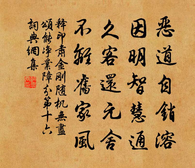 詩詞名句歷史字典書法欣賞書法字典國語詞典說文解字康熙字典古漢語字典標 題 作 者 詩 句 金剛隨機無盡頌能淨業障分第十六作者:釋印肅 朝代:宋代原文惡道自銷溶,因明智慧通。久客還元舍,不離舊家風。詩詞問答問:《金剛隨機無盡頌能淨業障分第十六》的作者是誰?答:釋印肅問:該詩寫於哪個朝代?答:宋代書法欣賞金剛隨機無盡頌能淨業障分第十六書法作品詩詞推薦漢詔郡縣行鄉飲酒禮頌詩洪遵〔宋代〕笙流觶揚,少長位辨。已事而竣,不誡用勸。幽居初夏陸游〔宋代〕路繚長堤北,家居小市西。陂塘晨飲犢,門巷午鳴雞。婦喜蠶三幼,兒夸雨一犁。衰翁亦放浪,未怕屐沾泥。贈別儲嗣宗〔唐代〕蘭澤傷秋色,臨風遠別期。東城草雖綠,南浦柳無枝。直道豈易枉,暗投誰不疑。因君問行役,有淚濕江蘺。秋旅蘇轍〔宋代〕雨晴秋稼如雲屯,豆沒雞兔禾沒人。老農歡笑語行路,十年儉薄無今晨。無風無雨更一月,藜羹黍飯供四鄰。天公和林處士梅詩八首劉學箕〔宋代〕犯寒不怕雪蒙頭,踢石穿林不暫休。千首詩成千首意,十分春瘦十分愁。飛添宮額妝同艷,斜插鬢雲香共留。勉續答任開叔郎中昆仲相訪邵雍〔宋代〕竹影戰棋罷,閒思安樂窩。曠時稱不見,聯轡幸相過。寵莫兼金比,褒逾華袞多。從來有詩癖,使我遂成魔。菩薩蠻辛棄疾〔宋代〕稼軒日向兒童說。帶湖買得新風月。頭白早歸來。種花花已開。功名渾是錯。更莫思量著。見說小樓東。好山千萬燕山送黃千戶之旴江汪元量〔宋代〕萬里關河道路迂,出門一笑意何如。來時雨雪侵駝褐,歸日風雲藹駟車。玉座喜聞黃石策,金台榮拜紫泥書。野人游洞庭湯仲友〔宋代〕寒色滿空山,悠然一徑閒。鳥啼黃葉外,人度翠峰間。古殿藏雲氣,唐碑帶蘚斑。未窮幽絕處,興心忽思還。江頭春日真山民〔宋代〕風暖旗亭煮酒香,醉醒始悟是他鄉。駕言行邁路千里,豈不懷歸天一方。春事漸消鶯語老,離愁偏勝柳絲長。無聊別館即事華岳〔宋代〕十年客裹過春光,客裹逢春分外狂。半堵碧雲蝸路濕,一簾紅雨燕泥香。銜山西日辭春閣,拍岸東風趁夜航。莫向秋思贈遠二首王涯〔唐代〕當年只自守空帷,夢裡關山覺別離。不見鄉書傳雁足,唯看新月吐蛾眉。厭攀楊柳臨清閣,閒采芙蕖傍碧潭。走馬郊原釋善珍〔宋代〕郊原春過後,日日長新梢。洗竹去蛛網,疎松留鶴巢。雲衣慵補綴,月戶自推敲。舊種梅花樹,吾今與汝交。至後承元煇見和複次韻書病中近況十首方回〔宋代〕往事付杯酒,殘生余幅巾。更須占大衍,久已玩同人。犒少傭奴懶,迎遲過客嗔。悔曾迷宦海,素不媚錢神。寄僧寓題徐夤〔唐代〕佛頂抄經憶惠休,眾人皆謂我悠悠。浮生真箇醉中夢,閒事莫添身外愁。百歲付於花暗落,四時隨卻水奔流。安眠和游房公舊竹亭聞琴絕句劉禹錫〔唐代〕尚有竹間路,永無綦下塵。一聞流水曲,重憶餐霞人。天山觀雪王昭儀相邀割駝肉汪元量〔宋代〕北征已十年,抑鬱悲侷促。拄杖看天山,雪光皎如玉。滿目鸇鷹飛,晴天獵鴻鵠。羈人灶無炊,竟夕枵其腹。美人湘江送客齊己〔唐代〕湘江秋色湛如冰,楚客離懷暮不勝。千里碧雲聞塞雁,幾程青草見巴陵。寒濤響疊晨征櫓,岸葦叢明夜泊燈。鸚鵡題齋壁張耒〔宋代〕松庭日午聽啼鶯,簾外人稀睡老鈴。已嘆近秋添白髮,更因多病讀黃庭。江魚未上烹難致,吳酒空斟醉易醒。好住還家秋夕飲中喜雨楊萬里〔宋代〕好風有意入金台,白酒無聲落玊林。秋雨亦嫌秋熱在,打荷飄竹為人來。名句推薦叢菊兩開他日淚,孤舟一系故園心。杜甫《秋興八首·其一》 跨馬出郊時極目,不堪人事日蕭條杜甫《野望》 今日山城對垂淚,傷心不獨為悲秋。李益《上汝州郡樓》 大嫂采芙蓉,溪湖千萬重。李白《湖邊採蓮婦》 君問歸期未有期,巴山夜雨漲秋池。李商隱《夜雨寄北》 人不可貌相,海水不可斗量。馮夢龍《醒世恆言·卷三》 千嬌面、盈盈佇立,無言有淚,斷腸爭忍回顧。柳永《採蓮令·月華收》 假金方用真金鍍,若是真金不鍍金。李紳《答章孝標》 相呴以濕,相濡以沫,不如相忘於江湖。莊子《莊子·內篇·大宗師》 未知鹿死誰手房玄齡《晉書·載記·第五章》