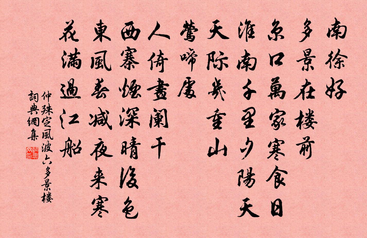 詩詞名句歷史字典書法欣賞書法字典國語詞典說文解字康熙字典古漢語字典標 題 作 者 詩 句 定風波(六·多景樓)作者:仲殊 朝代:宋代定風波(六·多景樓)原文南徐好,多景在樓前。京口萬家寒食日,淮南千里夕陽天。天際幾重山。鶯啼處,人倚畫闌乾。西寨煙深晴後色,東風春減夜來寒。花滿過江船。詩詞問答問:定風波(六·多景樓)的作者是誰?答:仲殊問:定風波(六·多景樓)寫於哪個朝代?答:宋代仲殊定風波(六·多景樓)書法欣賞定風波(六·多景樓)書法作品詩詞推薦示黃吉甫王安石〔宋代〕三山半落青天外,勢比凌歊宋武台。塵世難逢開口笑,生前相遇且銜杯。贈王琴所黃庚〔宋代〕一曲絲桐余古意,百篇風月寄閒情。君詩即是琴中操,底用離鸞別鶴聲。送張推官洞赴晏相公辟梅堯臣〔宋代〕送子居大梁,關中乃關外。往者邊事繁,秦民被災害。今聞獨豐穰,逮堠無動旝。相公欲勤勞,請以臨都會。多選春波曲楊維楨〔元代〕家住春波上,春深未得歸。桃花新水長,應沒浣紗磯。洞霄宮王介〔宋代〕飄飄遼鶴去難尋,野客重來嘆復吟。許邁林中丹灶冷,郭文山上白雲深。南陵事蹟都非昔,北嶺歸期直到今。珍重觀上林垍器謝景初〔宋代〕作灶長如丘,取土深於塹。踏輪飛為模,覆灰色乃紺。力疲手足病,欲憩不敢暫。發窯火以堅,百栽一二占。里中和馬粹老四明雜詩聊記里俗耳十首舒坦〔宋代〕箔蠶迎豆熱,江雪伴梅消。抵虎螯經夏,跳沙蛤趁潮。酒罌雙印貴,藥肆萬金饒。未覺西風遠,三溪好采樵。題王文孺臞庵向子諲〔宋代〕仙翁五十鬢猶青,高臥柴門晝亦扃。茅舍已忘鐘鼎夢,蒲輪休過薜蘿亭。陰森門巷先生柳,寂寞江天處士星。晚歲漁村雜詩十首再和前韻薛嵎〔宋代〕巡檐修竹晚風敲,古寺僧歸月下橈。童子閉門無一事,只須清坐過中宵。大人生朝六首容孫項安世〔宋代〕一年好景是重陽,萸紫樨紅菊更黃。可但初旬堪落帽,不□二九再飛觴。芝書況有重重慶,桂種仍傅袞袞芳。歲歲廢寺胡仲弓〔宋代〕鐘鼓蕭條久,誰從此地來。僧房無戶牖,佛面有塵埃。碑斷眠荒草,廓空長綠苔。鵂鶹並蝙蝠,時或此徘徊。江神子(金山會飲)韓元吉〔宋代〕金銀樓閣認蓬萊。曉煙開。上崔嵬。風引孤帆,誰道卻船回。鵬翼倚天鰲背穩,驚浪起,雪成堆。翩翩黃鶴為誰來過渦河祖無擇〔宋代〕揚鞭策羸馬,橋上一徘徊。欲擬臨渦賦,慚無八斗才。憶揚州徐凝〔唐代〕蕭娘臉下難勝淚,桃葉眉頭易得愁。天下三分明月夜,二分無賴是揚州。己未早春有感張耒〔宋代〕南國柳黃鶯未知,人情何事憾春遲。雪抽宿麥晴來葉,雨長枯榆燒後枝。載酒有誰尋寂寞,受薪只合學支離。近知離江城遇雪董嗣杲〔宋代〕頭上同雲密布饒,湓江門外揖華鑣。舟穿苦竹黃蘆去,帽任迴風急雪飄。蹤跡幾年懷玉石,江山一夜變瓊瑤。旁人潼關鎮國軍句覆使院早春,寄王同州岑參〔唐代〕胡寇尚未盡,大軍鎮關門。旌旗遍草木,兵馬如雲屯。聖朝正用武,諸將皆承恩。不見征戰功,但聞歌吹喧。儒生懷借舟主人袁說友〔宋代〕自憐五十鬢如絲,更把閒身與物馳。惟有高人收倦翼,世間萬事一彈棋。曲江值歐陽伯起舟行至封川二首曾豐〔宋代〕華發吾衰矣,妙齡君浩然。追隨多計日,笑語兩忘年。功業無它遜,文章收自專。浯溪崖石上,準擬效拳拳。句談戭〔唐代〕清清江潭樹,日夕增所思。名句推薦下窺指高鳥,俯聽聞驚風。岑參《與高適薛據同登慈恩寺浮圖》 惱他香閣濃睡,撩亂有啼鶯。晏殊《訴衷情·東風楊柳欲青青》 不及夜台塵土隔,冷清清、一片埋愁地納蘭性德《金縷曲·亡婦忌日有感》 櫚庭多落葉,慨然知已秋。陶淵明《酬劉柴桑》 不見穿針婦,空懷故國樓。孟浩然《他鄉七夕》 江村獨歸處,寂寞養殘生。杜甫《奉濟驛重送嚴公四韻》 民不畏死,奈何以死懼之?老子《老子·德經·第七十四章》 災人者,人必反 災之。莊子《莊子·內篇·人間世》 胡瓶落膊紫薄汗,碎葉城西秋月團。王昌齡《從軍行七首》 醉折殘梅一兩枝,不妨桃李自逢時。陸游《落梅》