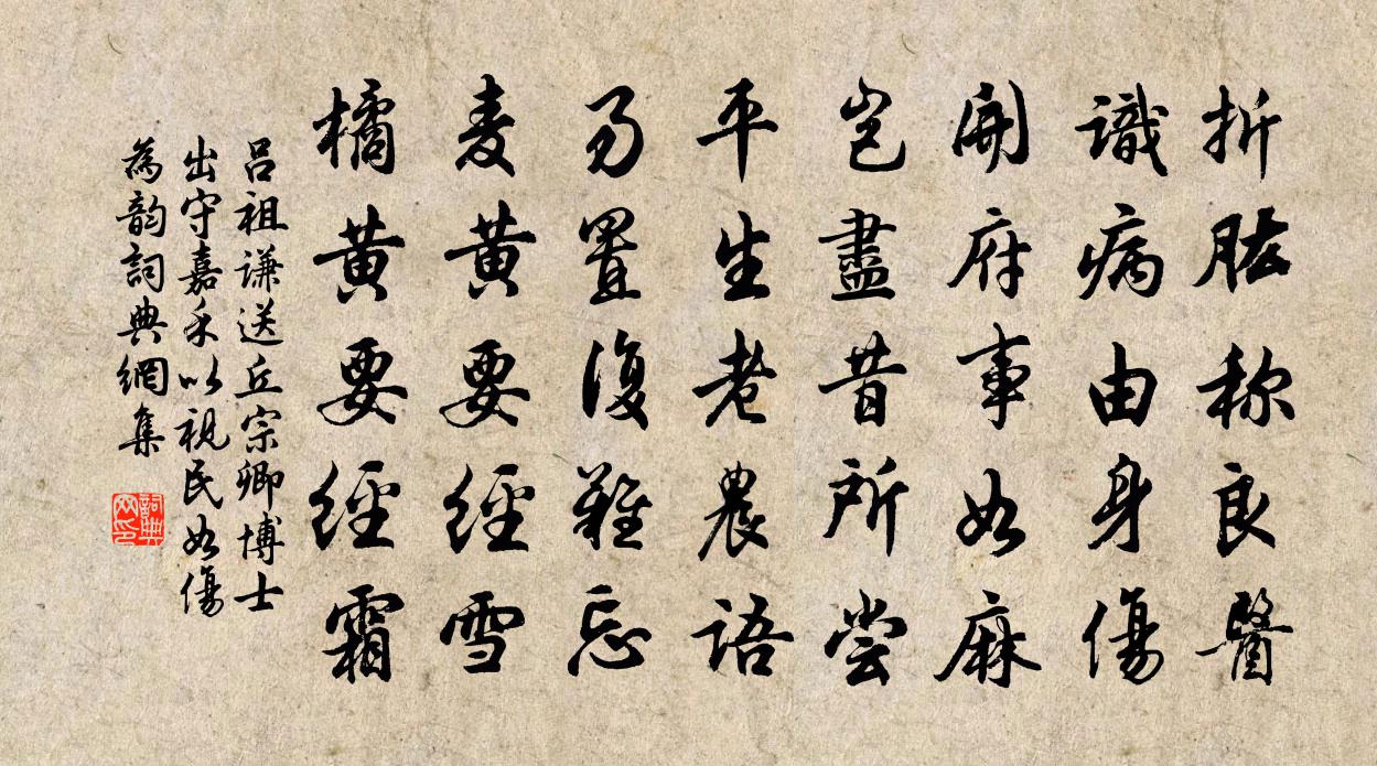 詩詞名句歷史字典書法欣賞書法字典國語詞典說文解字康熙字典古漢語字典標 題 作 者 詩 句 送丘宗卿博士出守嘉禾以視民如傷為韻作者:呂祖謙 朝代:宋代原文折肱稱良醫,識病由身傷。開府事如麻,豈盡昔所嘗。平生老農語,易置復難忘。麥黃要經雪,橘黃要經霜。詩詞問答問:《送丘宗卿博士出守嘉禾以視民如傷為韻》的作者是誰?答:呂祖謙問:該詩寫於哪個朝代?答:宋代書法欣賞送丘宗卿博士出守嘉禾以視民如傷為韻書法作品詩詞推薦頌古八首釋道印〔宋代〕霹靂未收聲,閃電不留影。三更月到窗,半夜驢覷井。快騎駿馬驟高樓,一塵不動須彌頂。題冠順之道院壁周敦頤〔宋代〕一日復一日,一杯復一杯。青山無限好,俗客不曾來。往事已如此,朱顏安在哉。寄語地上客,厲亂竟誰催。桂州西山登高上陸大夫戎昱〔唐代〕登高上山上,高處更堪愁。野菊他鄉酒,蘆花滿眼秋。風煙連楚郡,兄弟客荊州。早晚朝天去,親隨定遠侯。秋晚信州推院親友或責無書,即事寄答韓琮〔唐代〕官信安仁拙,書非叔夜慵。謬馳驄馬傳,難附鯉魚封。萬里勞何補,千年運忝逢。不量橫草力,虛慕入雲蹤。潔水八月初一駕幸延喜樓看冠帶降戎薛逢〔唐代〕城頭旭日照闌乾,城下降戎彩仗攢。九陌塵埃千騎合,萬方臣妾一聲歡。樓台乍仰中天易,衣服初回左衽難。清水雪鴣釋斯植〔宋代〕風吹蘆葦鳴,殘雪滿橋板。不見棹回人,愁立沙汀晚。仙都白鹿歌林泳〔宋代〕山中白鹿老而靈,有客有客占鹿鳴。我尋石門不知處,道人出洞歡相迎。修竹無力有我相,不應信息令渠驚。吁嗟王晉卿作《煙江疊嶂圖》,仆賦詩十四韻,晉蘇軾〔宋代〕山中舉頭望日邊,長安不見空雲煙。歸來長安望山上,時移事改應潸然。管弦去盡賓客散,惟有馬埒編金泉。渥窪留武林孫岩〔宋代〕訪客城南隅,故第何其雄,曲池猶瀁漭,土山尚巃嵷。頗聞此中人,易姓良匆匆。往時恩澤侯,意氣乾晴虹。樂曲和之美河西列岫亭司馬光〔宋代〕秋山對疏牖,羈客倦登景。雨後崗光活,晴初落照深。素波明別浦,赤葉照衰林。佇目寂無事,何人知此心。亭皋送林子高葉適〔宋代〕老我追隨亦賸人,研軒標格久成塵。意先遠水常趨海,節與修篁自作筠。諫苑舊知欣有信,漆坊新隱嘆無鄰。梅花松江舟中四首荷葉浦時有不測末句故及之戴復古〔宋代〕夜聽楓橋鍾,曉汲松江水。客行信匆匆,少住亦可喜。且食鱖魚肥,莫問鱸魚美。金陵雜興二百首蘇泂〔宋代〕輕風濕濕樹斑斑,燕乳鳩鳴春又殘。門巷狹斜無不到,有何人似柳花閒。天闕山朱存〔唐代〕牛頭天際碧凝嵐,王導無稽亦宴談。若指遠山為上闕,長安應合指終南。送友人往振武李頻〔唐代〕風沙遙見說,道路替君愁。磧夜星垂地,雲明火上樓。征鴻辭塞雪,戰馬識邊秋。不共將軍語,何因有去留。野步至近村陸游〔宋代〕耳目康寧手足輕,村墟草市遍經行。孝經章里觀初學,麥飯香中喜太平。婦女相呼同夜績,比鄰竭作事春耕。勿言陽春曲殷七七〔唐代〕愁見唱陽春,令人離腸結。郎去未歸家,柳自飄香雪。紹興釋奠武成王七首佚名〔宋代〕於赫烈武,光昭古今。載嚴祀事,敕畫惟欽。既潔其牲,毀諸其音。神之格思,來顧來歆。二十三日即事張耒〔宋代〕已逢嫵媚散花峽,不怕艱危道士磯。啼鳥似逢人勸酒,好山如為我開眉。風標公子鷺得意,跋扈將軍風斂威。到舍甲子秋八月丙辰雞初鳴時夢劉韶美示詩八篇高陸游〔宋代〕韶美仙去三十年,一念及之常悵然。秋窗忽夢接顏色,萬里老鶴歸遼天。贈詩溫其似玉瓚,我亦麤識關雎亂。建安名句推薦客路相逢難,為樂常不足。蘇軾《送頓起》 厭見千門萬戶,經過北里南鄰。王維《田園樂七首·其一》 不求同日生,只願同日死。施耐庵《水滸傳·第二回》 悄無人、桐陰轉午,晚涼新浴。蘇軾《賀新郎·夏景》 奇卓異非至人,至人只是常。洪應明《菜根譚·概論》 五更鐘動笙歌散,十里月明燈火稀。賀鑄《思越人·紫府東風放夜時》 不是暗塵明月,那時元夜。蔣捷《女冠子·元夕》 俱懷逸興壯思飛,欲上青天攬明月。李白《宣州謝朓樓餞別校書叔雲》 池上碧苔三四點,葉底黃鸝一兩聲。晏殊《破陣子·春景》 白露橫江,水光接天。蘇軾《前赤壁賦》