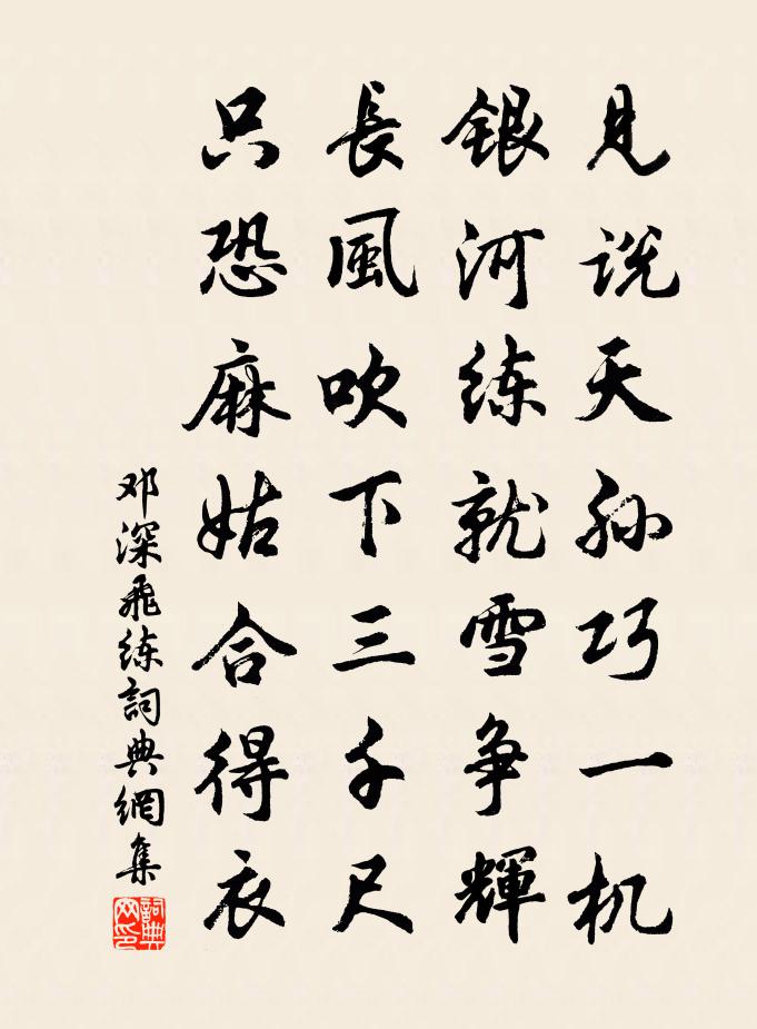 詩詞名句歷史字典書法欣賞書法字典國語詞典說文解字康熙字典古漢語字典標 題 作 者 詩 句 飛練作者:鄧深 朝代:宋代飛練原文見說天孫巧一機,銀河練就雪爭輝。長風吹下三千尺,只恐麻姑合得衣。詩詞問答問:飛練的作者是誰?答:鄧深問:飛練寫於哪個朝代?答:宋代鄧深飛練書法欣賞飛練書法作品詩詞推薦池上張鎡〔宋代〕綠卷晴荷插滿池,珍禽來慣帖船飛。看雲只似尋常立,何獨今朝忘卻歸。為侍郎徐公邦憲賦張淏〔宋代〕五花麟駒籋飛雲,鳴珂敲月曙色分。晨光炯炯照玉勒,華風熠熠生衡門。磊磊落落萬人英,氣射鬥牛貫九精。筆扛和元晦擇之有詩見懷張栻〔宋代〕作別又如許,何當置我旁。卷舒書在手,展轉月侵床。合志師千載,相思謾一方。臨風三嘆息,此意渺難量。幽趣十二首鄭剛中〔宋代〕幽趣無人會,清閒五月中。魚跳荷葉綠,猿笑荔枝紅。撥竹看新月,鉤簾入好風。神仙赤松地,正恐自相通。長安懷古儲嗣宗〔唐代〕禍稔蕭牆終不知,生人力屈盡邊陲。赤龍已赴東方暗,黃犬徒懷上蔡悲。面缺崩城山寂寂,土埋冤骨草離離。秋風和李梅外韻以傷邑士之無朋趙必象〔宋代〕兀兀規規鐵限門,鬚眉妾婦篇遍吾村。蜀南見日犬群吠,井底觀天蛙自尊。守望誰為鄉里助,典型藉有老成存。書和斯立見還詩卷晁說之〔宋代〕神仙劉子夏,不愧許遠遊。今日秋風客,襟度更為優。如何琅玕紙,亦作李相投。釋之還在手,愛涎隨不收。霜渚病中九首劉克莊〔宋代〕間或擊強非果弱,未嘗束濕自然嚴。起惟吏畏三風訓,先為民蠲再榷鹽。時與青油賓唯諾,尤於白屋士勞謙。懸知秋江漁樂圖為邑人宗正純撰姜德明〔宋代〕楓樹蕭蕭霜葉紅,蘆花瑟瑟鳴西風。漁翁舉網秋江上,輕舟一葉波溶溶。群魚游泳影相續,密網收來心易足。赤鱗句蔡肇〔宋代〕柳間黃鳥路,波底白頭天。謹和老人惠山泉二首洪咨夔〔宋代〕第二水泉動,斜三封印通。愛奇親煮雪,得雋細生風。酒肺蘇將渴,詩情洗盡窮。娉婷須好買,供奉讀書公。雒城作羅隱〔唐代〕大鹵旌旗出洛濱,此中煙月已埃塵。更無樓閣尋行處,只有山川識野人。早得鑄金夸范蠡,旋聞垂釣哭平津。舊遊偈頌一百五十首釋心月〔宋代〕峭峻門庭,平白道路。擔板睦州,面壁魯粗。不問南來北來,東去西去,須信長年不出戶。樓居真山民〔宋代〕攜書來過此,便覺少塵埃。檐冷留雲宿,窗明報月來。閒愁山隔斷,幽夢鳥呼回。湖海元龍氣,從渠俗子猜。雪中呈社友林尚仁〔宋代〕風雨蕭蕭攪雪飛,一寒如此只貪詩。酒瓢傾盡囊金少,恐被梅花笑不知。游清潭呂資益蟠谷絕得徑劉過〔宋代〕一花帶蕊香氣滿,何況叢生樹兩行。風露益高秋雨足,請君來此撼琳琅。李少府廳吊李元賓遺字孟郊〔唐代〕零落三四字,忽成千萬年。那知冥寞客,不有補亡篇。斜月吊空壁,旅人難獨眠。一生能幾時,百慮來相煎。戚戚觀德堂李垂〔宋代〕園池氣象明,池沼春波平。東匯有朝勢,北源無滯聲。臨流好鼓瑟,待月堪浮觥。濯足思餘綠,洗心思雲清。篆溝窾木詩李洪〔宋代〕窾木饕風耐歲寒,輪囷入用固知難。不才果得全樗散,用伴幽人澗谷盤。楊秘校秋懷宋祁〔宋代〕治畹當樹蘭,治林當植桂。蘭生可香國,桂茂絕聚薈。邈哉志士節,所趣與人異。意經千古上,心包九垠際。道勝名句推薦獸爐沉水煙,翠沼殘花片。一行寫入相思傳。張可久《塞鴻秋·春情》 鐵衣霜露重,戰馬歲年深。戎昱《塞下曲·其六》 三月殘花落更開,小檐日日燕飛來。王令《送春》 親戚不附,無務外交。墨子《墨子·02章 修身》 凡人有疾,不時即治,隱忍冀差,以成痼疾。張仲景《傷寒論·傷寒例》 拜華星之墜幾,約明月之浮槎。文天祥《回董提舉中秋請宴啟》 花果山福地,水簾洞洞天。吳承恩《西遊記·第一回》 桃李春風一杯酒,江湖夜雨十年燈。黃庭堅《寄黃幾復》 關山萬里不可越,誰能坐對芳菲月。盧思道《從軍行》 李白如今已仙去,月在青天幾圓缺?唐寅《把酒對月歌》