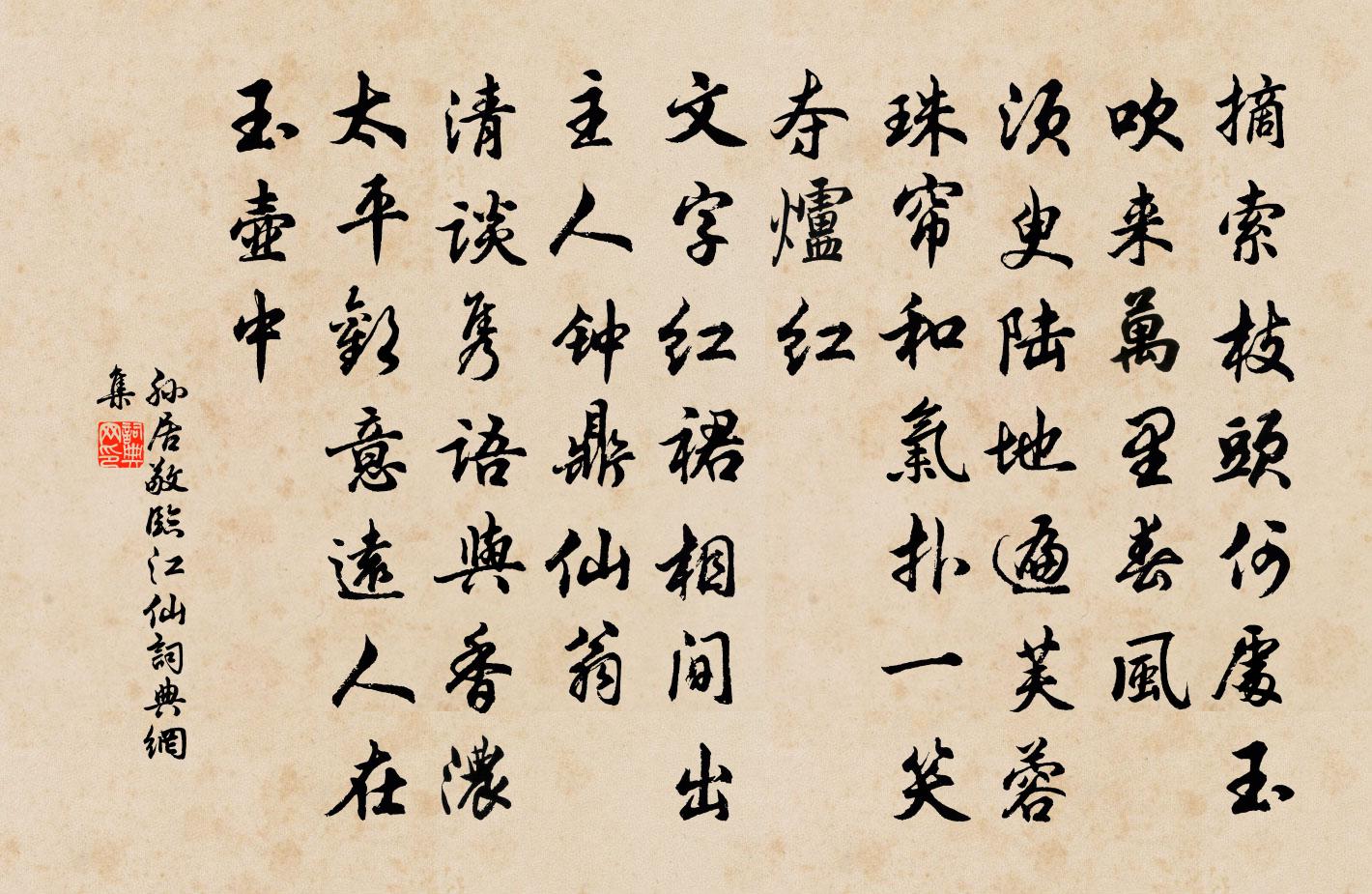 詩詞名句歷史字典書法欣賞書法字典國語詞典說文解字康熙字典古漢語字典標 題 作 者 詩 句 臨江仙作者:孫居敬 朝代:宋代臨江仙原文摘索枝頭何處玉,吹來萬里春風。須臾陸地遍芙蓉。珠簾和氣撲,一笑奪爐紅。文字紅裙相間出,主人鐘鼎仙翁。清談雋語與香濃。太平歡意遠,人在玉壺中。詩詞問答問:臨江仙的作者是誰?答:孫居敬問:臨江仙寫於哪個朝代?答:宋代問:臨江仙是什麼體裁?答:詞孫居敬臨江仙書法欣賞臨江仙書法作品詩詞推薦代人上師垣生辰仲並〔宋代〕已聞鼙鼓靜邊陲,初見絲綸寵帝師。寰宇一新周禮樂,廣庭重用漢威儀。江南江北無他事,春後春前更此時。舉盞將到岩洞油雲忽作驟雨滂霈黃朝散〔宋代〕寸心憂旱隱如焚,默念僖心閔雨勤。欲到九龍巖數里,霈然甘澤副油雲。早春司馬光〔宋代〕璿霄轉斗車,春意逼梅花。熟寐侵街鼓,閒情到酒家。晴陽浮地末,寒色斂天涯。歸雁空餘跡,朝來印浦沙。醉歸陸游〔宋代〕十畝春蕪手自犁,瓜牛廬在鏡湖西。禪心每笑彈棋局,道眼長捐刮膜篦。絕食就官分鶴料,無車免客笑雞棲。旗亭十一夜無寐懷九日南山之游方回〔宋代〕代步僅一馬,奄忽乏敝帷。扶輿陟南山,幸有淵明兒。樹陰玩苔蘚,稍讀古板碑。江湖豈無人,不如僧能詩。穩坐再次韻為謝周麟之〔宋代〕公詩律嚴如用兵,江淮草木先知名。少當千人掃文陣,晚策百勝攻愁城。詩壇老將天下傑,筆倒三江流萬折。時將山行羅與之〔宋代〕菸草淒迷露未晞,一筇伴我立晴暉。丹楓雖老猶多態,散作漫山野蝶飛。戈陽道中趙汝鐩〔宋代〕千里嘆行役,今朝方半途。橘肥霜後顆,松落雨中須。店嫗當壚問,官人要酒無。忻逢掃愁帚,沽了又還沽。劉公佐親家奉議輓詞二首楊萬里〔宋代〕一命華其老,諸昆半作官。相高仍孝悌,不但盛衣冠。近別那雲訣,臨喪獨忍看。心知公不恨,我自淚難乾。為柴懷叔殿院題世彩堂喻良能〔宋代〕慶積門闌久,祥鍾家世醲。乘驄驚創見,戲彩覺重逢。鮐耋頻三喜,孫曾見八龍。年齡開九秩,孫子章千鍾。奕葉余床帳為過兵捲去答梅山弟用餘韻見寄陳著〔宋代〕一床破帳護衰翁,席捲俄隨掠騎東。與婦同圍膚炭火,呼兒排作肉屏風。從來不起羊羔想,困倒何妨蝶夢通。亂世上藍和尚晉漢二代讖佚名〔唐代〕石榴花發石榴開。句許玠〔宋代〕宇宙雙蓬鬢。吳下同年會詩趙彥璦〔宋代〕引睇龍門念久違,自題雁塔會何稀。賓士蓮幕只甘分,只尺星台喜有依。拱侍尊罍陪盛事,仰瞻刑政煥清暉。我公詠漁父徐僑〔宋代〕占得江湖汗漫天,了無鄉縣掛民編。賣魚買酒醉日日,長是太平無事年。偈頌七十六首釋師範〔宋代〕韶光去也誰能留,長江袞袞無暫休。人生既老不復少,此心未了空悠悠。詗斛峰李純父右司趙汝騰〔宋代〕衰拙新來領建安,郡齋夜夢繞餘干。東都得爾名節重,西賊聞之心膽寒。海內四賢尚家食,閩中一叟愧空餐。幔亭孤興賀朝〔唐代〕晴日暖珠箔,夭桃色正新。紅粉青鏡中,娟娟可憐嚬。君子在遐險,蕙心誰見珍。羅幕空掩晝,玉顏靜移春。江瑟勸農六首張嵲〔宋代〕出郭循溪路向東,隼旟悠颺滿春風。峰巒沐霧尚陰澹,桃李出牆能白紅。夏秋之交小舟早夜往來湖中絕句陸游〔宋代〕娥江道上欲三更,垣屋參差閉月明。倚柂賦詩無傑思,斷腸分付棹歌聲。名句推薦攀出牆朵朵花,折臨路枝枝柳。關漢卿《一枝花·不伏老》 一葉度春風,芳芳自相接。蕭衍《芳樹》 遲日園林悲昔游,今春花鳥作邊愁。杜審言《渡湘江》 棲鴉流水點秋光,愛此蕭疏樹幾行。紀映淮《詠秋柳》 紅日淡,綠煙晴。流鶯三兩聲。晏幾道《更漏子·柳絲長》 血染紅箋,淚題錦句。西湖豈憶相思苦。劉將孫《踏莎行·閒遊》 酒是燒身硝焰,色為割肉鋼刀馮夢龍《警世通言·卷十一》 三冬暫就儒生學,千耦還從父老耕。陸游《觀村童戲溪上》 財不患其不得,患財得,而不能善用其財王永彬《圍爐夜話·第四四則》 學者不患才之不贍,而患志之不立。徐幹《中論·上卷·治學》