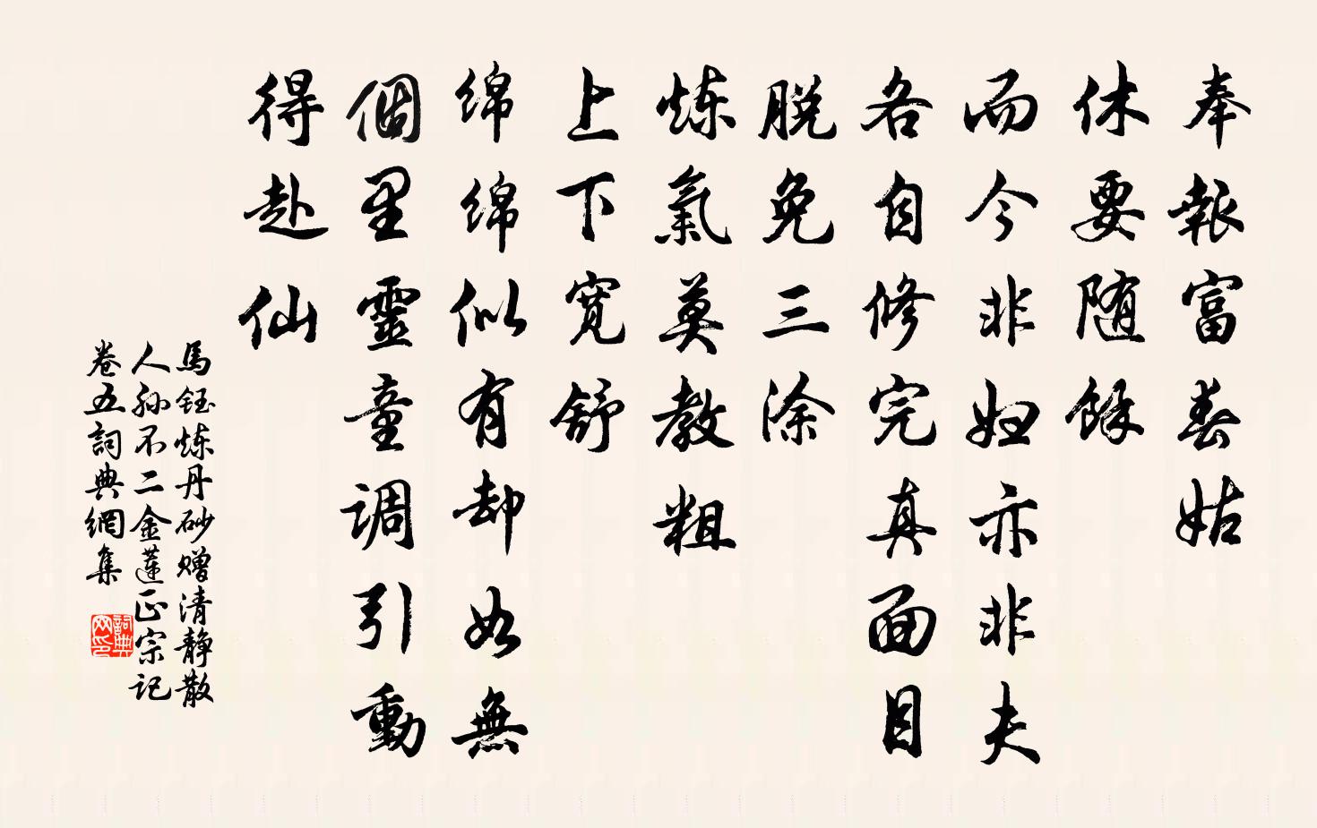 詩詞名句歷史字典書法欣賞書法字典國語詞典說文解字康熙字典古漢語字典標 題 作 者 詩 句 煉丹砂 贈清靜散人孫不二 金蓮正宗記卷五作者:馬鈺 朝代:元代原文奉報富春姑。休要隨余。而今非婦亦非夫。各自修完真面目,脫免三塗。鍊氣莫教粗。上下寬舒。綿綿似有卻如無。個裡靈童調引動,得赴仙詩詞問答問:《煉丹砂 贈清靜散人孫不二 金蓮正宗記卷五》的作者是誰?答:馬鈺問:該詩寫於哪個朝代?答:元代問:該詩是什麼體裁?答:詞書法欣賞煉丹砂 贈清靜散人孫不二 金蓮正宗記卷五書法作品詩詞推薦和呂巽伯韻徐僑〔宋代〕何事貪乘逆水船,此心長向白雲邊。琴書篷底一樽酒,花柳江頭三月天。逸興只將詩句遣,清襟那就俗塵牽。簿書送沈信臣赴試南宮五首韓元吉〔宋代〕吾謀不用可無人,小技文章亦有神。一第區區兒戲耳,請君折取桂為薪。移岳州去房陵道中見海棠張舜民〔宋代〕馬息山前見海棠,群仙會處錦屏張。天寒日晚行人絕,自落自開還自香。五美吟·紅拂曹雪芹〔清代〕長揖雄談態自殊,美人巨眼識窮途。尸居餘氣楊公幕,豈得羈縻女丈夫?贈興平鄭明府耿湋〔唐代〕海內兵猶在,關西賦未均。仍勞持斧使,尚宰茂陵人。遙夜重城掩,清宵片月新。綠琴聽古調,白屋被深仁。跡與偈頌二十九首釋雲〔宋代〕丹霞燒木佛,院主眉須落。官里有吸條,許人私結約。傝{耨耒換沈去氵}杜禪和,識情爭卜度。休卜度,萬里遼句朱浚〔宋代〕明明採石兵前樣,參贊歸來即近臣。元道士釋師範〔宋代〕黃衣捨去混緇衣,棄卻甜桃摘醋梨。酸澀一時嘗過了,攢眉歸去許誰知。朝中措范成大〔宋代〕身閒身健是生涯。何況好年華。看了十分秋月,重陽更插黃花。消磨景物,瓦盆社釀,石鼎山茶。飽吃紅蓮香飯,行春次俞兄韻吳龍翰〔宋代〕幾日春愁不出行,園林又是了清明。春風桃李一場夢,夜月江山千古情。吟倚長松伺鶴到,坐臨釣石看雲生。此懷齊天樂丁默〔宋代〕倦雲休雨風還作,交相醒花蘇柳。字滿吟灰,痕添坐席,贏得新愁痴守。歸期未有。負小院移蘭,故園嘗韭。謾道舟行即事杜荀鶴〔唐代〕年少髭鬚雪欲侵,別家三日幾般心。朝隨賈客憂風色,夜逐漁翁宿葦林。秋水鷺飛紅蓼晚,暮山猿叫白雲深。重陽九日奉陪令公登白樓同詠菊盧綸〔唐代〕瓊尊猶有菊,可以獻留侯。願比三花秀,非同百卉秋。金英分蕊細,玉露結房稠。黃雀知恩在,銜飛亦上樓。汝南灣馬之純〔宋代〕當時只號汝南灣,後有三人住此間。自謂逸民須隱約,並稱賢士想高閒。只緣水味都殊異,且欲鄰居數往還。好是玉樓春(五之三·大石調)柳永〔宋代〕皇都今夕如何夕。特地風光盈綺陌。金絲玉管咽春空,蠟炬蘭燈燒曉色。鳳樓十二神仙宅,珠履三千鵷鷺客。金吾懷南嶽隱士二首(一作贈隱者)貫休〔唐代〕千峰映碧湘,真隱此中藏。餅不煮石吃,眉應似髮長。風榸支酒瓮,鶴虱落琴床。雖斅忘機者,斯人尚未忘。見說論翅賈似道〔宋代〕紫翅青金翅,木翅與油單。黑色全如墨,梅花兩瓣攢。松闊偕長短,蓑衣得更難。遮身不見節,薄縐另相看。雁朱乘〔宋代〕八月新霜岸草枯,數聲哀怨雁來初。憑君試向沙汀看,恐帶匈奴二帝書。正肅吳公輓詩二首文同〔宋代〕虎節歸兵日,麟符命使年。帝將還二府,人已哭三川。清議誰違者,高風自凜然。佳城空萬古,一壙掩寒煙。游溫陵得未得之士四人作四愛詩贈茂功茂叔王邁〔宋代〕吾愛清源徐茂功,聲名捷出日方樂。高尻一首紛餘子,屈指論心幾鉅公。我定斯文宜館閣,人言科目滯英雄。直須名句推薦離別家鄉歲月多,近來人事半消磨。賀知章《回鄉偶書二首》 月兒彎彎照九州,幾家歡樂幾家愁。佚名《月兒彎彎照九州》 亦有白骨歸鹹陽,營家各與題本鄉。王建《渡遼水》 羈鳥戀舊林,池魚思故淵。陶淵明《歸園田居·其一》 父子有親,君臣有義,夫婦有別,長幼有序,朋友有信。孟子《孟子·滕文公章句上·第四節》 冥冥寒食雨,客意向誰親?劉一止《冥冥寒食雨》 汗血每隨邊地苦,蹄傷不憚隴陰寒。萬楚《驄馬》 閣道步行月,美人愁煙空。李白《上之回》 古者春夏二氣,不決重罪。姚思廉《陳書·本紀·卷三》 去歲江南見雪時,月底梅花發。張孝祥《卜運算元·雪月最相宜》