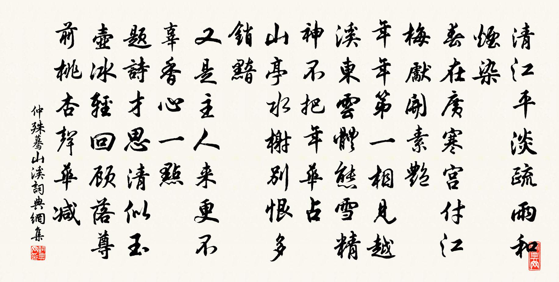 詩詞名句歷史字典書法欣賞書法字典國語詞典說文解字康熙字典古漢語字典標 題 作 者 詩 句 驀山溪作者:仲殊 朝代:宋代驀山溪原文清江平淡,疏雨和煙染。春在廣寒宮,付江梅、先開素艷。年年第一,相見越溪東,雲體態,雪精神,不把年華占。山亭水榭,別恨多銷黯。又是主人來,更不辜、香心一點。題詩才思,清似玉壺冰,輕回顧,落尊前,桃杏聲華減。詩詞問答問:驀山溪的作者是誰?答:仲殊問:驀山溪寫於哪個朝代?答:宋代問:驀山溪是什麼體裁?答:詞仲殊驀山溪書法欣賞驀山溪書法作品詩詞推薦歲除虞儔〔宋代〕除日催人不奈頻,那堪月小不圓旬。誰能椒頌花如錦,自寫桃符筆有神。通夕留連分歲客,明朝多少賀年人。壽觴春興七首白玉蟾〔宋代〕望中白鳥入空無,一帶青山似畫圖。宿雨初醒雲半斂,垂楊微困水平鋪。過界首胡仲參〔宋代〕幾重嶺隔幾重灣,路入蒙蒙煙雨間。獨立溪橋重回首,前頭已是劍州山。玲瓏四犯劉之才〔宋代〕幾疊雲山,隔不斷闌乾,天外凝眺。秋與愁並,梧逕雨痕先表。嬌夢半握芙蓉,奈曲曲、翠屏深窈。問愁根,當年夕成彥雄〔唐代〕台榭沈沈禁漏初,麝煙紅蠟透蝦須。雕籠鸚鵡將棲宿,不許鴉鬟轉轆轤。臨江仙朱敦儒〔宋代〕直自鳳凰城破後,掰釵破鏡分飛。天涯海角信音稀。夢回遼海北,魂斷玉關西。月解重圓星解聚,如何不見人歸。亥月徐璣〔宋代〕亥月霜澄霽,幽窗晚更明。文書隨意閱,蘭菊與心清。洗硯須池暖,燃香得火輕。妻拿渾笑我,作計亦平平。四安道中所見牟巘五〔宋代〕薄酒三杯醉不成,雨敲疏瓦見分明。破衾判作空階滴,滴到乾時也解晴。蝶戀花程垓〔宋代〕晴日溪山春可數。水繞池塘,知有人家住。尋日尋花花不語。舊時春恨還如許。苦恨東風無意緒。只解催花,不解訴衷情近(二之二·林鐘商)柳永〔宋代〕景闌晝永,漸入清和氣序。榆錢飄滿閒階,蓮葉嫩生翠沼。遙望水邊幽徑,山崦孤村,是處園林好。閒情悄。綺陌春盡日戴復古〔宋代〕撚指過三月,又當春夏交。花殘蜂課蜜,林茂鳥安巢。芳草生青靄,新篁展綠稍。風騷將斷絕,誰有續弦膠。曾宏甫餉溪山堂南坡胯新茶曾幾〔宋代〕溪山寶胯能分我,不但禪房破睡魔。便覺胸中有丘壑,免教辛苦上南坡。奉酬稚春梅花行林亦之〔宋代〕草堂梅花千萬枝,新詩品題何太奇。可憐一枝非凡群,賞心何人空自珍。請與君談別花人,如或見之當俯身。西湖和劉與可二首王之道〔宋代〕野塘春草遍,芳樹老藤纏。遠信占黃耳,清游任白顛。山光晴抹黛,湖氣暖騰煙。我有邊韶癖,何妨晝日眠。過磨盤得風掛帆楊萬里〔宋代〕兩岸黃旗小隊兵,新晴皈路馬蹄輕。全番長笛橫腰鼓,一曲春風出塞聲。鵲噪鴉啼俱喜色,船輕風須更兼程。卻思舟行用前韻懷祝子權仲並〔宋代〕楊枝巧作腰支弱,不分小桃紅入萼。風光向人但嫵媚,客子那知行路惡。短篷蕩漾晴波裹,取次茶深酒薄薄。所思和周子充侍郎見寄樂府戲贈之作范成大〔宋代〕釣海風水急,登樓塵霧高。不如岸綸巾,春船攜小橋。芳草含奇薰,光景上東壁。桂林那辦此,辦作安昌客。六絕句呈趙帥兼簡鄭機宜陳造〔宋代〕蒲鞭合束久停檛,暮府人閒早放衙。頻喚羊何把詩筆,即看姚魏用年華。題北村六首張載〔宋代〕不堪煩暑病荒城,六月倏然寓野亭。珍重南山且歸去,再來相望雨中青。浪淘沙陳著〔宋代〕年事夕陽紅。霜滿髯叢。摩挲蒼蘚石婆翁。能見幾人曾百歲,一笑書空。回首棣華中。消得春濃。平生心事兩惺憁名句推薦曲屏先暖鴛衾慣,夜寒深、都是思量。吳文英《風入松·為友人放琴客賦》 二月黃鶯飛上林,春城紫禁曉陰陰。錢起《贈闕下裴舍人》 一生大笑能幾回,斗酒相逢須醉倒。岑參《涼州館中與諸判官夜集》 獨立雕欄,誰憐枉度華年。王沂孫《高陽台·殘萼梅酸》 春蠶到死絲方盡,蠟炬成灰淚始乾。李商隱《無題·相見時難別亦難》 欲共柳花低訴,怕柳花輕薄,不解傷春。黃孝邁《湘春夜月·近清明》 娶妻莫恨無良媒,書中自有顏如玉。趙恆《勸學詩》 鎮日思歸歸未得,孤負殷勤杜宇。王瀾《念奴嬌·避地溢江書於新亭》 池上憑闌愁無侶。奈此個、單棲情緒。柳永《甘草子·秋暮》 庭樹不知人去盡,春來還發舊時花。岑參《山房春事二首》