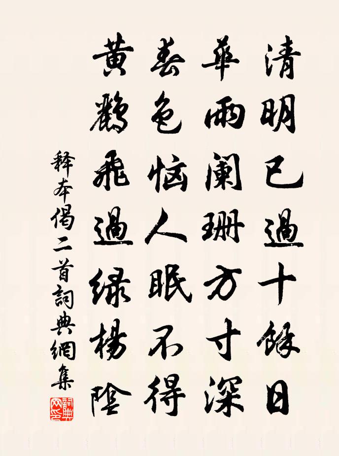 - 一庭春色惱人來,滿地落花紅幾片。魏承班《玉樓春·寂寂畫堂樑上燕》