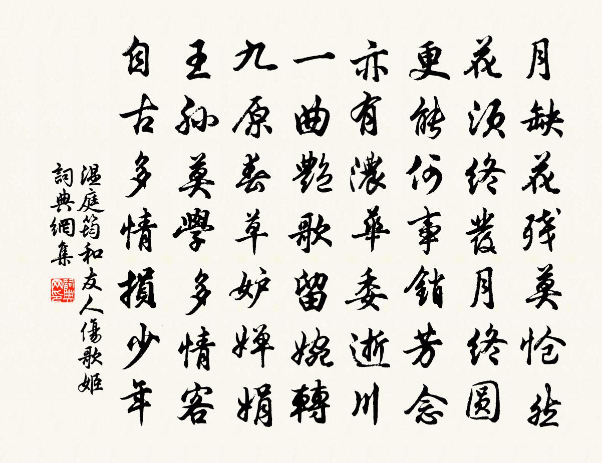 作者友人歌姬去世,此詩為勸慰友人而作。首句謂月缺花殘乃人間既不可避免又常有之事,不必過度傷心,次句是寬慰友人之語。三句謂自己能理解友人,誠無他事可阻止友人傷悼歌姬之念,然而落花隨川流東去亦是常有之事,不獨歌姬獨亡。五六句讚美歌姬,謂便是墓草也應嫉妒其婉轉之歌聲和嬋娟之美色,同時也表達了飛卿對歌姬“委逝川”的同情和憐惜。末二句謂友人當節哀,自古多情之人哀傷過度,除自損外,對亡人實無益處,況且亡人於九泉之下亦未必願意看到未亡人因過分哀傷而自損的結果。 全詩以勸慰為主,其間穿插對歌姬的讚美與同情是為了把自己與友人劃為同類,使友人覺得飛卿亦真為佳人“委逝川”而悲痛。眾所周知,同病之人往往可以互憐,同病之人互相勸慰的言語往往也比局外人的話更能觸動人心,飛卿如此寫,大概有此目的。