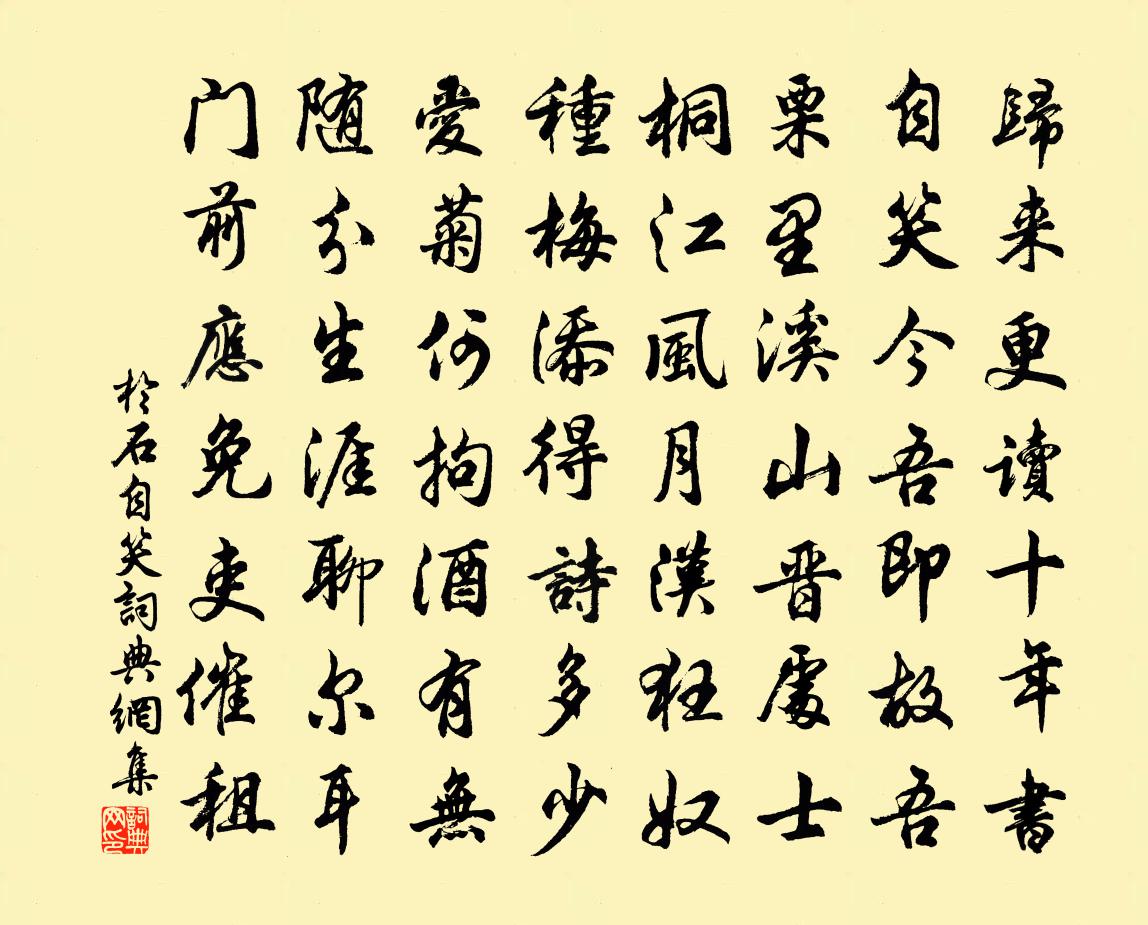 詩詞名句歷史字典書法欣賞書法字典國語詞典說文解字康熙字典古漢語字典標 題 作 者 詩 句 自笑作者:於石 朝代:宋代自笑原文歸來更讀十年書,自笑今吾即故吾。栗里溪山晉處士,桐江風月漢狂奴。種梅添得詩多少,愛菊何拘酒有無。隨分生涯聊爾耳,門前應免吏催租。詩詞問答問:自笑的作者是誰?答:於石問:自笑寫於哪個朝代?答:宋代於石自笑書法欣賞自笑書法作品詩詞推薦和楊直講寒食感懷蘇頌〔宋代〕永日輕風起暝陰,傷春情緒苦難禁。流連節物遊人意,悵惜時光志士心。桃李新芳添遠思,龍蛇遺事感悲吟。知君瑞庭花引莫蒙〔宋代〕對畫簾卷,正鉤掛蝦須細錦幄。展鳳屏。開朱戶。初啟寶獸,香飄龍麝,裊裊煙成穗。神仙宴滿座,瑞色籠金翠。送道人歸舊岩方乾〔唐代〕舊岩終副卻歸期,岩下有人應識師。目睹嬰孩成老叟,手栽松柏有枯枝。前山低校無多地,東海淺於初去時。若把賀新郎盧炳〔宋代〕池管閒凝目。有玉人、向晚妖嬈,洗妝梳束。雅淡容儀妃子樣,羞使胭脂點觸。瑩冰雪、精神難掬。好是月明微露送李舍人歸蘭陵里楊巨源〔唐代〕清詞舉世皆藏篋,美酒當山為滿樽。三畝嫩蔬臨綺陌,四行高樹擁朱門。家貧境勝心無累,名重官閒口不論。惟有登樓歌王維〔唐代〕聊上君兮高樓,飛甍鱗次兮在下。俯十二兮通衢,綠槐參差兮車馬。卻瞻兮龍首,前眺兮宜春。王畿郁兮千里,山北郭貧居孟郊〔唐代〕進乏廣莫力,退為蒙籠居。三年失意歸,四向相識疏。地僻草木壯,荒條扶我廬。夜貧燈燭絕,明月照吾書。欲識和放翁社日四首社鼓方岳〔宋代〕冬冬枌榆社,坎坎桑竹野。初非有均度,意欲薄豳雅。侯家按新聲,視此寧勿赭。且從群兒嬉,吾耒已可把。題武夷山鐘模石劉子羽〔宋代〕誰鑄三鍾欒乳形,不須筍簴自能鳴。仙君欲奏賓雲曲,只感清霜便發聲。題靜齋稿沈平〔宋代〕斯道在人心,如蚌藏圓珠。散作明月光,斂則止水虛。廣勝寺王淵亭〔宋代〕春嶺碧嵯峨,公餘載酒過。紅塵隨地少,野意近山多。泉溜寒鳴玉,楊花碎剪羅。歸衫未能著,斜日上松坡。趙山台蓮花方丈釋了惠〔宋代〕一芙蕖是一毗耶,一葉春風一室開。三萬二千師子座,藕絲竅裹涌將來。正旦上壽紫宸微臣以祀太一初獻不預賜茶酒退程公許〔宋代〕去歲楓橋度歲除,寒燈一盞自抄書。誰知東觀歸繙史,仍許西垣綴佩琚。四辟不憂獰虎豹,九成猶恐眩鶢鶋。彤墀潯陽江口阻風三日黃庭堅〔宋代〕枯桑最知天風高,旅人更覺時序迫。去年解官出北門,猶纜江船依賈客。狙公七芧富貴天,喜四怒三俱可憐。湖口雜詠八首王安石〔宋代〕古風致遜悌,班白見尊優。薄俗謬為恭,獨在勢權尤。伏波迷俯迎,愛禮坐成仇。齗齗洙四間,豈是老者羞。懷陸仲仁李處權〔宋代〕陸郎好古心不俗,雅似王郎愛修竹。綠陰清晝坐焚香,想見人琴兩如玉。尺書招我我未暇,興發從君醉醽醁。秋風憶薦福寺牡丹胡宿〔唐代〕十日春風隔翠岑,只應繁朵自成陰。樽前可要人頹玉,樹底遙知地側金。花界三千春渺渺,銅槃十二夜沈沈。雕槃乞巧同蘧庵先生賦陳維崧〔清代〕碧雲耿耿,見銀河低瀉。人在針樓曝衣罷。告天孫、臣本屠釣江東,疏拙甚,願以蛛絲巧借。天孫含笑答:見事卿和永叔內直晨出馬上口占韓維〔宋代〕天門朝日照崔嵬,車騎雍容下禁台。清景每將詩思遣,高情不為寵名回。山林豈要須長往,軒冕當知是儻來。欲與紹興以後祀五方帝六十首佚名〔宋代〕[姑洗羽一奏]溫然仁矣,熙然春矣。龍駕帝服,穆將臨矣。我酒清矣,我餚洱矣。我樂備矣,我神顧矣。名句推薦燕子飛來窺畫棟,玉鉤垂下簾旌。歐陽修《臨江仙·柳外輕雷池上雨》 岸邊兩兩三三,浣沙游女。柳永《夜半樂·凍雲黯淡天氣》 愁損翠黛雙蛾,日日畫闌獨憑。史達祖《雙雙燕·詠燕》 徘徊將何見?憂思獨傷心。阮籍《詠懷八十二首·其一》 鳥雀不知郊野好,穿花翻戀小庭中。高珩《春日雜詠》 蕙風如薰,甘露如醴。左思《三都賦》 箭徑酸風射眼,膩水染花腥。吳文英《八聲甘州·靈岩陪庾幕諸公游》 狗馬飾雕文,土木被緹繡。范曄《後漢書·列傳·宦者列傳》 河水洋洋,北流活活詩經《碩人》 黃雲連白草,萬里有無間。王鎡《塞上曲》