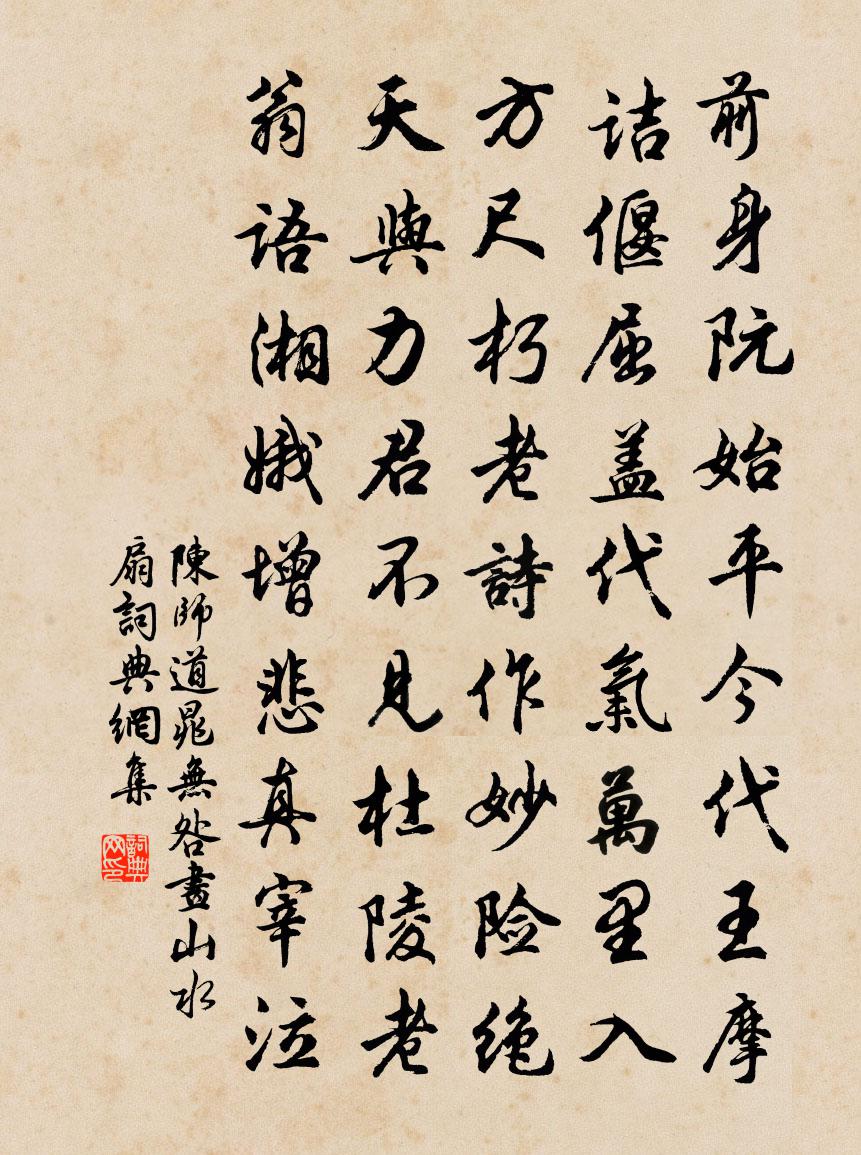 詩詞名句歷史字典書法欣賞書法字典國語詞典說文解字康熙字典古漢語字典標 題 作 者 詩 句 晁無咎畫山水扇作者:陳師道 朝代:宋代晁無咎畫山水扇原文前身阮始平,今代王摩詰。偃屈蓋代氣,萬里入方尺。朽老詩作妙,險絕天與力。君不見杜陵老翁語,湘娥增悲真宰泣。詩詞問答問:晁無咎畫山水扇的作者是誰?答:陳師道問:晁無咎畫山水扇寫於哪個朝代?答:宋代問:陳師道的名句有哪些?答:陳師道名句大全陳師道晁無咎畫山水扇書法欣賞晁無咎畫山水扇書法作品詩詞推薦初還故居岳珂〔宋代〕元是戶山莫逆交,宮亭西畔著衡茅。盟鷗似怯經新浪,怨鶴還知宿故巢。一沼種蓮衣可制,萬竿脫籜杖輕敲。不須華陽吟三十首白玉蟾〔宋代〕拄杖隨身入武夷,幔亭峰下雪花飛。行從九曲山頭看,萬壑千岩翠打圍。鄂州節推陳榮緒惠示沿檄崇陽道中六詩老懶不黃庭堅〔宋代〕俗物常偪塞,令人眼生白。永懷洛陽人,談詩論畫壁。青山吐秋月,阻作南樓客。但歌靡鹽詩,賞此無瑕璧。到淨慈展墓次韻吳棣窗陳著〔宋代〕有客肯尋僧,新吟漬剡藤。交情自秋月,浮世看春冰。猶顧慈雲榻,相期元夜鐙。我來當付約,樓上看陳登。修覺寺晁公溯〔宋代〕山繞象耳北,堰橫龍爪西。遙瞻蜀玉壘,不減漢金堤。未合三江水,仍通百社溪。春流已可愛,散亂浴鳧鷖。岐路鮑溶〔唐代〕北風送微寒,徒侶勤遠征。憂人席不暖,殘月馬上明。飄飄岐路間,長見日初生。重嶂曉色淺,疏猿寒啼清。人間次折仲古樞密韻寄題耒陽曹欽臣彥若藏書室周必大〔宋代〕讀書清淨業,病亦與心違。簡蠹蟫穿字,帙藏蛛織衣。羨君傳七略,何日款重闈。不憚浮湘去,其如失步歸。寄獻僕射相公王禹偁〔宋代〕聖君宵旱念生民,重命甘盤秉國鈞。引馬但傳三刻漏,喘牛休問四時春。羹和舊鼎黃金鉉,雪壓新堤白玉塵。應念己卯十月一日至燕越五日罹狴犴有感而賦文天祥〔宋代〕風前泣燈影,日下泣霜花。鍾信忽然動,屋陰俄又斜。悶中聊度歲,夢裡尚還家。地獄何須問,人間見夜叉。朝中措周必大〔宋代〕乘成台上曉書雲。黃色映天庭。已謝浮名浮利,也知來應長生。邊亭臥鼓,餘糧棲畝,朝野歡聲。從此四時八節,段宥廳孤桐王昌齡〔唐代〕鳳凰所宿處,月映孤桐寒。槁葉零落盡,空柯蒼翠殘。虛心誰能見,直影非無端。響發調尚苦,清商勞一彈。漳南十詠南溪蔡襄〔宋代〕近郭溪光綠好裁,雨晴波底敞樓台。蔭堤佳樹千圍合,掠水輕一舟一箭開。驚釣寒魚拖糝去,忘機閒鳥信潮回。官箋年老逢春八首美酒飲教微醉後邵雍〔宋代〕箋云:瓮頭噴液處,盞面起花時。有客來相訪,通名曰伏羲。送趙憲御史赴江西三絕蘇籀〔宋代〕賈生纂著五十八,元嘆風規自伯喈。貪吏革心寬貶坐,頑甿耒耜不椎埋。送沈善昌朝趙蕃〔宋代〕論契繇先世,言交自乃翁。俱成落湖外,每恨隔湘中。得見無幾見,願同終罕同。如聞工賦好,無或嗜詩窮。墨花(並敘)蘇軾〔宋代〕世多以墨畫山水竹石人物者,未有以畫花者也。汴人尹白能之,為賦一首。造物本無物,忽然非所難。花心起墨暈滁上謫居王禹偁〔宋代〕敢嘆我命薄,所嗟吾道消。謫官淮上老,京信日邊遙。巧宦或五鼎,甘貧唯一瓢。居然古人事,名跡詎相饒。續八詠千年增舊觀唐仲友〔宋代〕增舊觀,舊觀已雲美。棟宇未翬飛,賢侯為興起。昔時兮清賞,昔日兮清文。揮弦兮歸雁,隱几兮浮雲。八篇合綺燕歌行賈至〔唐代〕國之枕重鎮惟幽枕都,東威枕九夷北制胡。五軍精卒三十萬,百戰百勝擒單于。前臨滹沱後易水,崇山沃野亘千里同兒輩賦未開海棠二首元好問〔金代〕翠葉輕籠豆顆勻,胭脂濃抹蠟痕新。殷勤留著花梢露,滴下生紅可惜春。名句推薦別來半歲音書絕,一寸離腸千萬結。韋莊《應天長·別來半歲音書絕》 樓前綠暗分攜路,一絲柳、一寸柔情。吳文英《風入松·聽風聽雨過清明》 總是愁媒,欲訴誰消遣蘇軾《蝶戀花·蝶懶鶯慵春過半》 風波不信菱枝弱,月露誰教桂葉香李商隱《無題·重幃深下莫愁堂》 北風吹雪四更初,嘉瑞天教及歲除。陸游《除夜雪》 念去去,千里煙波,暮靄沉沉楚天闊。柳永《雨霖鈴·寒蟬淒切》 故人應念,杜鵑枝上殘月。文天祥《酹江月·和友驛中言別》 枝上柳綿吹又少。天涯何處無芳草。蘇軾《蝶戀花·春景》 夫志,氣之帥也;氣,體之充也。孟子《孟子·公孫丑章句上·第二節》 夫兩貴之不能相事,兩賤之不能相使,是天數也。荀子《荀子·王制》