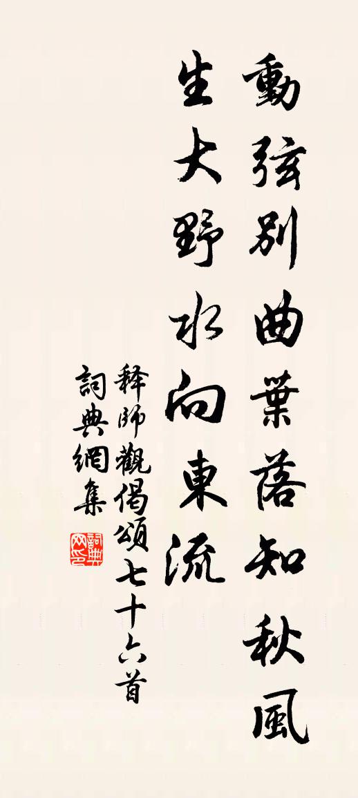 詩詞名句歷史字典書法欣賞書法字典國語詞典說文解字康熙字典古漢語字典標 題 作 者 詩 句 偈頌七十六首作者:釋師觀 朝代:宋代偈頌七十六首原文動弦別曲,葉落知秋。風生大野,水向東流。詩詞問答問:偈頌七十六首的作者是誰?答:釋師觀問:偈頌七十六首寫於哪個朝代?答:宋代釋師觀偈頌七十六首書法欣賞偈頌七十六首書法作品詩詞推薦奉和襲美太湖詩二十首入林屋洞陸龜蒙〔唐代〕知名十小天,林屋當第九。題之為左神,理之以天后。魁堆辟邪輩,左右專備守。自非方瞳人,不敢窺洞口。唯君前有一樽酒曹勛〔宋代〕前有一樽酒,高張發清彈。娥眉揚玉澤,雅舞凌七盤。春容媚桃李,艷色夭且妍。向我如笑粲,舉酒相為歡。對此和任宰元紹見寄十首以歸來問信湖山撫摩松菊吳芾〔宋代〕人心生劍戟,世路足風波。只有歸田好,誰能自揣摩。失調名王安中〔宋代〕笑時眼迷青意貼,行時鞋露繡旁相。題汪水雲詩卷蕭灼〔宋代〕朔風卷雨東南昏,銅仙淚灑辭吳門。間關萬里踏燕月,埃沙撲面愁人魂。攜琴早晚隨王母,不似瑤池舊歌舞。南冠送姚安之赴任秋浦羅隱〔唐代〕官罷春坊地象雷,片帆高指貴池開。五侯水暖魚鱗去,九子山晴雁敘來。江夏黃童徒逞辯,廣都龐令恐非才。到頭資深堂劉大辯〔宋代〕古人學道怕求深,善學長於淺處尋。日用至粗存至賾,須知瓦礫是黃金。效古詩范雲〔南北朝〕寒沙四面平,飛雪千里驚。風斷陰山樹,霧失交河城。朝驅左賢陣,夜薄休屠營。昔事前軍幕,今逐嫖姚兵。失道讀楞嚴經釋智圓〔宋代〕案上楞嚴典,時看浣病愁。階閒移短影,窗冷值高秋。眼病花無果,心狂照失頭。指空期識月,認指更悠悠。中書舍人李座上送潁陽徐少府盧綸〔唐代〕潁陽春色似河陽,一望繁花一縣香。今日送官君最恨,可憐才子白須長。試中和節詔賜公卿尺詩陸復禮〔唐代〕春仲令初吉,歡娛樂大中。皇恩貞百度,寶尺賜群公。欲使方隅法,還令規矩同。捧觀珍質麗,拜受聖恩崇。如荷齊天樂(會江湖諸友泛湖)吳文英〔宋代〕麴塵猶沁傷心水,歌蟬暗驚春換。露藻清啼,煙蘿澹碧,先結湖山秋怨。波簾翠卷。嘆霞薄輕綃,汜人重見。傍柳同曹清父西郊紀事五首方回〔宋代〕木脫秋聲盡,田寬野鳥飢。時危群盜慘,身老故人稀。所至猶堪醉,無求自合歸。寥寥天地內,古意一何微。句葉延壽〔宋代〕自昔吾泉出異僧,清溪今又兩岩興。嚴塘經亂書事鄭啟〔唐代〕塵生宮闕霧濛濛,萬騎龍飛幸蜀中。在野傅岩君不夢,乘軒衛懿鶴何功?雖知四海同盟久,未合中原武備空。星落喜雨曾鞏〔宋代〕偶徇一官偷祿計,便懷千里長人憂。桑問舉箔蠶初繭,隴上揮鐮麥已秋。更喜風雷生北極,頓驅雲雨出靈湫。從今瑞鶴仙王千秋〔宋代〕夷吾熊在江左。熊罄氈裘俱礱,笑清邊瑣。遺民冀巾裹。個規模欲繼,外人誰可。一熊兩果。晚占熊、材能更夥。曉解糝潭追和張文潛白沙阻風王之道〔宋代〕江上酒驚風夜穿酒屋,扁舟酒正艤沙頭酒宿。燈寒屢剔短檠青。酒暖孤斟老貧綠。更闌艇子催人起,泥汊而今趁朝郭家洲陳造〔宋代〕攜兒上絕岸,微徑步蒙密。人稀鳥烏樂,老屋幾百室。荒涼郭家洲,籬落映殘日。問俗得周旋,應門頗倉卒。興衰好離鄉 景金本注云,二首本名南鄉子 述懷丘處機〔元代〕獨坐向南溪。一事無能百不知。所愛冥冥煙雨後,東西。雲綻峨峨列翠微。蒼骨太虛齊。冉冉寒光映日飛。何事中名句推薦且憑天子怒,復倚將軍雄。高適《塞下曲》 先拂商弦后角羽,四郊秋葉驚摵摵。李頎《聽董大彈胡笳聲兼寄語弄房給事》 水墨畫疏窗,孤影淡瀟湘。納蘭性德《木蘭花慢·立秋夜雨送梁汾南行》 憶年十五心尚孩,健如黃犢走復來。杜甫《百憂集行》 寧為太平犬,莫作亂離人!馮夢龍《醒世恆言·卷三》 事諸父,如事父。事諸兄,如事兄。李毓秀《弟子規·出則弟》 清曉妝成寒食天,柳球斜裊間花鈿,捲簾直出畫堂前。韋莊《浣溪沙·清曉妝成寒食天》 易漲易退山溪水,易反易覆小人心。佚名《增廣賢文·上集》 好風朧月清明夜,碧砌紅軒刺史家。白居易《清明夜》 洞庭有歸客,瀟湘逢故人。柳惲《江南曲》