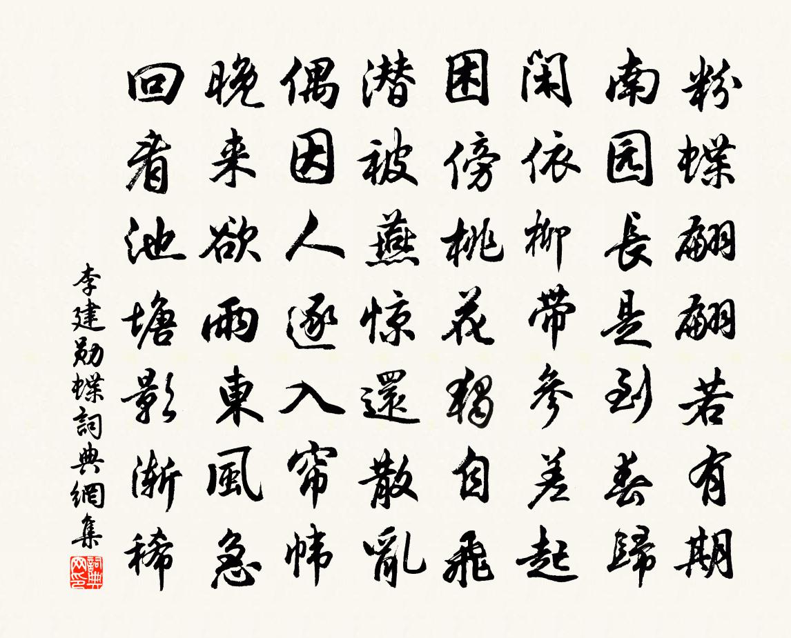 詩詞名句歷史字典書法欣賞書法字典國語詞典說文解字康熙字典古漢語字典標 題 作 者 詩 句 蝶作者:李建勛 朝代:唐代蝶原文粉蝶翩翩若有期,南園長是到春歸。閒依柳帶參差起,困傍桃花獨自飛。潛被燕驚還散亂,偶因人逐入簾幃。晚來欲雨東風急,回看池塘影漸稀。詩詞問答問:蝶的作者是誰?答:李建勛問:蝶寫於哪個朝代?答:唐代問:蝶是什麼體裁?答:七律李建勛蝶書法欣賞蝶書法作品注釋全唐詩:卷739-56詩詞推薦即席呈趙大資蘇泂〔宋代〕裴公非綠野,白傅喜青山。富貴何如老,功名不似閒。半生知己地,每見立談間。歲歲須來省,從教載雪還。有美堂暴雨蘇軾〔宋代〕遊人腳底一聲雷,滿座頑雲撥不開。天外黑風吹海立,浙東飛雨過江來。十分瀲灩金樽凸,千杖敲鏗羯鼓催。喚起扇子詩李石〔宋代〕四月四日夏令新,余花更饒三日春。榴紅裙子凌被襪,一曲南風花笑人。絕句葛天民〔宋代〕夜雨漲波高二尺,失卻搗衣平正石。天明水落石依然,老夫一夜空相憶。五月高斯得〔宋代〕五月書出師時,書老臣抱憂書懼。端莢書問詹尹,願告吉凶故。卦得明夷終,驚愕不敢露。庸知三日後,日眚大可文文山畫像贊鄧剡〔宋代〕目煌煌兮疏星曉寒,氣英英兮晴雷殷山。頭碎柱而璧完,血化碧而心丹。嗚呼,誰謂斯人不在世間。送陳通卿赴省曾豐〔宋代〕閩南江西人,蓬梗適相會。妙齡華發身,氣味適相愛。問其先世誰,意者了翁派。肯學喜文章,綽有風流在。自余句呂岩〔唐代〕莫道神仙無學處,古今多少上升人。惜牡丹花二首白居易〔唐代〕翰林院北廳花下作惆悵階前紅牡丹,晚來唯有兩枝殘。明朝風起應吹盡,夜惜衰紅把火看。新昌竇給事宅南亭花下西園十詠圓通庵吳中復〔宋代〕坐對圓通境,陶然勝靜齋。觀空無物我,扣寂外形骸。燕坐埋遺照,虛名莫疚懷。人間憂樂地,所喪甚山崖。玉樓春(戊寅重陽,病中不飲,惟煎小雲團一杯,薦以菊花)毛滂〔宋代〕西風吹冷沈香篆。門掩小晴紅葉院。臥看 * 送重陽,露重煙寒花未遍。衰翁病怯琉璃簟。日日愁侵霜鬢短。一杯代作五首項安世〔宋代〕流霞元是吾家飲,生日曾供老杜詩。色借榴心芳露重,香分荷氣碧泉滋。重闈永夜宜開酌,六禮今年看結褵。可但水調歌頭(題臨江驛和徐意一韻)李曾伯〔宋代〕君莫厭行役,易爾此非難。人情無已,久陰憂潦霽憂乾。借得庭軒一榻,忘卻征塗炎暑,小駐瀹龍團。世路任渠險濡須塢龔相〔宋代〕東北安危限兩關,迅流一去幾時還。淒涼千古干戈地,春水方生鷗自閒。石壁立招提精舍詩謝靈運〔南北朝〕四城有頓躓。三世無極已。浮歡昧眼前。沉照貫終始。壯齡緩前期。頹年迫暮齒。揮霍夢幻頃。飄忽風電起。良緣華山畿·相送勞勞渚佚名〔南北朝〕相送勞勞渚,長江不應滿,是儂淚成許。人日方岳〔宋代〕賴有空山著此翁,不然高論與誰同。百年會盡玄尚白,一氣不停春又紅。詩卷每隨煙水外,鳥聲多在夕陽中。年豐游齊山寺尋陳鴻斷碑孫邁〔宋代〕萬木參天繞寺籬,一聲孤磬徹江湄。樓邊已失陳鴻記,亭上猶存杜牧詩。細雨乍經岩溜響,嫩苔長積石橋危。知予和何斯舉戒食牛李彌遜〔宋代〕飢腸慕膻腥,如渴待拾法。雖窮爪掌勞,不助唇吻濕。屬厭能幾何。忍復貴難得。三犧良可哀,一割儻未急,貪夫挽雲門鄭君黃榦〔宋代〕結友雲門日,曾聞谷口翁。松肥三徑雨,鱸熟一絲風。行業鄉閭敬,詩書子姓同。論心獨余恨,秋草對碑豐。名句推薦離一切諸相則名諸佛。鳩摩羅什譯《金剛經·離相寂滅》 愁腸已斷無由醉,酒未到,先成淚。范仲淹《御街行·秋日懷舊》 對山河百二,淚盈襟血。王清惠《滿江紅·題南京夷山驛》 有善始者實繁,能克終者蓋寡吳兢《貞觀政要·卷一·論君道》 看似尋常最奇崛,成如容易卻艱辛。王安石《題張司業詩》 瑤草一何碧,春入武陵溪。黃庭堅《水調歌頭·遊覽》 庭下如積水空明,水中藻、荇交橫,蓋竹柏影也。蘇軾《記承天寺夜遊 / 記承天夜遊》 滿招損,謙受益佚名《尚書·虞書·大禹謨》 意輕千金贈,顧向平原笑。李白《古風·齊有倜儻生》 魂來楓葉青,魂返關塞蒙杜甫《夢李白二首·其一》
