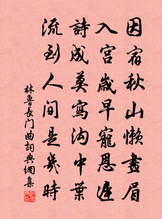 詩詞名句歷史字典書法欣賞書法字典國語詞典說文解字康熙字典古漢語字典標 題 作 者 詩 句 長門曲作者:林魯 朝代:宋代長門曲原文因宿秋山懶畫眉,入宮歲早寵恩遲。詩成莫寫溝中葉,流到人間是幾時。詩詞問答問:長門曲的作者是誰?答:林魯問:長門曲寫於哪個朝代?答:宋代林魯長門曲書法欣賞長門曲書法作品詩詞推薦石竺山二十詠劉克莊〔宋代〕汞可點為金,鐵可浸為銅。勿使鍾官知,一朝比仙童。洛陽春吟邵雍〔宋代〕用盡四時周一歲,唯春能見好花開。十千買酒未為貴,既去紅芳豈再來。飛蓋堂即事蘇泂〔宋代〕秋清未脫暑衣裳,稍上城樓過苑堂。北面芰荷南面桂,水香吹亂月中香。官舍春日書懷文同〔宋代〕自趨戎幙佐鞬橐,四見新陰發舊柯。學飲不成歡意少,好吟無倦苦心多。無傷池柳風圖甚,泣破庭蘭雨奈何。敢對過馬嵬李益〔唐代〕漢將如雲不直言,寇來翻罪綺羅恩。托君休洗蓮花血,留記千年妾淚痕。萬年歡 中呂宮元日朝會趙孟頫〔元代〕天上春來。正陽和布澤,斗柄初回。一朵祥雲捧日,萬象生輝。帝德照光四表,玉帛盡、梯航來會。彤庭敞,花覆讀後漢書王安石〔宋代〕錮黨紛紛果是非,當時高士見精微。可憐竇武陳蕃輩,欲與天爭漢鼎歸。和方丞陳宓〔宋代〕平生筆健足神奇,況復高懷與古期。台閣風流今貳令,不妨時出解頤詩。玩月賈島〔唐代〕寒月破東北,賈生立西南。西南立倚何,立倚青青杉。近月有數星,星名未詳諳。但愛杉倚月,我倚杉為三。月乃入瀧州江宋之問〔唐代〕孤舟泛盈盈,江流日縱橫。夜雜蛟螭寢,晨披瘴癘行。潭蒸水沫起,山熱火雲生。猿躩時能嘯,鳶飛莫敢鳴。海窮黃鶴洞中仙 繼重陽韻馬鈺〔元代〕大悟明明也。大智閒閒也。大道行行應自然,風風馬。永永逍遙也。大水高高也。大火炎炎也。大藥輝輝晃寶瓶。木蘭花慢郭居安〔宋代〕聽都人共語,又還是、歲逢庚。記今帖頻催,袞衣將至,繡幰先迎。笙歌六宮齊奏,到而今、猶唱賀昇平。千歲人別約之舅趙蕃〔宋代〕嘆息無錢歸買山,駕言渺渺不知還。為家百畝未為秦,何事一生長苦慳。我漫參軍作蠻語,公能詩賦動江關。固窮偈頌十首釋德光〔宋代〕蓬萊有個李八伯,一對眼睛如漆黑。且莫錯認定盤星。黑白何咎釋智愚〔宋代〕世事亂如麻,情人未到家。連延深院雨,滴碎後庭花。舊話幾時別,音書未有涯。暝煙將四合,何處起胡笳。贈黟縣星學舒碧雲方回〔宋代〕原夫官賦省題詩,何乃甘心改業為。場屋久忘塗注乙,星辰閒測鬥牛箕。細看肖貌殊清徹,徐玩揮毫亦怪奇。聞道海棠秋顧禧〔宋代〕春風蕩漾花如織,排擯深岩天地窄。桃李芳菲鬥豔陽,嫣痕盡染胭脂色。含丹欲吐嬌不勝,獺髓遙分點瓊額。楊妃詠貧士 其一陶淵明〔魏晉〕萬族各有托,孤雲獨無依。曖曖空中滅,何時見餘暉。朝霞開宿霧,眾鳥相與飛。遲遲出林翮,未夕復來歸。量力長安早秋子蘭〔唐代〕風舞槐花落御溝,終南山色入城秋。門門走馬徵兵急,公子笙歌醉玉樓。江北章甫〔宋代〕江北多戎馬,江南有戰船。艱難吾欲老,輾轉夜無眠。歸去須三逕,飄零又一年。鄰舟聽客語,愁絕晚來天。名句推薦一春略無十日晴,處處浮雲將雨行。汪藻《春日·一春略無十日晴》 志之難也,不在勝人,在自勝。韓非及後人《韓非子·喻老》 滿街楊柳綠絲煙,畫出清明二月天。韋莊《丙辰年鄜州遇寒食城外醉吟五首》 嗜欲不能勞其目,淫邪不能惑其心佚名《黃帝內經·上古天真論》 語來江色暮,獨自下寒煙。李白《尋雍尊師隱居》 漢水東流,都洗盡、髭鬍膏血。辛棄疾《滿江紅·漢水東流》 大道如青天,我獨不得出。李白《行路難三首》 傷心莫問前朝事,重上越王台。倪瓚《人月圓·傷心莫問前朝事》 余亦赴京國,何當獻凱還。孟浩然《送陳七赴西軍》 孤飛一片雪,百里見秋毫。李白《觀放白鷹二首》