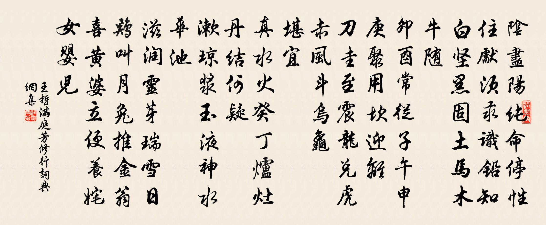 詩詞名句歷史字典書法欣賞書法字典國語詞典說文解字康熙字典古漢語字典標 題 作 者 詩 句 滿庭芳 修行作者:王哲 朝代:元代滿庭芳 修行原文陰盡陽純,命停性住,先須汞識鉛知。白堅黑固,土馬木牛隨。卯酉常從子午,申庚聚、用坎迎離。刀圭至,震龍兌虎,赤風斗烏龜。堪宜。真水火,癸丁爐灶,丹結何疑。漱瓊漿玉液,神水華池。滋潤靈芽瑞雪、日雞叫、月兔推金翁喜,黃婆立便,養奼女嬰兒。詩詞問答問:滿庭芳 修行的作者是誰?答:王哲問:滿庭芳 修行寫於哪個朝代?答:元代問:滿庭芳 修行是什麼體裁?答:詞王哲滿庭芳 修行書法欣賞滿庭芳 修行書法作品詩詞推薦寄太湖隱者陸游〔宋代〕青松伐作薪,白玉碎作塵,雖雲質已毀,見者猶悲辛。磊砢任棟樑,溫潤中琮璧,豈以捐空山,遂比凡木石。酈生王德言樞密生日十首曹勛〔宋代〕每喜高情語甚真,讜言亹亹贊天鈞。不殊林下忘形態,定是因是地位人。呂尚書挽章王洋〔宋代〕四海咄伸勢,安危俯仰殊。犬戎蟠洛邑,晉鄙握兵符。楊李生同烈,高秦死異區。誰如雙劍化,義烈一門俱。故宮陳允平〔宋代〕瓊台玉館照青紅,夢斷思陵檜柏風。三十二門金鎖合,年年春到掃梧桐。游洞霄薛泳〔宋代〕群山皆玉立,中有一峰危。天近秋雲薄,松深夜月遲。洞因尋藥入,席為聽泉移。此趣無人會,臨風酒一卮。奉和聖制過溫湯楊思玄〔唐代〕豐城觀漢跡,溫谷幸秦餘。地接幽王壘,塗分鄭國渠。風威肅文衛,日彩鏡雕輿。遠岫凝氛重,寒叢對影疏。回瞻和單令胡寅〔宋代〕炎州暑令比烝炊,茅屋深更未掩扉。倦鵲繞林飛又上,流螢照水亂還稀。寡尤正三生緘口,新浴又思一振衣。獨怯惜花郭震〔唐代〕艷拂衣襟蕊拂杯,繞枝閒共蝶徘徊。春風滿目還惆悵,半欲離披半未開。臨江仙(九之九)鄧肅〔宋代〕樓北樓南青不斷,晴空總是春容。先來無處問郎蹤。那堪風不定,雨盡一窗紅。初恨水中徒捉月,而今水月俱空。題客舍曹勛〔宋代〕路邊小舍靜無泥,風入松杉綠滿枝。溪抱回堤山抱屋,舟藏曲港竹藏籬。主人野性留應懶,倦客閒情去輙遲。內訟草堂秋夜釋智圓〔宋代〕雨殺炎光變秋色,清涼頓在草堂中。幽人一夜坐不睡,月照閒階露灑空。送琴僧知白歐陽修〔宋代〕吾聞夷中琴已久,常恐老死無其傳。夷中未識不得見,豈謂今逢知白彈。遺音髣佛尚可愛,何況之子傳其全。孤禽訪友人郊居劉滄〔唐代〕登原過水訪相如,竹塢莎庭似故居。空塞山當清晝晚,古槐人繼綠陰余。休彈瑟韻傷離思,已有蟬聲報夏初。醉唱成都暮雨秋(一作秋雨)戎昱〔唐代〕九月龜城暮,愁人閉草堂。地卑多雨潤,天暖少秋霜。縱慾傾新酒,其如憶故鄉。不知更漏意,惟向客邊長。和薔薇花歌孟郊〔唐代〕仙機札札織鳳凰,花開七十有二行。天霞落地攢紅光,風枝裊裊時一颺,飛散葩馥繞空王。忽驚錦浪洗新色,又似次韻和岳醵飲西峰寺分韻成詩十四首見寄陳著〔宋代〕老佛眉閒屋漏愁,殘廊腳下草光浮。誰能飢坐蘆穿膝,莫問神通石點頭。得子虡濠上書陸游〔宋代〕日暮坐柴門,懷抱方煩紆。鈴聲從西來,忽得濠州書。開緘讀未半,喜極涕泗俱。父子老惜別,經況患難余。羈旅秋懷陸游〔宋代〕火食非初志,衣塵每自哀。危途觸灩澦,歸興薄蓬萊。逋客傳琴調,高僧乞藥栽。人間豈不好?病眼自慵開。又代賀皇太子生日詩二首李劉〔宋代〕銀盤浴兔方二日,寶冊蟠龍甫半旬。甲觀誕彌佳氣鬱, * 衍慶{左糹右辱}儀新。前星色正光芒遠,少海波清潤聞邵興宗拜命王珪〔唐代〕訪政鳴堯鼓,旌賢走漢輪。帝方驚主父,人已蘆平津。筆落三千健,恩頒尺一新。歸來前席問,榮路邇嚴宸。名句推薦馬穿楊柳嘶,人倚鞦韆笑,探鶯花總教春醉倒。王磐《清江引·清明日出遊》 蕃漢斷訊息,死生長別離。張籍《沒蕃故人》 修竹傍林開,喬松倚岩列。德隱《新秋晚眺》 我歌月徘徊,我舞影零亂。李白《月下獨酌四首·其一》 何處望神州?滿眼風光北固樓。辛棄疾《南鄉子·登京口北固亭有懷》 禍之所由生也,生自纖纖也。荀子《荀子·大略》 如切如磋,如琢如磨。佚名《淇奧》 學而不厭,誨人不倦。孔子弟子《論語·述而篇》 朝來入庭樹,孤客最先聞。劉禹錫《秋風引》 多少新亭揮淚客,誰夢中原塊土。劉克莊《賀新郎·送陳真州子華》