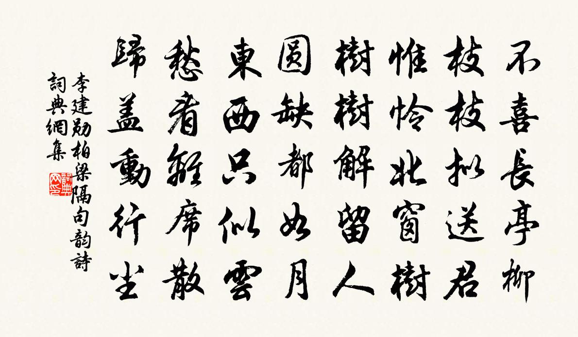 詩詞名句歷史字典書法欣賞書法字典國語詞典說文解字康熙字典古漢語字典標 題 作 者 詩 句 柏梁隔句韻詩作者:李建勛 朝代:唐代柏梁隔句韻詩原文不喜長亭柳,枝枝擬送君。惟憐北窗樹,樹樹解留人。圓缺都如月,東西只似雲。愁看離席散,歸蓋動行塵。詩詞問答問:柏梁隔句韻詩的作者是誰?答:李建勛問:柏梁隔句韻詩寫於哪個朝代?答:唐代問:柏梁隔句韻詩是什麼體裁?答:五律李建勛柏梁隔句韻詩書法欣賞柏梁隔句韻詩書法作品注釋全唐詩:卷739-16詩詞推薦秋日陪李侍御渡松滋江孟浩然〔唐代〕一作和李侍御渡松滋江南紀西江闊,皇華御史雄。截流寧假楫,掛席自生風。僚寀采爭攀鷁,魚龍亦避驄。坐聞白酒中十詠酒壚皮日休〔唐代〕紅壚高几尺,頗稱幽人意。火作縹醪香,灰為冬醷氣。有槍盡龍頭,有主皆犢鼻。倘得作杜根,傭保何足愧。皇雅十首《帝制》五章尹洙〔宋代〕在漢世宗,抗威北戎。暴農算商,經用弗充。中士震騷,漢南始空。降及後世,猶稱厥功。醉桃源秦觀〔宋代〕碧天如水月如眉,城頭銀漏遲。綠波風動畫船移,嬌羞初見時。銀燭暗,翠簾垂,芳心兩自知。楚台魂斷曉雲飛,送李伯和吏部提舉浙東伯珍寺丞將漕夔門樓鑰〔宋代〕奕奕君家好弟兄,皇華交映棣華明。幾年並列金閨彥,同日俱持玉節行。萬里往臨夔子國,一江先到越王城。會聞睡起葛紹體〔宋代〕西風攪雨十分秋,誰駕秋濤汗漫遊。日午小窗初睡起,一回魂夢到滄州。秋山極天淨朱延齡〔唐代〕雨洗高秋淨,天臨大野閒。蔥蘢清萬象,繚繞出層山。日落千峰上,雲銷萬壑間。綠蘿霜後翠,紅葉雨來殷。散彩伊川喜雨黃庶〔宋代〕尺雨乘春尉望深,家家倉廩一年心。伊川父老還知否,此是隨車傅說霖。托人求田李復〔宋代〕綠繞隨城潏水流,百年那免問菟裘。泉甘易汲能蠲疾,土沃翻耕每報秋。欲托高人論地券,共期他日老漁舟。歸身題王堯章佇香亭樂雷發〔宋代〕滿地蜀錦照深衣,盡日憑欄課楚詞。要識此花香絕處,露涼風細雨晴時。江上釋文珦〔宋代〕煙生浦欲無,日莫潮初落。客帆何處來,又近垂楊泊。冬日書懷四首王炎〔宋代〕治身如治玉,所貴無瑕疵。玉美不願市,身修豈求知。人生為餬口,乃爾斂板趨。漸失兩鬢青,莫浣雙袖緇。勿用古宮詞十首劉克莊〔宋代〕妾意憨如昔,君心苦不常。未聞求故劍,別有獻明璫。和楊誠齋韻謝惠南海集詩三首袁說友〔宋代〕玉海書來喜欲狂,餐霞食瀣齒牙香。固應宗派名江右,底用宮袍入建章。今代歐黃真有種,向來沈鮑肯同行。只今郊廟歌辭。後唐宗廟樂舞辭。永平舞佚名〔唐代〕慶傳瓚祚,位正瑤圖。功宣四海,化被八區。靜彰帝道,動合乾符。千秋萬祀,永荷昭蘇。夢玉人引陳三聘〔宋代〕倚闌乾久,人不見,暮雲碧。芳草池塘,春夢暗驚詩客。昨夜溪梅,向空山、雪裡輕勻顏色。好贈行人,折枝南枝蘆葦江八詠東橋柳色羅仲舒〔宋代〕河橋數株柳,偏受東風多。柔條慎扔折,生意全天和。李監餉四物各以一絕答之甘蔗方岳〔宋代〕老境於我漸不佳,一生拗性舊秋崖。笑人煮簀何時熟,生啗青青竹一排。想車音/兀令賀鑄〔宋代〕盤馬樓前風日好。雪銷塵掃。樓上宮妝早。認簾箔微開,一面嫣妍笑。攜手別院重廊,窈窕花房小。任碧羅窗曉。捕漁謠曹鄴〔唐代〕天子好征戰,百姓不種桑。天子好年少,無人薦馮唐。天子好美女,夫婦不成雙。名句推薦年年送客橫塘路,細雨垂楊系畫船。范成大《橫塘·南浦春來綠一川》 汴水流,泗水流,流到瓜州古渡頭。吳山點點愁白居易《長相思·汴水流》 火冷燈稀霜露下,昏昏雪意雲垂野。蘇軾《蝶戀花·密州上元》 道人憔悴春窗底,悶損闌乾愁不倚李清照《玉樓春·紅酥肯放瓊苞碎》 相尋夢裡路,飛雨落花中。晏幾道《臨江仙·鬥草階前初見》 西施若解傾吳國,越國亡來又是誰。羅隱《西施》 日出入安窮?時世不與人同。佚名《日出入》 滾滾長江東逝水,浪花淘盡英雄。楊慎《臨江仙·滾滾長江東逝水》 春未綠,鬢先絲。人間別久不成悲。姜夔《鷓鴣天·元夕有所夢》 劃然長嘯,草木震動,山鳴谷應,風起水涌蘇軾《後赤壁賦》