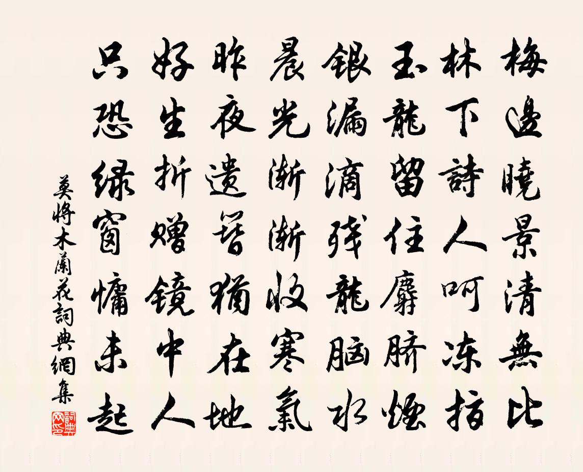 詩詞名句歷史字典書法欣賞書法字典國語詞典說文解字康熙字典古漢語字典標 題 作 者 詩 句 木蘭花/玉樓春作者:莫將 朝代:宋代木蘭花/玉樓春原文梅邊曉景清無比。林下詩人呵凍指。玉龍留住麝臍煙,銀漏滴殘龍腦水。晨光漸漸收寒氣。昨夜遺簪猶在地。好生折贈鏡中人,只恐綠窗慵未起。詩詞問答問:木蘭花/玉樓春的作者是誰?答:莫將問:木蘭花/玉樓春寫於哪個朝代?答:宋代問:木蘭花/玉樓春是什麼體裁?答:詞莫將木蘭花/玉樓春書法欣賞木蘭花/玉樓春書法作品詩詞推薦送荀八過山陰舊縣,兼寄剡中諸官劉長卿〔唐代〕訪舊山陰縣,扁舟到海涯。故林嗟滿歲,春草憶佳期。晚景千峰亂,晴江一鳥遲。桂香留客處,楓暗泊舟時。舊石書永嘉嘉禾驛王義山〔宋代〕老來倦躋攀,悠悠憩山側。層嵐軼窮霓,紆縈困行客。崖傾覺嶮巇,徑曲盤險迫。石老枕雲根。橋橫界野色。海嶠梅花五首劉克莊〔宋代〕夜來幾陣隔窗風,便恐明朝已掃空。點在青苔真可惜,不如吹入酒杯中。江上看山蘇轍〔宋代〕朝看江上枯崖山,憔悴荒榛赤如赭。莫行百里一回頭,落日孤雲靄新畫。前山更遠色更深,誰知可愛信如今。唯有七交七首王秀才歐陽修〔宋代〕幾道顏之徒,沈深務覃聖。采藻薦良璧,文潤相輝映。入市羊駕車,談道犀為柄。時時一文出,往往紙價盛。無為天竺送僧釋重顯〔宋代〕雪霽蓮峰頂,孤禪起石牀。向時機自絕,異域路空長。啼狖沖寒影,歸鴻見斷行。後期無定跡,煙水共茫茫。次韻因上人晚菊簡魏定父王之道〔宋代〕離索自可笑,衰遲誰見憐。亭亭搖落中,一枝小窗前。正色有家法,細看清且妍。浮觴未雲晚,松醪吾所便。臨江仙晏幾道〔宋代〕旖旎仙花解語,輕盈春柳能眠。玉樓深處綺窗前。夢回芳草夜,歌罷落梅天。沉水濃熏繡被,流霞淺酌金船。綠嬌頌古九首柏樹釋梵言〔宋代〕庭前柏樹子,不是祖師心。莫執一時見,便忘千古音。八月十五日夜清溪舟次張舜民〔宋代〕清溪水底月團團,因見中秋憶去年。旱海五更霜透甲,郴江萬里桂隨船。昔看故國光常滿,今望天涯勢似偏。只恐林正甫與子中春並命為御史正甫按刑浙東道別虞儔〔宋代〕銜命宮陵偶一回,山 * 上得徘徊。溟鵬好在思摶擊,乘雁何嘗計去來。萬壑千岩況秋色,明珠白璧更塵埃。相逢故樞密宋給事輓歌三首楊億〔宋代〕宸遊方扈從,移疾廢樞機。步輦親臨問,肩輿遽告歸。忽聞號左轂,旋見泣中闈。城郢遺言切,忠魂定有依。浣溪沙周邦彥〔宋代〕薄薄紗櫥望似空。簟紋如水浸芙蓉。起來嬌眼未惺惚。強整羅衣抬皓腕,更將紈扇掩 * 。羞郎何事面微紅。游龍門分題十五首自菩提步月歸廣化寺歐陽修〔宋代〕春岩瀑泉響,夜久山已寂。明月淨松林,千峰同一色。潼關蘭若許渾〔唐代〕來往幾經過,前軒枕大河。遠帆春水闊,高寺夕陽多。蝶影下紅藥,鳥聲喧綠蘿。故山歸未得,徒詠采芝歌。殘句不會人間閒草木蘇軾〔宋代〕不會人間閒草木,預人何事管興亡。四言贈兄秀才入軍詩 其十嵇康〔兩漢〕攜我好仇。載我輕車。南凌長阜。北厲清渠。仰落驚鴻。俯引淵魚。盤於游田。其樂只且。甘蔗蘇軾〔宋代〕老境於吾漸不佳,一生拗性舊秋崖。笑人煮積何時熟,生啖青青竹一排。寄寶應丘大夫攽劉華〔宋代〕制閫今元帥,男邦舊大夫。受成無弊事,直上有夷塗。赤縣圖新入,蒼生喘欲蘇。底須勞戰士,城築守淮隅。憫雨曾幾〔宋代〕梅子黃初遍,秧針綠未抽。若無三日雨,那復一年秋。薄晚看天意,今宵破客愁。不眠聽竹樹,還有好音不。名句推薦當家才知鹽米貴,養子方知父母恩。佚名《增廣賢文·上集》 路逢險處須迴避,事到臨頭不自由。佚名《增廣賢文·上集》 春風試手先梅蕊,頩姿冷艷明沙水。趙令畤《菩薩蠻·春風試手先梅蕊》 長江後浪推前浪,世上新人趕舊人。佚名《增廣賢文·上集》 波光水鳥驚猶宿, 露冷流螢濕不飛。湯顯祖《江宿》 伏波惟願裹屍還,定遠何鬚生入關。李益《塞下曲》 天無二日,人無二理。吳承恩《西遊記·第七十八回》 渭城朝雨浥輕塵,客舍青青柳色新。王維《渭城曲 / 送元二使安西》 掩柴扉,謝他梅竹伴我冷書齋。沈自晉《玉芙蓉·雨窗小詠》 李白乘舟將欲行,忽聞岸上踏歌聲。李白《贈汪倫》