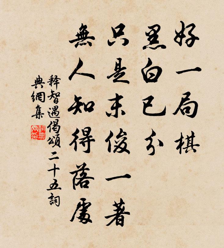 詩詞名句歷史字典書法欣賞書法字典國語詞典說文解字康熙字典古漢語字典標 題 作 者 詩 句 偈頌二十五作者:釋智遇 朝代:宋代偈頌二十五原文好一局棋,黑白已分。只是末俊一著,無人知得落處。詩詞問答問:偈頌二十五的作者是誰?答:釋智遇問:偈頌二十五寫於哪個朝代?答:宋代釋智遇偈頌二十五書法欣賞偈頌二十五書法作品詩詞推薦菩薩蠻 山寺夏日韓奕〔元代〕重重樹杪高高閣。懸泉千尺檐前客。度夏愛僧居。一來慵下梯。睡余無氣力。坐數遙峰碧。閒詠不成詩。斜陽在澗留別康元質教授陳與義〔宋代〕腐儒身世已百憂,此去行年豈堪記。岳陽樓前一杯酒,與子同州復同味。洞庭秋氣運蒼梧,天高地遠魚龍呼。莫倚歡笑邵雍〔宋代〕劃平荊棘蓋樓台,樓上笙簧鼎沸開。歡笑未絕兵火起,從前荊棘卻生來。句陶弼〔宋代〕簫鼓不分憂樂事,衣冠難辨吉凶人。挽林煥章二首劉克莊〔宋代〕束帛徵諸老,深衣立一儒。鄉人偕獵較,童子共鳳雩。屑屑羞來往,兢兢迨舉扶。自慚衰竭久,書墓覺詞蕪。夜歸陸游〔宋代〕今年寒到江鄉早,未及中秋見雁飛。八十老翁頑似鐵,三更風雨采菱歸。和常州崔使君寒食夜沈佺期〔唐代〕聞道清明近,春闈向夕闌。行游晝不厭,風物夜宜看。斗柄更初轉,梅香暗裡殘。無勞秉華燭,晴月在南端。辛卯年雪韓愈〔唐代〕元和六年春,寒氣不肯歸。河南二月末,雪花一尺圍。崩騰相排拶,龍鳳交橫飛。波濤何飄揚,天風吹幡旂。白帝三伏中一雨甦旱鄧深〔宋代〕江漲如三月,天涼似九秋。遭逢今日雨,安穩一年收。處處香瓮面,村村肥藁頭。小春前後好,待掛百錢游。聞傅氏莊紫笑花開急棹小舟觀之陸游〔宋代〕日長無奈清愁處,醉里來尋紫笑香。漫道閒人無一事,逢春也似蜜蜂忙。常祀皇地祗五首佚名〔宋代〕坤元之德,光大無疆。一氣交感,百物阜昌。吉蠲致享,精明是將。介茲景福,鼎祚靈長。省中偶作張喬〔唐代〕二轉郎曹自勉旃,莎階吟步想前賢。不如何遜無佳句,若比馮唐是壯年。捧制名題黃紙尾,約僧心在白雲邊。乳毛西州舊俗每當立春前後以巢菜作餅互相招邀名家鉉翁〔宋代〕我家自貴東坡餅,不為人間肉食羞。聞道西山薇蕨長,摘來我可輩元修。臘夜雪霽月彩交光開閣臨軒竟睡不得…寄江陵副使杜中丞李群玉〔唐代〕月華臨霽雪,皓彩射貂裘。桂酒寒無醉,銀笙凍不流。懷哉梁苑客,思作剡溪游。竟夕吟瓊樹,川途恨阻修。訊劍浦主簿詹棟齋徐元傑〔宋代〕竹林飢午隱禪扉,合傍鸞棲亦此棲。時一參寮茶供罷,可能無語到雙溪。東嶺陸游〔宋代〕雲罅漏斜日,駕言東嶺行。鴉翻半天黑,鷺起一川明。小立照溝水,欲歸聞角聲。君看浮世事,何處異棋枰?邊景曾邍〔宋代〕匹馬來逢寒草秋,淮雲一片隔神州。黃昏燈火西津渡,白晝風煙北固樓。猶有斷碑知晉宋,誰將遺石問孫劉。天荒竹溪直院盛稱起予草堂詩之善暇日覽之多有可劉克莊〔宋代〕試聽輿人誦,如何是太平。有生遂其性,無象得而名。刁斗三邊靜,鋤耰萬里耕。毋庸奏奎聚,不必誦河清。堯豈吊柴道士馬廷鸞〔宋代〕老子猶龍不可親,莊周與蝶孰為真。補還石鼎吟邊句,飛作臨皋夢裡人。朱彥和鄧林〔宋代〕文如玉海動時流,曾以書棋伏隱侯。武德閣前消幾語,卻令梁氏缺金甌。名句推薦天意憐幽草,人間重晚晴。李商隱《晚晴》 舊苑荒台楊柳新,菱歌清唱不勝春。李白《蘇台覽古》 相顧無相識,長歌懷採薇。王績《野望》 害人之心不可有,防人之心不可無,此戒疏於慮者。洪應明《菜根譚·概論》 坐上別愁君未見,歸來欲斷無腸。蘇軾《臨江仙·送王緘》 出南門即大海,一日兩潮,如萬丈銀堤破海而過。沈復《浮生六記·浪遊記快》 幽徑無人獨自芳,此恨憑誰訴。曹組《卜運算元·蘭》 更傾寒食淚,欲漲冶城潮。王安石《壬辰寒食》 致治之本,惟在於審。量才授職,務省官員。吳兢《貞觀政要·卷三·論擇官》 賴其力者生,不賴其力者不生。墨子《墨子·32章 非樂(上)》