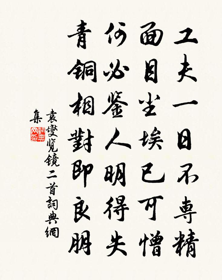 詩詞名句歷史字典書法欣賞書法字典國語詞典說文解字康熙字典古漢語字典標 題 作 者 詩 句 覽鏡二首作者:袁燮 朝代:宋代覽鏡二首原文工夫一日不專精,面目塵埃已可憎。何必鑒人明得失,青銅相對即良朋。詩詞問答問:覽鏡二首的作者是誰?答:袁燮問:覽鏡二首寫於哪個朝代?答:宋代袁燮覽鏡二首書法欣賞覽鏡二首書法作品詩詞推薦次韻和鄧慎思與太守同登清湘樓孔武仲〔宋代〕郡樓邀會樂豐年,極目山川思浩然。才子登臨嗟昔別,使君藩屏值新遷。前峰綠霧藏丹葉,別浦平沙襯碧漣。不但醉蓬萊 九月十八日西虢劉氏醮丘處機〔元代〕乍三清鶴降,萬里雲收,昊天空翠。玉磬琅琅,動乾坤聲銳。盡日修齋,虛堂設醮,慶大仙恩惠。滿獻霞觥,長歌王子才軍中有道鬻筆既售而去日吾姓管中破視黃彥平〔宋代〕車馬相逢地,龍蛇雜處中。從容李洞長,遊戲管城公。墮履方圯下,跳壺已閬風。還同賀水部,乘興看行宮。走筆送義興令趙宣輔徐鉉〔唐代〕聞君孤棹泛荊谿,隴首雲隨別恨飛。杜牧舊居憑買取,他年藜杖願同歸。頌古二十八首釋道川〔宋代〕高聲撥火召司徒,火焰炎天驀面驅。只向此間能穩坐,任教門外雪盈衢。次韻雨阻遊人方岳〔宋代〕村塢花飛片片紅,橫遭澀雨又慳風。無何春事三分過,不肯遊人一笑同。窮勝園林惟我輩,儻來軒冕付諸公。煙雲過應浩然先生墓戴表元〔宋代〕人間萬卷龐眉老,眼見堂堂入草萊。行客須當下馬過,故交誰復裹雞來。山花不語如聽講,溪水無情自薦哀。猶勝雜感六首黎廷瑞〔宋代〕淒淒寒露下,亹亹孤蛩吟。幽人起傍徨,嘆息淚盈襟。物情正得時,我悲獨何心。琴川精舍寄城中友人趙希邁〔宋代〕客來僧已去,古屋靜蕭蕭。敲石引松火,對花懸酒瓢。窗欞寒背日,柱礎潤通潮。君肯過幽寂,水程才隔宵。臘旦大雪運使何同叔送羊羔酒拙詩為謝周必大〔宋代〕未雪兵廚已擊鮮,雪中從事到尊前。淺斟未辦銷金帳,快瀉聊憑藥玉船。醉夢免教園踏菜,富兒休詫饌羅膻。爛頭喜賓暘歸方回〔宋代〕魯翁秀山歸,虛翁錢塘留。虛翁秀山來,魯翁錢塘游。中秋前三日,西東各登舟。及至中秋夕,兩翁空相求。是夕頌古三十二首釋明辯〔宋代〕六朝翻譯傳來妙,到頭未悟當時竅。須信枝頭老鳳凰,春來翻作黃鶯叫。句陶弼〔宋代〕天形包舊楚,水影動全吳。次韻在伯對雪見示趙蕃〔宋代〕初迷庭砌與牆陰,旋著遙山及遠林。飄灑故看朝已積,繽紛更覺晝彌深。東都皎皎關門臥,魯國寥寥振履音。作氣高宗明堂前朝獻景靈宮十首真宗〔宋代〕洋洋降臨,肅肅布列。熙事既成,嘉籩告棄。九天下儲慶,垂祐無缺。寐明寐昌,綿綿瓜{左瓜右失}。春秋戰國門毛遂周曇〔唐代〕不識囊中穎脫錐,功成方信有英奇。平原門下三千客,得力何曾是素知。憩小峨嵋顧禧〔宋代〕偶上峨嵋嶺,悠然對夕曛。孤峰擎落日,古殿宿寒雲。石暗松濤作,天空鶴唳聞。幽尋愜素抱,世態自紛紜。偈頌八十七首釋慧開〔宋代〕禮拜即是,不禮即是。黃面瞿雲,在我腳底。吟詩自笑用前韻陳造〔宋代〕文字光騰萬丈長,錦官老杜豫章黃。投荒忍死經人鮓,討飯充腸上岳陽。夜宿宗公丈室求詩甚勤為賦五字張元乾〔宋代〕林表登層閣,秋聲隱暮鍾。雅歸苦竹寺,雨闇亂雲峰。屢乞留新句,重來訪舊蹤。松門罕車馬,似喜老夫逢。名句推薦有力者疾以助人,有財者勉以分人,有道者勸以教人。墨子《墨子·10章 尚賢(下)》 萬頃風濤不記蘇。雪晴江上麥千車。蘇軾《浣溪沙·萬頃風濤不記蘇》 恐是仙家好別離,故教迢遞作佳期。李商隱《辛未七夕》 十年種木,一年種穀,都付兒童。元好問《人月圓·重岡已隔紅塵斷》 舊相思、偏供閒晝。吳文英《夜遊宮·春語鶯迷翠柳》 舉頭紅日近,回首白雲低。寇準《詠華山》 先天下之憂而憂,後天下之樂而樂范仲淹《岳陽樓記》 隨你官清似水,難逃吏滑如油。馮夢龍《警世通言·卷十五》 宣父猶能畏後生,丈夫未可輕年少。李白《上李邕》 金風飄菊蕊,玉露泫萸枝。韋安石《奉和九日幸臨渭亭登高應制得枝字》
