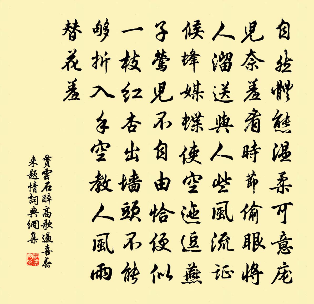 詩詞名句歷史字典書法欣賞書法字典國語詞典說文解字康熙字典古漢語字典標 題 作 者 詩 句 【中呂】醉高歌過喜春來 題情作者:貫雲石 朝代:元代原文自然體態溫柔,可意龐兒奈羞。看時節偷眼將人溜,送與人些風流證候。 蜂媒蝶使空迤逗,燕子鶯兒不自由。恰便似一枝紅杏出牆頭,不能夠折入手,空教人風雨替花羞。詩詞問答問:《【中呂】醉高歌過喜春來 題情》的作者是誰?答:貫雲石問:該詩寫於哪個朝代?答:元代書法欣賞【中呂】醉高歌過喜春來 題情書法作品詩詞推薦後洞雪壓竹枝橫道林用中〔宋代〕山中景物自新奇,乘興幽人寫小詩。洞裡竹枝遭雪壓,何人扶起向明詩。句余靖〔宋代〕暫離人世界,且至佛家鄉。大江東去(自壽)何夢桂〔宋代〕半生習氣,被風霜、銷盡頭顱如許。七十年來都鑄錯,回首邯鄲何處。杜曲桑麻,柴桑松菊,歸計成遲暮。一樽自雜興利登〔宋代〕西登巫陽峰,悵望高唐女。靈顧不須叟,而自虧澄素。佇嘆為君懷,惜此蘭台賦。不惜蘭台賦,惜此天下雲。茫茫游鼓山題天風海濤亭蒲壽宬〔宋代〕悠悠白髮倚欄乾,笑仰高峰巾袂仙。但見煙霞相遠近,不知宇宙有中邊。宦途人在非凡境,客里身游極樂天。自嘆桂隱紀詠清夏堂張鎡〔宋代〕夜月三杯色,晴荷十畝香。若教興世念,不甚覺風涼。次魯吉父韻王洋〔宋代〕憔悴非同十載前,旅酬那復似初筵。蜜房羽客非無課,木局枯棋亦任緣。得酒且思陪笑語,著詩終欲共林泉。北壇五月五日領客泛舟吳芾〔宋代〕要同佳客濯清泉,卻下危樓上畫船。拭目已看雲際月,洗心還愛水中天。更無暑氣侵尊俎,但有薰風入管弦。我欲寶祐二年皇子冠二十首佚名〔宋代〕帝子惟賢,懋昭厥德。跪冠於房,玄冠有特。鼓鍾喤喤,威行抑抑。百靈既洽,祚我王國。濁水求珠王起〔唐代〕行潦沈明月,光輝也不浮。識珍能洞鑒,精寶此來求。幾被泥沙雜,常隨混濁流。潤川終自媚,照乘且何由。的皪棲賢三峽橋蘇軾〔宋代〕吾聞太山石,積日穿線溜。況此百雷霆,萬世與石斗。深行九地底,險出三峽右。長輸不盡溪,欲滿無底竇。跳波戲聯平字型白玉蟾〔宋代〕西風來無邊,松聲填虛空。晴雲飛瀰漫,涼蟾光玲瓏。揮觥奔長鯨,憑欄窮冥鴻。詩成摛霜毫,吹噓呈天公。呈王明復陳季張黃庭堅〔宋代〕倦客西來厭馬鞍,為予休轡小長安。陳遵投轄情何厚,王粲登樓興未闌。雪壓群山晴後白,月臨千里夜深寒。少留勁草行王冕〔元代〕中原地古多勁草,節如箭竹花如稻。白露灑葉珠離離,十月霜風吹不倒。萋萋不到王孫門,青青不蓋讒佞墳。游根過百家渡四絕句楊萬里〔宋代〕出得城來事事幽,涉湘半濟值漁舟。也知漁父赴魚急,翻著春衫不裡頭。送陸肱入關尚顏〔唐代〕舟行復陸行,始得到鹹京。準擬何人口,吹噓六義名。亂山遙減翠,業菊早含英。衣錦還鄉日,他時有此榮。寄樗寮張寺丞吳潛〔宋代〕春來物物攪愁腸,排遣惟應闖醉鄉。無柰督郵風味惡,桃花流水願分嘗。陽關詞陳剛中〔宋代〕客舍休悲柳色新,東西南北一般春。若知四海皆兄弟,何處相逢非故人。又賡宋璲韻朱元璋〔明代〕清和未至尚春風,花幕園林似錦紅。細雨只教成子速,蕊飛彩蝶最多功。醉中信筆作四絕句既成懼觀者不知野人本心也陸游〔宋代〕老覺人間足畏塗,怕人渾似怕於菟。晴明頗動青鞋興,先探門前有客無。名句推薦藥醫不死病,死病無藥醫。張南莊《何典·第三回》 坐看黑雲銜猛雨,噴灑前山此獨晴。崔道融《溪上遇雨二首》 今日斗酒會,明旦溝水頭。卓文君《白頭吟》 戰戰慄栗,日慎一日,苟慎其道,天下可有。韓非及後人《韓非子·初見秦》 人人親其親、長其長而天下平。孟子《孟子·離婁章句上·第十一節》 身似浮雲,心如飛絮,氣若遊絲。徐再思《折桂令·春情》 漢水東流,都洗盡、髭鬍膏血。辛棄疾《滿江紅·漢水東流》 蚊蟲遭扇打,只因嘴傷人!佚名《增廣賢文·下集》 欲寄書如天遠,難銷夜似年長。賀鑄《西江月·攜手看花深徑》 盡日空濛無所見,雁行斜去字聯聯。韋莊《登鹹陽縣樓望雨》