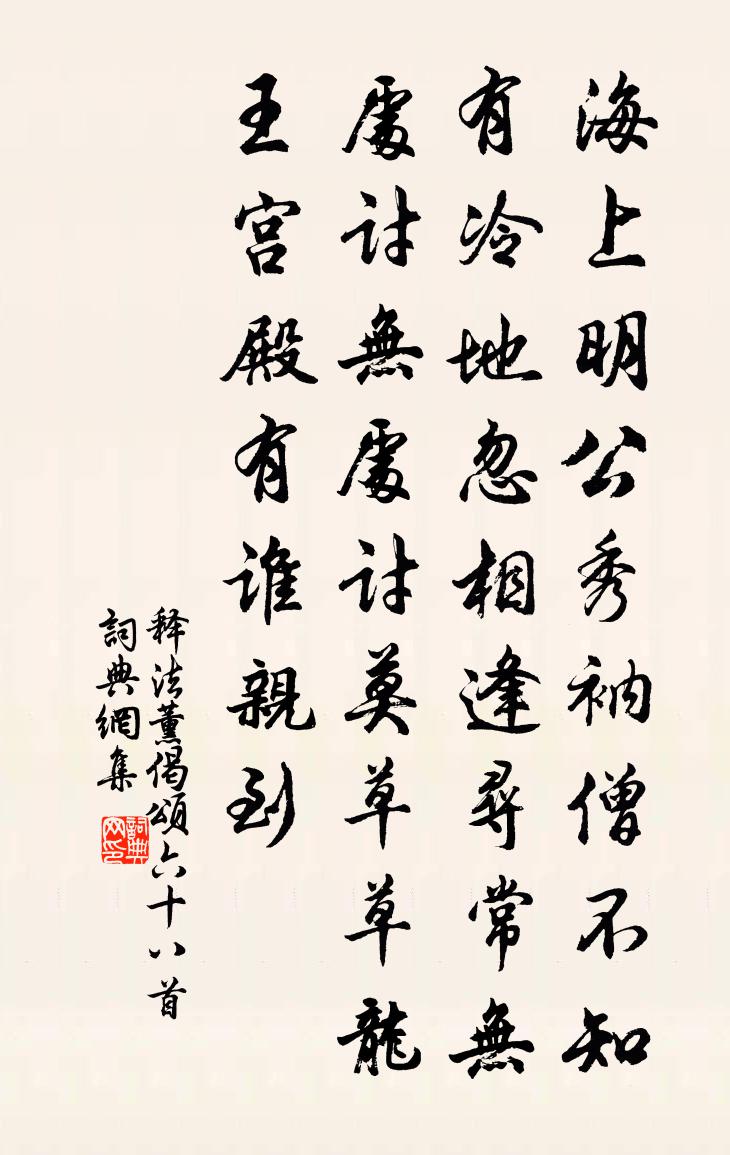 詩詞名句歷史字典書法欣賞書法字典國語詞典說文解字康熙字典古漢語字典標 題 作 者 詩 句 偈頌六十八首作者:釋法薰 朝代:宋代偈頌六十八首原文海上明公秀,衲僧不知有。冷地忽相逢,尋常無處討。無處討,莫草草,龍王宮殿,有誰親到。詩詞問答問:偈頌六十八首的作者是誰?答:釋法薰問:偈頌六十八首寫於哪個朝代?答:宋代釋法薰偈頌六十八首書法欣賞偈頌六十八首書法作品詩詞推薦元夕立春喜晴於是郡人久不出矣葉適〔宋代〕艾褐家紬闊闊裁,抱孫攜子看燈來。余甘暫棄從教覓,莫斗機心漫自猜。太湖詩聖姑廟(在大姑山。晉王彪二女)皮日休〔唐代〕洛神有靈逸,古廟臨空渚。暴雨駁丹青,荒蘿繞樑梠。野風旋芝蓋,飢烏銜椒糈。寂寂落楓花,時時斗鼯鼠。常雲瀟湘神 零陵作屈大均〔清代〕瀟水長,湘水長,三湘最苦是瀟湘。無限淚痕斑竹上,幽蘭更作二妃香。和龐學士藍方〔宋代〕仰告明君乞得身,不妨林下戴紗巾。滿斟村酒浮瓊蟻,旋釣溪魚鱠錦鱗。元府烏鴉飛後夜,洞中花木鎮長春。吾官靈泉寺樓鐩〔宋代〕孺興往事亦難明,對景思人想獨清。黃絹異時留好語,幽泉千古擅佳名。五星巧作聯珠勢,一派嘗聞瀉玉聲。他日寫意二首牟融〔唐代〕寂寥琴荒館閉閒琴門,苔徑琴陰陰屐少痕。白髮顛狂塵夢斷,青氈泠落客心存。高山流水琴三弄,明月清風琴一樽講稿公妓飲問政堂有誚予不來者借韻呈司戶同虞儔〔宋代〕幾日齋廚愧索然,信君高會拚金錢。邇來此樂城中少,況有今宵座上妍。連放酒杯浮瀲灩,須防更漏解催煎。閉門淨光松風閣葉適〔宋代〕城中雲日如火催,淨光行食聲轉雷。不知何處白蘋起,便有滿坐清風來。莫言作樓非急務,翁當運斤兒執鋸。待得菩薩蠻陳允平〔宋代〕銀城遠枕清江曲。汀洲盡畫蒹葭綠。君上木蘭舟。妾愁雙鳳樓。角聲何處發。月浸溪橋雪。獨自倚闌看。風飄襟袖南鄉子歐陽修〔宋代〕翠密紅繁。水國涼生未是寒。雨打荷花珠不定,輕翻。冷潑鴛鴦錦翅斑。盡日憑闌。弄蕊拈花仔細看。偷得裊蹄新八詠詩 會圃臨春風沈約〔南北朝〕臨春風。春風起春樹。遊絲曖如網。落花雰似霧。先泛天淵池。還過細柳枝。蝶逢飛搖揚。燕值羽參池。揚桂旆。再過超然台贈太守霍翔蘇軾〔宋代〕昔飲雩泉別常山,天寒歲在龍蛇間。山中兒童拍手笑,問我西去何當還。十年不赴竹馬約,扁舟獨與漁蓑閒。重來送河北轉運使陳修撰學士梅堯臣〔宋代〕河隍多宿兵,兵食固所須。幸時不戰鬥,畜養安可無。古興十萬師,七十萬家輟耕鋤。今來歲調餉,且與往昔殊。句錢惟演〔宋代〕漢幟隨移帳,燕鴻伴解鞍。白樓亭徐天佑〔宋代〕江左名流共往還,白樓何許只青山。不須商略閒今古,物換星移俯仰間。贈九江太守張蠙〔唐代〕江頭暫駐木蘭船,漁父來夸太守賢。二邑旋添新戶口,四營漸廢舊戈鋋。笙歌不似經荒後,禮樂猶如未戰前。昨日游梅壇有感吳季先〔宋代〕小立仙壇挹斗箕,著身高處覺天低。南昌吏隱清風在,喚醒時人局面迷。臘日陶淵明〔魏晉〕風雪送餘運,無妨時已和。梅柳夾門植,一條有佳花。我唱爾言得,酒中適何多!未能明多少,章山有奇歌。訪白陂陳處士樂史〔宋代〕清風不見面,白汗呈波流。走來君洞裡,雲樹冷颼颼。更瀉葡萄綠,千杯活倒愁。魂疑更回首,殘熱又為讎。鐵幢浦王安石〔宋代〕憶昨初為海上行,日斜來往看潮生。如今身是西歸客,回首山川覺有情。名句推薦月兒彎彎照九州,幾家歡樂幾家愁。佚名《月兒彎彎照九州》 教人學而執有命,是猶命人葆而去其冠也。墨子《墨子·48章 公孟》 雞鳴紫陌曙光寒,鶯囀皇州春色闌。岑參《奉和中書舍人賈至早朝大明宮》 念去來、歲月如流,徘徊久、嘆息愁思盈。周邦彥《綺寮怨·上馬人扶殘醉》 佇聽寒聲,雲深無雁影。周邦彥《關河令·秋陰時晴漸向暝》 無奈朝來寒雨,晚來風。李煜《相見歡·林花謝了春紅》 待人寬一分是福,利人實利己的根基。洪應明《菜根譚·概論》 地白風色寒,雪花大如手。李白《嘲王歷陽不肯飲酒》 便覺眼前生意滿,東風吹水綠參差。張栻《立春偶成》 樹德務滋,除惡務本佚名《尚書·周書·泰誓》