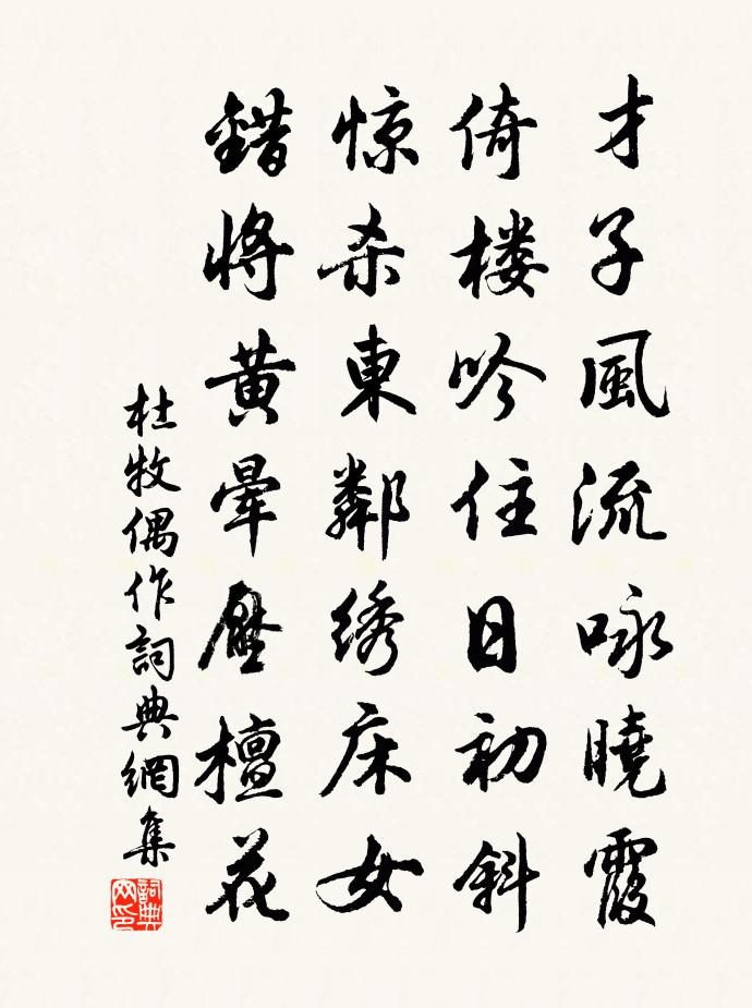 詩詞名句歷史字典書法欣賞書法字典國語詞典說文解字康熙字典古漢語字典標 題 作 者 詩 句 偶作作者:杜牧 朝代:唐代偶作原文才子風流詠曉霞,倚樓吟住日初斜。驚殺東鄰繡床女,錯將黃暈壓檀花。詩詞問答問:偶作的作者是誰?答:杜牧問:偶作寫於哪個朝代?答:唐代問:偶作是什麼體裁?答:七絕問:杜牧的名句有哪些?答:杜牧名句大全杜牧偶作書法欣賞偶作書法作品詩詞推薦府酒五絕。變法白居易〔唐代〕自慚到府來周歲,惠愛威稜一事無。唯是改張官酒法,漸從濁水作醍醐。木蘭花慢·武林歸舟中作董士錫〔清代〕看斜陽一縷,剛送得,片帆歸。正岸繞孤城,波回野渡,月暗閒堤。依稀是誰相憶?但輕魂如夢逐煙飛。贏得雙雙水調歌頭·和龐佑父張孝祥〔宋代〕雪洗虜塵靜,風約楚雲留。何人為寫悲壯,吹角古城樓。湖海平生豪氣,關塞如今風景,剪燭看吳鉤。勝喜然犀處贈毛仙翁崔元略〔唐代〕莫將凡聖比雲泥,椿菌之年本不齊。度世無勞大稻米,升天只用半刀圭。人間嗟對黃昏槿,海上閒聽碧落雞。旌節淥水詞許琮〔宋代〕綠草回波漾青草,鷓鴣聲緊連枝老。苔陰欲上簾影低,鳥語催人天未曉。曉起輕寒奈薄羅,風前縷帶不勝波。練裙減字木蘭花王觀〔宋代〕三皇五帝。古代英雄閒爭氣。勇猛韓彭。十大功勞空有名。休談人我。大限催煎如何嚲。前酌觥舡。祝壽如同海月登城陽山許文蔚〔宋代〕我祖有遺蹟,振屐訪南嶺。憑高一以眺,萬壑皆雲煙。谷鳥猶嚶嚶,遼鶴無時旋。一飲丹池心,心中塵慮捐。老去吟邵雍〔宋代〕行年六十有三歲,二十五年居洛陽。林靜城中得山景,池平坐上見江鄉。賞花長被杯盤苦,愛月屢為風露傷。看了生日病腹疾書事方回〔宋代〕今年六十二,棄官八年矣。生世業已休,來日凜無幾。孰謂嘗作郡,旦暮窘薪米。少時頗豪宕,晚乃窮如此。此事雲吳融〔唐代〕南北東西似客身,遠峰高鳥自為鄰。清歌一曲猶能住,莫道無心勝得人。四水合流李沛〔唐代〕禹鑿山川地,因通四水流。縈迴過鳳闕,會合出皇州。天影長波里,寒聲古度頭。入河無晝夜,歸海有謙柔。順物歸雲亭釋仲皎〔宋代〕一從飛出岫,舒捲意何長。作雨遍天下,乘風歸帝鄉。無心憐灑落,到處自清涼。縹緲來空碧,吟邊帶夕陽。潘茂洪出疆回以汴都畫山水扉見遺報之五言張鎡〔宋代〕嵩華平生夢,騎驢未得游。橐中分雅惠,掌上起新秋。報國何能早,埯時莫漫憂。祗尖長近眼,過夏亦慵收。見敏中初到邠寧秋日登城樓詩,詩中頗多鄉思白居易〔唐代〕想爾到邊頭,蕭條正值秋。二年貧御史,八月古邠州。絲管聞雖樂,風沙見亦愁。望鄉心若苦,不用數登樓。題松汀驛張祜〔唐代〕山色遠含空,蒼茫澤國東。海明先見日,江白迥聞風。鳥道高原去,人煙小徑通。那知舊遺逸,不在五湖中。仲春郊外王勃〔唐代〕東園垂柳徑,西堰落花津。物色連三月,風光絕四鄰。鳥飛村覺曙,魚戲水知春。初晴山院裡,何處染囂塵。贈歐陽成判官晁補之〔宋代〕一言子產識然明,白首憐君獨抱經。去馬來牛隨白日,落花飛絮得浮名。曳裾五府非良計,發憤三書亦漫成。便作陪宣撫置酒南樓曹勛〔宋代〕遠業嘗輕萬戶侯,今陪笑語庾公樓。聲空冀北一曲妙,木落淮南千里秋。酒興勇隨高意上,月華影入大江流。主人素梅 五一王冕〔元代〕湖上無書問老逋,冰霜岩壑迥清孤。二更月出天全白,轉首春風是畫圖。秋意劉子翬〔宋代〕又見庭梧一葉飛,物華心事兩差池。百年未半老相逼,四序平分秋獨悲。過岸山川雲漠漠,殘燈院落雨絲絲。客懷名句推薦萬里橋西一草堂,百花潭水即滄浪。杜甫《狂夫》 簾外雨潺潺,春意闌珊。李煜《浪淘沙令·簾外雨潺潺》 在家不會迎賓客,出門方知少主人。佚名《增廣賢文·上集》 若是前生未有緣,待重結、來生願。樂婉《卜運算元·答施》 人生得意須盡歡,莫使金樽空對月。李白《將進酒》 月兒彎彎照九州,幾家歡樂幾家愁。佚名《月兒彎彎照九州》 百王之無變,足以為道貫。一廢一起,應之以貫,理貫不亂。不知貫,不知應變。荀子《荀子·天論》 桃李待日開,榮華照當年。李白《長歌行》 輕肌弱骨散幽葩,更將金蕊泛流霞。蘇軾《趙昌寒菊》 春生、夏長、秋收、冬藏,天之正也王詡《鬼谷子·持樞》