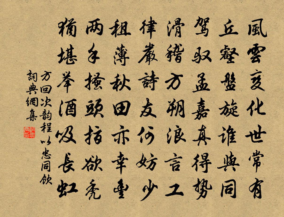 詩詞名句歷史字典書法欣賞書法字典國語詞典說文解字康熙字典古漢語字典標 題 作 者 詩 句 次韻程以忠同飲作者:方回 朝代:宋代次韻程以忠同飲原文風雲變化世常有,丘壑盤旋誰與同。駕馭孟嘉真得勢,滑稽方朔浪言工。律嚴詩友何妨少,租薄秋田亦幸豐。兩手搔頭指欲禿,猶堪舉酒吸長虹。詩詞問答問:次韻程以忠同飲的作者是誰?答:方回問:次韻程以忠同飲寫於哪個朝代?答:宋代方回次韻程以忠同飲書法欣賞次韻程以忠同飲書法作品詩詞推薦和梁簽判潁州西湖十三題西湖蘇頌〔宋代〕椒澤疏源勢不休,繞城冰玉湛寒流。鳧鷖容與菰蒲亂,占得江湖一望秋。湖南江西道中十首劉克莊〔宋代〕蠻府參軍鬢髮蒼,自調欸乃答漁郎。從今詩律應超脫,新吸瀟湘入肺腸。耕織嘆趙汝鐩〔宋代〕春催農工動阡陌,耕犁紛紜牛背血。種蒔已遍復耘耔,久晴渴雨車聲發。往來邏視曉夕忙,香穗垂頭秋登場。一年劍器詞三首姚合〔唐代〕聖朝能用將,破敵速如神。掉劍龍纏臂,開旗火滿身。積屍川沒岸,流血野無塵。今日當場舞,應知是戰人。晝渡次韻子瞻和子由觀韓乾馬因論伯畫天馬黃庭堅〔宋代〕于闐花驄龍八尺,看雲不受絡頭絲。西河驄作蒲萄錦,雙瞳夾鏡耳卓錐。長楸落日試天步,知有四極無由馳。電行念奴嬌(次韻玉林寄示)馮取洽〔宋代〕高堂素壁,漫生綃十幅,圖張消暑。不奈火雲燒六合,逃也略無逃處。小派秋聲,巨籭涼點,吸欻來何許。故人詞踏莎行(戊寅秋客中懷錢塘舊遊)柴元彪〔宋代〕淡柳平蕪,亂煙疏雨。雁聲叫徹蘆花渚。亭前落葉又西風,斷送離懷無著處。切切歸期,盈盈尺素。斷魂正在西興重陽後菊花二首范成大〔宋代〕寂莫東籬濕露華,依前金魘照泥沙。世情兒女無高韻,只看重陽一日花。中書令程文簡輓辭三首蘇頌〔宋代〕星墜寢門夕,歌興夢奠時。騎箕良弼去,罷社國人悲。富貴驚川逝,功名白日垂。只應金石刻,無愧伯喈辭。禪人寫真求贊釋正覺〔宋代〕不以律拘,不以禪縛。說法口窄,默游步闊。草木陽春來,池塘明月落,何妨處處相安著。江城子(萍鄉王聖俞席上作)侯置〔宋代〕萍蓬蹤跡幾時休。盡飄浮。為君留。共話當年,年少氣橫秋。莫嘆兩翁俱白髮,今古事,盡悠悠。西風吹夢入江樓思省吟邵雍〔宋代〕仲尼再思,魯子三省。予何人哉,敢忘修整。送董頲戴叔倫〔唐代〕霜雁群飛下楚田,羈人掩淚望秦天。君行江海無定所,別後相思何處邊。奉和聖制送鄧王牧宣城湯悅〔唐代〕千里陵陽同陝服,鑿門胙土寄親賢。曙煙已別黃金殿,晚照重登白玉筵。江上浮光宜雨後,郡中遠岫列窗前。天心賀郡守得江陰敖陶孫〔宋代〕檢點詩篇方細讀,忽傳新渥照澄江。榮公銅虎非渠事,舊憶河豚是此邦。蕭散蓋公宜置舍,風流謝守想臨窗。他時代悲白頭翁 / 白頭吟 / 有所思劉希夷〔唐代〕洛陽城東桃李花,飛來飛去落誰家?洛陽女兒惜顏色,坐見落花長嘆息。今年花落顏色改,明年花開復誰在?已見到巴川縣日熾不可行遂留宿用明復留題韻郭印〔宋代〕避暑巴川館,憑欄瞰水濆。馬牛紛浴汗,鵝鴨亂翻紋。潦濁難為鑑,天昏不辨雲。清泉何處是,一卓飯吾軍。梁父吟張耒〔宋代〕豪俊昔未遇,白日無光輝。隆中臥龍客,長嘯視群兒。九州英雄爭著鞭,黃星午夜照中原。君看慷慨有心者,乃是九華隱士居陳生寄松管筆梅堯臣〔宋代〕春松抽瘦梗,削束費長毫。雞距初含潤,龍鱗不自韜。嘗為大夫後,欲寫伯夷高。一獲山家贈,令吾媿汝曹。陪王漢州留杜綿州泛房公西湖(房琯刺漢州時所鑿)杜甫〔唐代〕舊相恩追後,春池賞不稀。闕庭分未到,舟楫有光輝。豉化蓴絲熟,刀鳴鱠縷飛。使君雙皂蓋,灘淺正相依。名句推薦嶺南能有幾多花,寒食臨之掃春跡。鄭剛中《寒食》 樹挪死,人挪活。佚名《增廣賢文·下集》 新葉初冉冉,初蕊新霏霏。謝朓《詠落梅》 猶有遺簪,不展秋心,能卷幾多炎熱。張炎《疏影·詠荷葉》 八月長江萬里晴,千帆一道帶風輕。崔季卿《晴江秋望》 碧虛無雲風不起,山上長松山下水。劉禹錫《八月十五夜桃源玩月》 君子務修其內而讓之於外。荀子《荀子·儒效》 雙星良夜,耕慵織懶,應被群仙相妒。范成大《鵲橋仙·七夕》 好言難得,惡語易施。佚名《增廣賢文·上集》 普天皆滅焰,匝地盡藏煙。沈佺期《寒食》