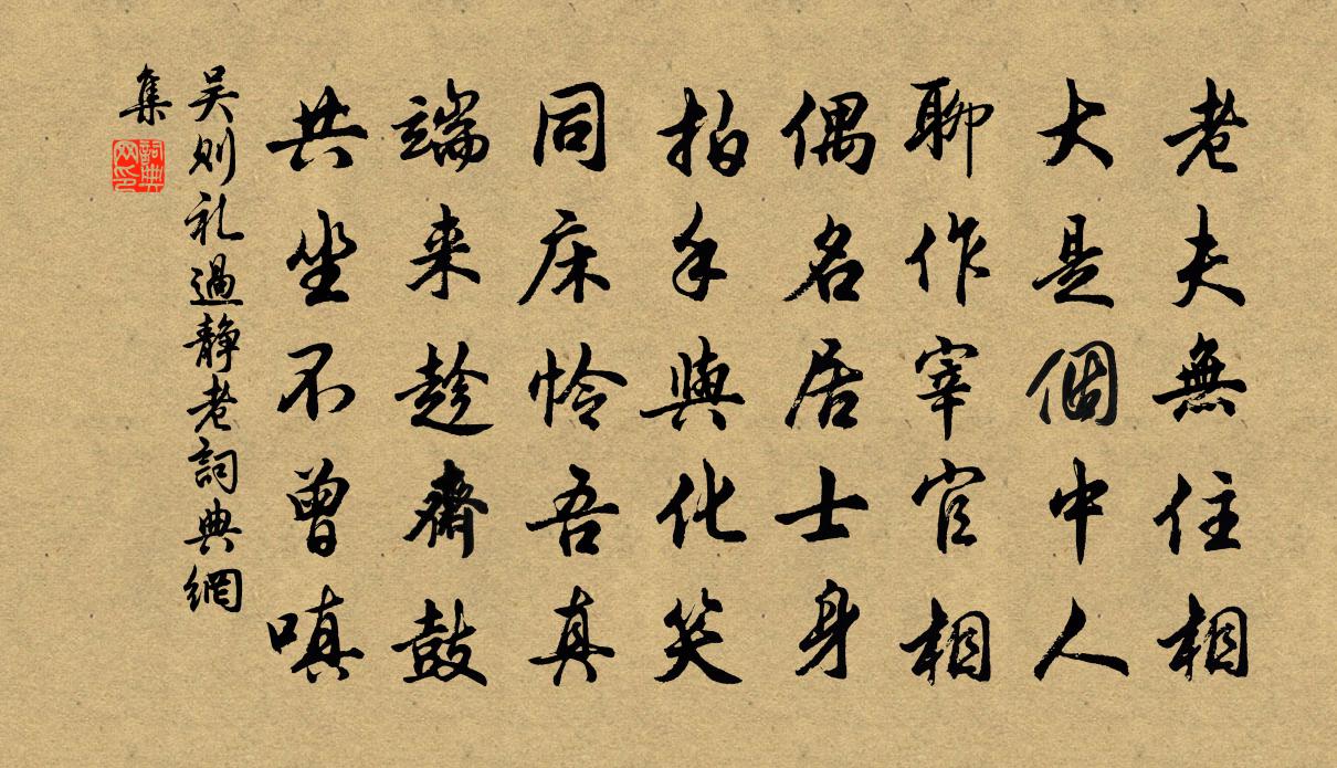 詩詞名句歷史字典書法欣賞書法字典國語詞典說文解字康熙字典古漢語字典標 題 作 者 詩 句 過靜老作者:吳則禮 朝代:宋代過靜老原文老夫無住相,大是箇中人。聊作宰官相,偶名居士身。拍手與化笑,同床憐吾真。端來趁齋鼓,共坐不曾嗔。詩詞問答問:過靜老的作者是誰?答:吳則禮問:過靜老寫於哪個朝代?答:宋代吳則禮過靜老書法欣賞過靜老書法作品詩詞推薦讀史陸游〔宋代〕民間斗米兩三錢,萬里耕桑罷戍邊。常使屏風寫無逸,應無烽火照甘泉。王華僑卿所居甚隘而看山亭依浮圖之址卓然孤姜特立〔宋代〕吾憐廛市人,偪仄煙火隘。六月圍炎蒸,引吭思大噫。誰知蜂螘聚,卻躡鯨鰲背。近山羅前檐,遠岫落天外。浮圖詩曹植〔魏晉〕秋商氣轉微涼。讀文丞相宋瑞詩連文鳳〔宋代〕宰相臨危不辱身,晉周惟有兩忠臣。國亡分載身方死,今古更無第二人。長安游於鵠〔唐代〕久臥長安春復秋,五侯長樂客長愁。繡簾朱轂逢花住,錦幨銀珂觸雨游。何處少年吹玉笛,誰家鸚鵡語紅樓。年年和答劉太博攜家游廬山見寄黃庭堅〔宋代〕緩轡松陰不起塵,嵐山經雨一番新。遙知數夜尋山宿,便是全家避世人。落日已 * 際路,飛花還報洞中春。可憐以長歌意無極好為老夫聽為韻奉別沔鄂親友姜夔〔宋代〕詩人辛國士,句法似阿駒。別墅滄浪曲,綠陰禽鳥呼。頗參金粟眼,漸造文字無。兒輩例學語,屋壁祝蒲盧。和吳達夫見過留題賀鑄〔宋代〕雀羅門巷不容車,杖履相過一試茶。後日相思會乘興,五雲溪上是儂家。幽懷陸游〔宋代〕苫茅架竹亦吾廬,病起幽懷得小攄。愛酒已捐身外事,閉門猶讀死前書。鄰家人喜添新犢,小市奴歸得早蔬。但使句李申子〔宋代〕[缺]深城紅塵,怎得侵[缺]骨雲岩檜老險驚[缺]興廢一掬清泉酌古[缺]沈寂徘徊覓句聽市[缺]孟子貴貴尊賢陳普〔宋代〕貴貴如天禮極隆,無人更識下賢風。豈知坤位居乾上,天地之交泰道通。甘將軍廟程珌〔宋代〕沙寒日薄水雲愁,賊魏王吳一夜休。自是英雄元不死,至今猶占大江流。驀山溪陳濟翁〔宋代〕去年今日,從駕游西苑。彩仗壓金波,看水戲、魚龍曼衍。寶津南殿,宴坐近天顏,金杯酒,君王勸。頭上宮花顫常州留別耿湋〔唐代〕萬里南天外,求書禹穴間。往來成白首,旦暮見青山。夜浦涼雲過,秋塘好月閒。殷勤陽羨桂,別此幾時攀。陪晦翁登妙高峰一首王阮〔宋代〕千崖盤屈曲,一塔矗空濛。它處只山好,此中兼水洪。縱觀疑犯斗,飛上覺凌風。常恨天難近,今朝路已通。留題授上人曲肱齋汪澈〔宋代〕一室安貼缽,{左禿右貴}然了性空。曲肱忘世夢,行腳本家風。山靜人稀到,窗開意不窮。我來頻假寐,樂亦在張主簿東齋歐陽修〔宋代〕官舍掩寒扉,聊同隱者棲。浮流穿竹過,山鳥入城啼。賓主高談勝,心冥外物齊。惟應朝枕夢,長厭隔鄰雞。挽奉議劉公度四首陳棣〔宋代〕平生學術在斯民,蘊積淵源百未伸。邊障掾曹聊小試,一城惠愛已如春。感興蒲壽宬〔宋代〕晨起自理髮,握髮雙淚流。不見結髮人,惆悵空白頭。君留白髮種,種作一段愁。茁哉秋蓬根,念此春荑柔。即事陸游〔宋代〕小山榴花照眼明,青梅自墮時有聲。柳橋東岸倚筇立,聊借水風吹宿醒。名句推薦存科名之心者,未必有琴書之樂王永彬《圍爐夜話·第二六則》 胡馬嘶風,漢旗翻雪,彤雲又吐,一竿殘照。時彥《青門飲·寄寵人》 不是一番寒徹骨,怎得梅花撲鼻香!馮夢龍《醒世恆言·卷十七》 江上陰雲鎖夢魂,江邊深夜舞劉琨。譚用之《秋宿湘江遇雨》 擁紅妝,翻翠蓋,花影暗南浦。高觀國《祝英台近·荷花》 別夢依依到謝家,小廊回合曲闌斜。張泌《寄人》 今日樓台鼎鼐,明年帶礪山河辛棄疾《西江月·堂上謀臣尊俎》 桃李風前多嫵媚,楊柳更溫柔。辛棄疾《武陵春·桃李風前多嫵媚》 幽人歸獨臥,滯慮洗孤清。張九齡《感遇十二首》 儉節則昌,淫佚則亡。墨子《墨子·06章 辭過》