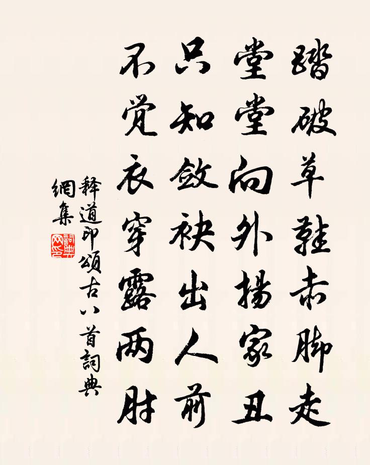 詩詞名句歷史字典書法欣賞書法字典國語詞典說文解字康熙字典古漢語字典標 題 作 者 詩 句 頌古八首作者:釋道印 朝代:宋代頌古八首原文踏破草鞋赤腳走,堂堂向外揚家醜。只知斂袂出人前,不覺衣穿露兩肘。詩詞問答問:頌古八首的作者是誰?答:釋道印問:頌古八首寫於哪個朝代?答:宋代釋道印頌古八首書法欣賞頌古八首書法作品詩詞推薦又雨霽登樓程公許〔宋代〕雨霽憑欄物色佳,鬅鬙疊嶂斂煙霾。羈愁要著誰陶寫,且把昏眵為一揩。無俗念佚名〔宋代〕茅庵交坐,任清虛冷淡,心香頻*。認得元初真面目,萬法同歸無別。行若閒雲,坐猶空谷,動靜成休歇。重玄之次韻仇仁近用韻見示五首方回〔宋代〕時驚驛走聽庭宣,老朽於予孰使年。鳴玉久忘綪結佩,穿花空憶錦連錢。愧非今代王摩詰,許識能詩孟浩然。野服明月皎夜光佚名〔兩漢〕明月皎夜光,促織鳴東壁。玉衡指孟冬,眾星何歷歷!白露沾野草,時節忽復易。秋蟬鳴樹間,玄鳥逝安適?昔我贈玉隆都監周抱一姚勉〔宋代〕一別丹霞洞,何年到此邦。犬隨燒藥鼎,鶴伴改詩窗。談柄風生席,清標月在江。西山聞欲隱,來訪鹿門龐。哭陸丞相秀夫方鳳〔宋代〕祚微方擁幼,勢極尚扶顛。鰲背舟中國,龍胡水底天。鞏存周已晚,蜀盡漢無年。獨有丹心皎,長依海日懸。蝦子和尚贊釋智遇〔宋代〕清溪影寒,以蝦為目。無柄笊籬,東摝西摝。古意張耒〔宋代〕樓上珠簾拂疏網,卻勻愁黛對凌波。也知新舊爭多少,敢話機頭織素多。登樓絕句和者甚多又從而用韻擇其可錄者錄之戴復古〔宋代〕心地清涼日日秋,怕沾塵土莫低頭。置身不在眾人下,處處皆成百尺樓。吊盈盈三首王山〔宋代〕弦絕秦箏鏡任塵。細腰休舞鳳凰茵。一枝濃艷埋香土,萬顆珍珠涇袖巾。行雨不歸魂夢斷,落花難伴綺羅春。漢皇晝寢樓鑰〔宋代〕彈徹悲風更廣陵,滄浪一為濯塵纓。邯鄲枕上夢初覺,喜聽檐閒秋雨聲。游虎丘寺曾幾〔宋代〕重遊吳子國,又入虎丘山。長日挽人住,好風將我還。兒童陪勝踐,長老記衰顏。無復尹和靖,西庵空掩關。祝英台曹勛〔宋代〕晚寒濃,殘雪重,春意在何許。萼綠仙姿,海上未飛去。粲粲玉立丰標,天寒日暮,笑東風、不曾輕付。幾凝佇。以羔裘如濡洵美且侯韻為八詩送夾穀子括赴明戴表元〔宋代〕水耕當用牛,陸行當用馬。詩書無近功。平世安可舍。吾州兵荒來,冠蓋多苟且。大雲寺二十韻元稹〔唐代〕地勝宜台殿,山晴離垢氛。現身千佛國,護世四王軍。碧耀高樓瓦,赬飛半壁文。鶴林縈古道,雁塔沒歸雲。幡影郊居寄友人李頻〔唐代〕林色樹還曛,何時得見君?獨居度永日,相去遠浮雲。故疾隨秋至,離懷覺夜分。蛩聲非自苦,偏是旅人聞。景祐大享明堂二首佚名〔宋代〕偃革興文,封浴考瑞。威烈巍巍,允膺宗祀。經舊遊張祜〔唐代〕去年來送行人處,依舊蟲聲古岸南。斜日照溪雲影斷,水葓花穗倒空潭。東坡除夜三十九遂引樂天行年三十九歲暮日斜姜特立〔宋代〕昔人三十九,已嘆日斜時。吾今七十六,屈指一倍之。豈唯桑榆晚,正自入崦嵫。灰中炭暗盡,豈不心自知。且飲題嚴子陵釣台姚勉〔宋代〕懷仁輔義戒阿諛,萬古先生兩句書。長往不來安有此,如知王佐在樵漁。名句推薦英雄行險道,富貴似花枝。佚名《增廣賢文·上集》 自從一閉風光後,幾度飛來不見人。李益《隋宮燕》 素娥惟與月,青女不饒霜。李商隱《十一月中旬至扶風界見梅花》 擊楫中流,曾記淚沾裳李好古《江城子·平沙淺草接天長》 殘日東風,不放歲華去。吳文英《祝英台近·除夜立春》 明朝望鄉處,應見隴頭梅。宋之問《題大庾嶺北驛》 青山依舊在,幾度夕陽紅。楊慎《臨江仙·滾滾長江東逝水》 君子博學而日參省乎己,則知明而行無過矣。荀子《荀子·勸學》 若農服田力穡,乃亦有秋。佚名《尚書·商書·盤庚上》 草春榮而冬枯,至於極枯,則又生矣王永彬《圍爐夜話·第六九則》