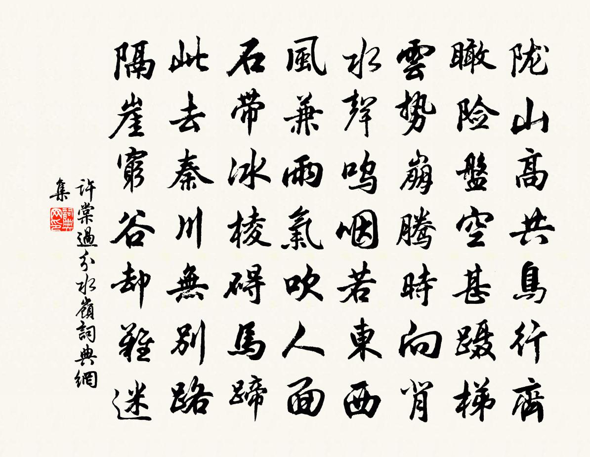 詩詞名句歷史字典書法欣賞書法字典國語詞典說文解字康熙字典古漢語字典標 題 作 者 詩 句 過分水嶺作者:許棠 朝代:唐代過分水嶺原文隴山高共鳥行齊,瞰險盤空甚躡梯。雲勢崩騰時向背,水聲嗚咽若東西。風兼雨氣吹人面,石帶冰棱礙馬蹄。此去秦川無別路,隔崖窮谷卻難迷。詩詞問答問:過分水嶺的作者是誰?答:許棠問:過分水嶺寫於哪個朝代?答:唐代問:過分水嶺是什麼體裁?答:七律許棠過分水嶺書法欣賞過分水嶺書法作品注釋全唐詩:卷604-35詩詞推薦李參政折贈黃香梅與八詠俱至用韻以謝魏了翁〔宋代〕露拂薔薇不太深,春風庭院晚陰陰。來遲未入黃昏句,誰喚錢塘人姓林。答陳再次前韻蘇頌〔宋代〕牛斗經年望建標,忽聞行李度南譙。仙舟復喜逢元禮,飛御仍煩接子喬。已試演綸成典冊,尚勞分竹偃藩朝。海沂在伯用銅字韻作詩複次韻二首趙蕃〔宋代〕閉門憐我欠新功,下筆奇君有古風。豈但眾多窮草木,更能瑣細及魚蟲。昔人要作有為者,後世多歸亡是公。嘆息嚴陵釣台周弼〔宋代〕晴江萬里綠波來,惆悵君房去不回。秦苑河山歸故國,越鄉雲雨庇荒台。春風一道江蘺綠,落日千峰杜宇哀。欲訪酬趙尚書杏園花下醉後見寄(時為太常卿)權德輿〔唐代〕春光深處曲江西,八座風流信馬蹄。鶴髮杏花相映好,羨君終日醉如泥。謁金門鄭覺齋〔宋代〕秋夜永。葉葉梧桐霜冷。皓月窺人深院靜。孤鴻窗外影。情是相思深井。恩是相思修綆。別後信音渾不定。銀瓶何鄭昂叔和余問盜詩末及山東事弟侄輩又問山東五邁〔宋代〕江左百年來,英雄老歲月。空糜東南財,坐廩驕惰卒。嘉定懲開禧,廢食因一咽。國論規便安,神州聽淪沒。和戎書會溪郴陽瀑布圖後三首蒲壽宬〔宋代〕山椒斫寒翠,澗曲披玄圖。寫此一派潤,化作萬頃腴。誰知田中禾,粒粒心上珠。次韻樂順之司理新釋花松花江及上元不張燈二周必大〔宋代〕一自樂卿司樂籍,夭桃穠李斗誇張。陰成卻落他人手,始悟分廂作法涼。次韻明仲畦字韻詩劉子翬〔宋代〕祝融散仙在西溪,此老平生無町畦。一日不見十日恨,綠稻渺渺吞幽思。細紅時澆壘塊胸,跣行笑逆泠然風。意消招西洞道者李昭象〔唐代〕危峰抹黛夾晴川,樹簇紅英草碧煙。樵客雲僧兩無事,此中堪去覓靈仙。西湖湯仲友〔宋代〕山色波光步步隨,古今難畫亦難詩。水浮亭館花間出,船載笙歌柳外移。過眼年華如去鳥,惱人春色似遊絲。六橋雨夜贈元十八白居易〔唐代〕卑濕沙頭宅,連陰雨夜天。共聽檐溜滴,心事兩悠然。把酒循環飲,移床曲尺眠。莫言非故舊,相識已三年。謝人惠石筍邵雍〔宋代〕誰將天柱峰,快刀割一半。泉漱痕微清,雲抱色猶見。權門不能移,富室不能轉。則予何人哉,當閻君之獻。謁金門李萊老〔宋代〕春意態。閒卻遠山橫黛。香徑莓苔嗟粉壞。鳳靴雙鬥彩。折得花枝懶戴。猶戀鴛鴦飛蓋。舊恨新愁都只在。東風吹自悼張嵲〔宋代〕銀山卷浪萬雷鳴,渚水諸灘險永清。平日垂堂猶自戒,年來輕作二江行。集賢殿考試罷二首蘇轍〔宋代〕振鷺紛紛未著行,初從江海覘清光。卷聲風雨中庭起,筆勢雲煙累幅長。病眼尚能分白黑,眾毛空複數驪黃。禁中月當窗(寓霜天曉角)張輯〔宋代〕看朱成碧。曾醉梅花側。相遇匆匆相別,又爭似、不相識。南北。千里隔。幾時重見得。最苦子規啼處,一片月、晦日宴高氏林亭徐皓〔唐代〕綺筵乘暇景,瓊醑對年華。門多金埒騎,路引璧人車。蘋早猶藏葉,梅殘正落花。藹藹林亭晚,餘興促流霞。晦晚六言三首劉克莊〔宋代〕錦機組織尤巧,紙田收穫甚微。即今束閣藏起,多時掃閣載歸。名句推薦塘上有塔院,中秋夜曾隨吾父觀潮於此。沈復《浮生六記·浪遊記快》 自見之謂明。韓非及後人《韓非子·喻老》 不明察,不能燭私。韓非及後人《韓非子·孤憤》 想當年,金戈鐵馬,氣吞萬里如虎。辛棄疾《永遇樂·京口北固亭懷古》 不違農時,谷不可勝食也孟子《孟子·梁惠王章句上·第三節》 力田已告成,計日宜收藏。黃燮清《秋日田家雜詠》 晚春盤馬踏青苔,曾傍綠陰深駐。晏幾道《御街行·街南綠樹春饒絮》 謝亭離別處,風景每生愁。李白《謝公亭·蓋謝朓范雲之所游》 目之於色也,有同美焉。孟子《孟子·告子章句上·第七節》 孤眠鸞帳里,枉勞魂夢,夜夜飛揚。佚名《鳳歸雲·閨怨》