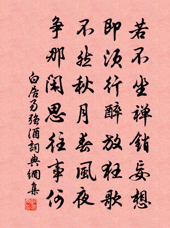 詩詞名句歷史字典書法欣賞書法字典國語詞典說文解字康熙字典古漢語字典標 題 作 者 詩 句 強酒作者:白居易 朝代:唐代強酒原文若不坐禪銷妄想,即須行醉放狂歌。不然秋月春風夜,爭那閒思往事何?詩詞問答問:強酒的作者是誰?答:白居易問:強酒寫於哪個朝代?答:唐代問:強酒是什麼體裁?答:七絕問:白居易的名句有哪些?答:白居易名句大全白居易強酒書法欣賞強酒書法作品注釋全唐詩詩詞推薦論俗十二首劉子翬〔宋代〕愚氓擾潢池,囏難亦常態。簪紳有包藏,事異吁可怪。豺聲久伺亂,鯨戮終何悔。游言張凶焰,巧諜移機會。初如登山望海四首張耒〔宋代〕江闊風煙易晚,山高草木先秋。獨倚闌乾盡日,此身與世悠悠。和渾興庵超然即事韻張繼先〔宋代〕自得逍遙趣,從來樂靜居。水邊紅杏小,煙外翠篁疏。有物真常應,忘形內本虛。人間役塵慮,到此盡消除。芳樹納蘭性德〔清代〕連理無分影,同心豈獨芳?傍檐巢翡翠,臨水宿鴛鴦。葉葉含春思,枝枝向畫廊。君情若比樹,妾意復何傷?陌上題劉相公三湘圖郎士元〔唐代〕昔別醉衡霍,邇來憶南州。今朝平津邸,兼得瀟湘游。稍辨郢門樹,依然芳杜洲。微明三巴峽,咫尺萬里流。飛鳥人日重宴大明宮恩賜彩縷人勝應制蘇頲〔唐代〕疏龍磴道切昭回,建鳳旗門繞帝台。七葉仙蓂依月吐,千株御柳拂煙開。初年競貼宜春勝,長命先浮獻壽杯。是日月台觀月陳文蔚〔宋代〕秋來無日不登臨,獨喜今宵月滿襟。仰面青天思把酒,寄情古調欲攜琴。涼風舞袂身將舉,白露沾衣夜向深。要看謝文靖墓下作(時閩嶺用師,契丹陷梁宋)徐鉉〔唐代〕越徼稽天討,周京亂虜塵。蒼生何可奈,江表更無人。豈憚尋荒壟,猶思認後身。春風白楊里,獨步淚沾巾。句錢惟演〔宋代〕正好睡時行十里,不交談處飲三杯。游{上若下山}山寺常令孫〔宋代〕薝蔔花中燕子飛,旌旗小隊到招提。客車陸續氈重席,僧饌雍客藿間藜。文奕已先元墅奪,詩壇漸壓魯山低。歸來情詩其十五倉央嘉措〔清代〕日暮瞞得眾人行,卻向寵犬語叮嚀。慎勿說道人已去,歸時禪院近黎明。奉和九月九日登慈恩寺浮屠應制岑羲〔唐代〕寶台聳天外,玉輦步雲端。日麗重陽景,風搖季月寒。梵堂遙集雁,帝樂近翔鸞。願獻延齡酒,長承湛露歡。送王太尉赴詔二首魏野〔宋代〕三朝元老狀元稀,乞赴彤庭詔便依。金鼎位高將正拜,璧田家近恐妨歸。殊恩每過莓苔徑,別淚偏沾薜荔衣。從此喜雨陳元晉〔宋代〕六月乃有此,豐年定可書。真成天雨粟,到處水成渠。{禾罷}椏香連畝,污邪戴車。所忻同一飽,未用嘆無魚。曉抵埔頭就陳氏食陳宓〔宋代〕幸有安閒日,那無自在身。人如年易老,詩與事長新。雨霽還佳境,途窮得主人。馳驅四十里,盤礴縣成闉。還卷答徐長官張舜民〔宋代〕才士生平多薄命,文章自昔少知音。增添行李妨為客,搜攪肝腸枉用心。高閣書存終覆瓿,長門賦麗偶遺金。雲台嘉祐親享朋堂二首佚名〔宋代〕燁燁房心,下照重屋。我嚴帝觀,匪配之演。西顥沆百,夕景已肅。靈其來娭,嘉良芳郁。頌古三十一首釋原妙〔宋代〕颯颯秋風滿院涼,芬芳籬菊半經霜。可憐不遇攀花手,狼籍枝頭多少香。敷水驛權德輿〔唐代〕空見水名敷,秦樓昔事無。臨風駐征騎,聊復捋髭鬚。同畢紹寓泊永城招李深昆仲賀鑄〔宋代〕滿城楊柳正黃繁,幾處鞦韆出短垣。經雨河流失清淺,帶雲春色乍寒暄。從來嵇阮耽琴酒,況得機雲好弟昆。咫尺名句推薦讀書志在聖賢,非徒科第;為官心存君國,豈計身家?朱柏廬《朱子家訓·全文》 雲物不殊鄉國異,教兒且覆掌中杯。杜甫《小至》 況是清明好天氣,不妨游衍莫忘歸。程顥《郊行即事》 老來多健忘,唯不忘相思。白居易《偶作寄朗之》 讀書不作儒生酸,躍馬西入金城關。謝逸《送董元達》 及茲春未深,數畝猶足佃。王守仁《謫居糧絕請學於農將田南山詠言寄懷》 石溪久住思端午,館驛樓前看發機。盧肇《競渡詩 / 及第後江寧觀競渡寄袁州剌史成應元》 綴文者情動而辭發,觀文者披文以入情劉勰《文心雕龍·知音》 風回雲斷雨初晴,返照湖邊暖復明。白居易《南湖早春》 禮者、斷長續短,損有餘,益不足,達愛敬之文,而滋成行義之美者也。荀子《荀子·禮論》