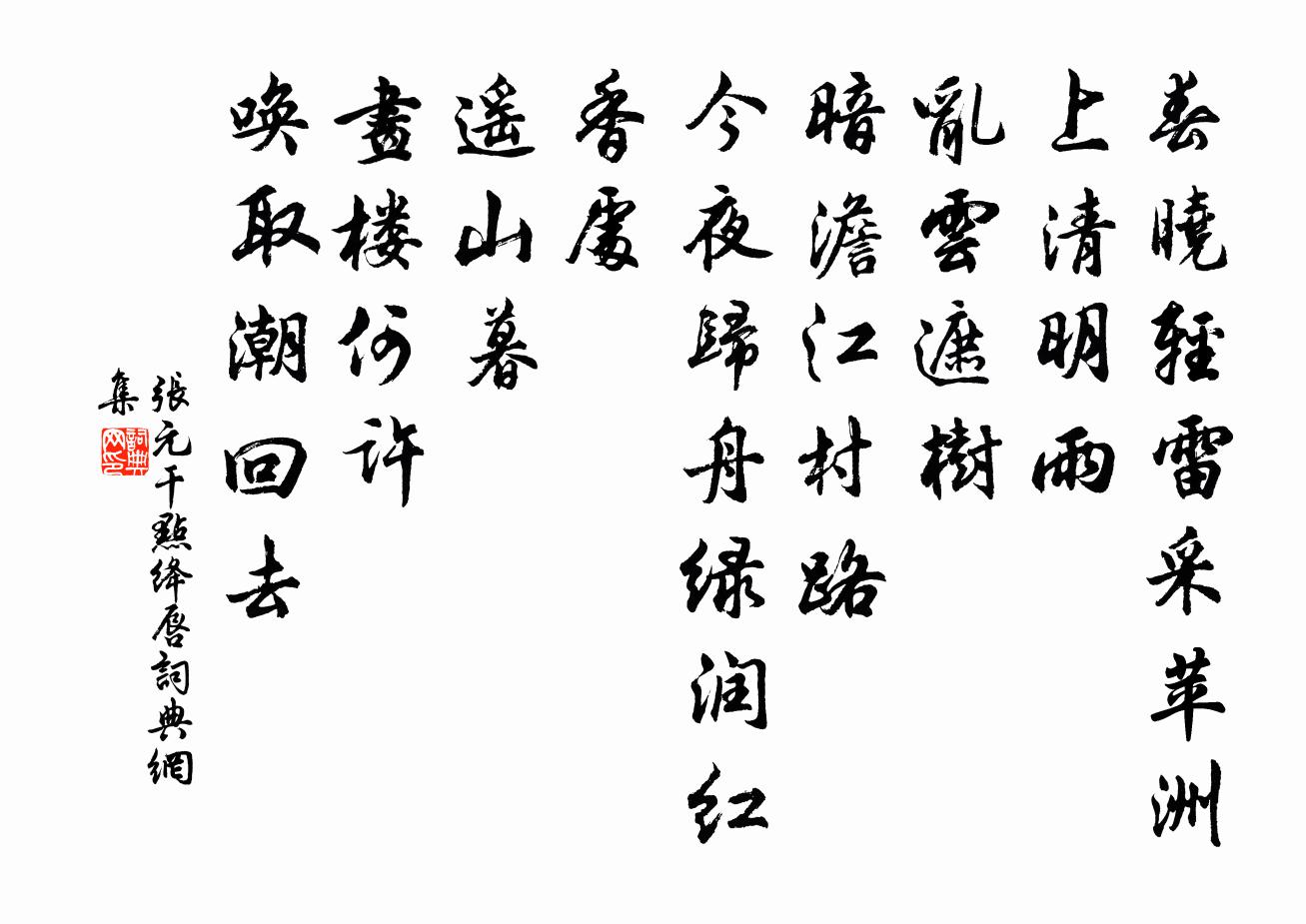 詩詞名句歷史字典書法欣賞書法字典國語詞典說文解字康熙字典古漢語字典標 題 作 者 詩 句 點絳唇作者:張元乾 朝代:宋代點絳唇原文春曉輕雷,采苹洲上清明雨。亂雲遮樹。暗澹江村路。今夜歸舟,綠潤紅香處。遙山暮。畫樓何許。喚取潮回去。詩詞問答問:點絳唇的作者是誰?答:張元乾問:點絳唇寫於哪個朝代?答:宋代問:點絳唇是什麼體裁?答:詞問:張元乾的名句有哪些?答:張元乾名句大全張元乾點絳唇書法欣賞點絳唇書法作品詩詞推薦約游曾參政西墅病不能去戴復古〔宋代〕骨肉去家遠,異鄉童僕親。老身渾賴汝,久病亦愁人。無暇游西墅,尋醫訪北辰。主翁翻作使,奔走莫勞神。送陳漫翁葉適〔宋代〕笠澤老龜蒙,蛹臥絲自裹。君從蓮葉畔,親領末後語。憐我未得聞。獨繭授長緒。因茲服英悟,鬱郁副奇許。士於村社歌李若川〔宋代〕清曉冬冬鳴杜鼓,前村後村走兒女。田家醵錢共賽神,謝神時晴復時雨。案有餚酒爐有香,老巫禱祝躬案傍。願得聞鷓鴣尤侗〔清代〕鷓鴣聲里夕陽西,陌上征人首盡低。遍地關山行不得,為誰辛苦盡情啼?水調歌/水調佚名〔宋代〕八月秋欲半,後夜月將圓。天潢當日流潤,餘派落人寰。塵掃長淮千里,威振南蠻八郡,梓里繡衣還。芳毓燕山桂初夏陸游〔宋代〕雨足移秧後,風和剝繭初。昏昏時就枕,貿貿卻尋書。晚步身須杖,晨興發廢梳。滿城車馬客,誰復問何如?臘旦大雪運使何同叔送羊羔酒拙詩為謝周必大〔宋代〕未雪兵廚已擊鮮,雪中從事到尊前。淺斟未辦銷金帳,快瀉聊憑藥玉船。醉夢免教園踏菜,富兒休詫饌羅膻。爛頭生查子王千秋〔宋代〕枝垂雲碧長,心展鵝黃嫩。無力倚闌時,掃盡漫山杏。玲瓏影結陰,蘊藉香成陣。誰為祝東風,更莫催花信。題惠泉師壁路振〔宋代〕漢公嘗說惠泉師,解講楞嚴解賦詩。今日我來師已支,草堂風雨立多時。明月皎夜光佚名〔兩漢〕明月皎夜光,促織鳴東壁。玉衡指孟冬,眾星何歷歷!白露沾野草,時節忽復易。秋蟬鳴樹間,玄鳥逝安適?昔我鰲溪謝諤〔宋代〕數版小橋橫晚晴,兩行古木弄春榮。不知多少夜來雨,水到岸頭渾欲平。閨怨黃滔〔唐代〕妾家五嶺南,君戍三城北。雁來雖有書,衡陽越不得。別久情易料,豈在窺翰墨。塞上無煙花,寧思妾顏色。使閩過延平劉震孫〔宋代〕川媚山輝寶氣鍾,尊堯而後幾儒宗。往來但指龍津說,不道人中自有龍。摽有梅佚名〔先秦〕摽有梅,其實七兮。求我庶士,迨其吉兮。摽有梅,其實三兮。求我庶士,迨其今兮。摽有梅,頃筐塈之。求我庶晨入省中偶書陸游〔宋代〕清風拂畫簾,初日照素壁。花枝蝶小憩,草葉露時滴。房櫳闃無人,溝水聲激激。摩挲語枯筇,伴我住幽寂。武夷觀李昴英〔宋代〕閒乘石罅船,又到浙江邊。回向初心地,皈依古洞天。成丹呼鶴舞,噴酒起龍眠。雨意偏留客,杯茶定宿緣。送邦直弟歸鄉姜特立〔宋代〕有弟自吾里,相從兩月余。老來歸日少,別去見時疏。魚階段猶前日,鴒原尚故居。不知風雨夕陽,相憶更何如。頌古一百則釋正覺〔宋代〕末後句,會也無,德山父子太含胡。座中亦有江南客,莫向人前唱鷓鴣。頌證道歌證道歌釋印肅〔宋代〕雪山肥膩更無雜,沌一摩尼相間夾。珍珠寶網影重重,頂禮歸依無縫塔。詠史詩烏江胡曾〔唐代〕爭帝圖王勢已傾,八千兵散楚歌聲。烏江不是無船渡,恥向東吳再起兵。名句推薦綠葉青跗映丹萼,與君裴回上金閣。王勃《落花落》 人不通今古,馬牛如襟裾。佚名《增廣賢文·上集》 江上小堂巢翡翠,花邊高冢臥麒麟。杜甫《曲江二首》 綠波春浪滿前陂,極目連雲稏肥。韋莊《稻田》 風力雖尚勁,然徒步則汗出浹背。袁宏道《滿井遊記》 曲徑穿花尋蛺蝶,虛闌傍日教鸚鵡。岳珂《滿江紅·小院深深》 兵起而程敵,政不若者勿與戰;食不若者勿與久;敵眾勿為客;敵盡不如,擊之勿疑。商鞅《商君書·戰法》 誰念西風獨自涼,蕭蕭黃葉閉疏窗,沉思往事立殘陽。納蘭性德《浣溪沙·誰念西風獨自涼》 七夕年年信不違,銀河清淺白雲微,蟾光鵲影伯勞飛。毛文錫《浣溪沙·七夕年年信不違》 以我獨沉久,愧君相見頻。司空曙《喜外弟盧綸見宿》
