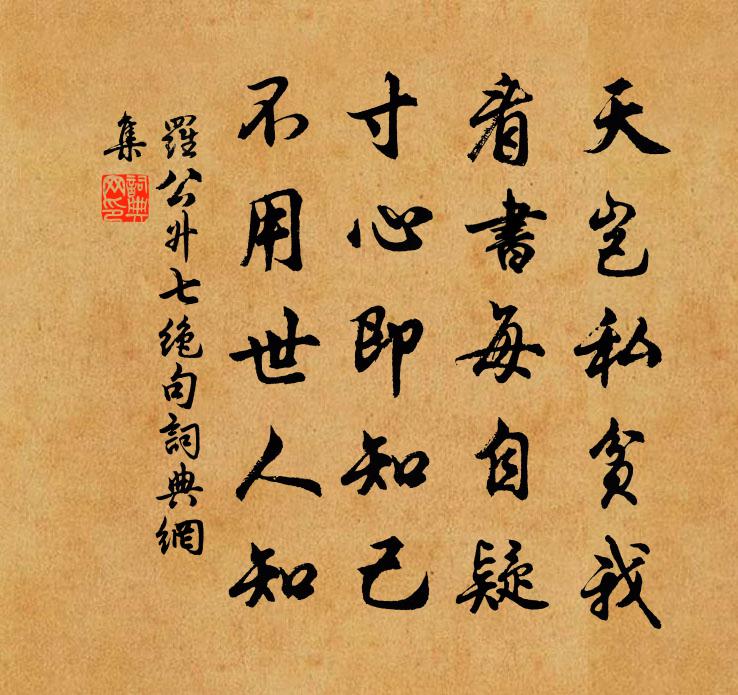 詩詞名句歷史字典書法欣賞書法字典國語詞典說文解字康熙字典古漢語字典標 題 作 者 詩 句 七絕句作者:羅公升 朝代:宋代七絕句原文天豈私貧我,看書每自疑。寸心即知己,不用世人知。詩詞問答問:七絕句的作者是誰?答:羅公升問:七絕句寫於哪個朝代?答:宋代羅公升七絕句書法欣賞七絕句書法作品詩詞推薦君子有所思行謝靈運〔南北朝〕總駕越鍾陵。還顧望京畿。躑躅周名都。游目倦忘歸。市鄽無阨室。世族有高闈。密親麗華苑。軒甍飾通逵。孰是八聲甘州汪莘〔宋代〕惜餘春、蛺蝶引春來,杜鵑趣春歸。算何如桃李,渾無言說,開落忘機。多謝黃鸝舊友,相逐落花飛。芳草連天遠在潁昌寄中立游酢〔宋代〕蕭條清潁一茅廬,魂夢長懷與子居。五里橋西楊柳路,至今車馬往來疏。蘇武慢虞集〔元代〕雲淡風輕,傍花隨柳,將謂少年行樂。高閣林間,小車城裡,千古太平西洛。瞻彼泱泱,言思君子,流水儼然如昨自安仁至豫章途中雜興十九首趙蕃〔宋代〕極目荒陂十里余,壞塍依約舊犂鋤。問言業薄無牛力,更說州家催積租。哭李端周朴〔唐代〕三年剪拂感知音,哭向青山永夜心。竹在曉煙孤鳳去,劍荒秋水一龍沈。新墳日落松聲小,舊色春殘草色深。不及太常寺宿齋有寄權德輿〔唐代〕轉枕挑燈候曉雞,相君應嘆太常妻。長年多病偏相憶,不遣歸時醉似泥。夜宿橋岸岳珂〔宋代〕裊纜宿前灣,平蕪泱漭間。舫移星在戶,岸迥斗藏山。淺瀨不勝揭,浮竹何日閒。夜深聞過櫓,知自溧陽還。劉正之宜樓四章黃榦〔宋代〕屏山重回首,日暮起長思。鴻雁來翩翩,共賦棠棣詩。【中呂】粉蝶兒_集曲名題秋王仲元〔元代〕集曲名題秋怨雙雁兒聲悲,景瀟瀟楚江秋意,勝陽關刮地風吹。滿庭芳,梧桐樹,全蕉葉墜。慶東原金菊香滴滴金環珠洞呂願中〔宋代〕朝野樂昇平,園林窮勝討。快雨洗塵埃,秋山淨如埽。游魚聚江灣,飢烏集木杪。群芳郁崢嶸,一水翠繚繞。雲頭詠史詩云雲亭胡曾〔唐代〕一上高亭日正晡,青山重疊片雲無。萬年松樹不知數,若個虬枝是大夫。詠尹字(頲幼年,有京兆尹過父瑰命詠尹字)蘇頲〔唐代〕醜雖有足,甲不全身。見君無口,知伊少人。次韻前人壁閒詩陳著〔宋代〕兩處詩家隔一山,此心知得兩心閒。君才終與鵬騰海,我老甘後驥伏閒。挾文薛君自賦五首克己讀書安貧擇交訓子為題程公許〔宋代〕為人非外鑠,己與物同之。私慾陰霾蔽,良心日月虧。若能無窒礙,底用苦思惟。天理渾然處,吾生自有涯。山中謁皇甫曾朱放〔唐代〕尋源路已盡,笑入白雲間。不解乘軺客,那知有此山。戍婦吟二首高翥〔宋代〕將身托戰爭,世事百無情。相對生離別,渾如落葉輕。清平樂·鶯啼殘月韋莊〔唐代〕鶯啼殘月,繡閣香燈滅。門外馬嘶郎欲別,正是落花時節。妝成不畫蛾眉,含愁獨倚金扉。去路香塵莫掃,掃即郎道過京師二首曹勛〔宋代〕都城百雉曉雲空,四塔亭亭倚望中。自是老懷多感慨,一襟清淚濕秋風。唐封泰山樂章。凱和佚名〔唐代〕烈祖順三靈,文宗威四海。黃鉞誅群盜,朱旗掃多罪。戢兵天下安,約法人心改。大哉乾羽意,長見風雲在。名句推薦長夏村墟風日清,檐牙燕雀已生成。張耒《夏日三首·其一》 花光濃爛柳輕明,酌酒花前送我行。歐陽修《別滁》 又似賈客蜀道間,千鐸萬磬鳴空山牛殳《琵琶行》 花自飄零水自流。一種相思,兩處閒愁。李清照《一剪梅·紅藕香殘玉簟秋》 千層石樹遙行路,一帶山田放水聲。姚鼐《山行·布穀飛飛勸早耕》 去年相送,餘杭門外,飛雪似楊花。蘇軾《少年游·潤州作》 床空委清塵,室虛來悲風。潘安《悼亡詩三首》 貧者士之常也,死者人之終也,處常得終,當何憂哉?列子及其弟子《列子·天瑞》 舟遙遙以輕颺,風飄飄而吹衣。陶淵明《歸去來兮辭·並序》 青春須早為,豈能長少年。孟郊《勸學》