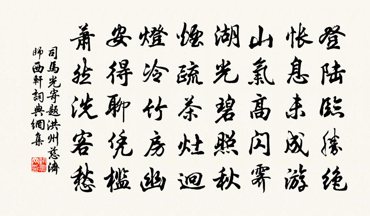 詩詞名句歷史字典書法欣賞書法字典國語詞典說文解字康熙字典古漢語字典標 題 作 者 詩 句 寄題洪州慈濟師西軒作者:司馬光 朝代:宋代寄題洪州慈濟師西軒原文登入臨勝絕,悵息未成游。山氣高閃霽,湖光碧照秋。煙疏茶灶迥,燈冷竹房幽。安得聊憑檻,蕭然洗客愁。詩詞問答問:寄題洪州慈濟師西軒的作者是誰?答:司馬光問:寄題洪州慈濟師西軒寫於哪個朝代?答:宋代問:司馬光的名句有哪些?答:司馬光名句大全司馬光寄題洪州慈濟師西軒書法欣賞寄題洪州慈濟師西軒書法作品詩詞推薦歸彭城韓愈〔唐代〕天下兵又動,太平竟何時。訏謨者誰子,無乃失所宜。前年關中旱,閭井多死飢。去歲東郡水,生民為流屍。上天題紫閣院張蠙〔唐代〕上方人海外,苔徑上千層。洞壑有靈藥,房廊無老僧。古岩雕素像,喬木掛寒燈。每到思修隱,將回苦不能。劉項祠胡仲弓〔宋代〕二祠相望幾春秋,祀了龍顏祀沐猴。章戴溪南梨嶺北,不知何處是鴻溝。行者求頌釋曇華〔宋代〕了身不若了心休,了得心時身不愁。若也身心俱了了,神仙何必更封侯。賀恕齋除兵部侍郎釋道璨〔宋代〕碉我老色氣精明,南海歸來住未成。不道山中無宰相,要從恕上做功名。雲屯萬騎西風急,月浸三更夜柝清。謀國頌古一○一首釋子淳〔宋代〕群花未發梅先拆,萬木凋零柏轉奇。雲淡不彰節月影,煙輕那露引風枝。老疾戲自贈陸游〔宋代〕年過七十日夜衰,羸然骨立不支持。一身百病作無時,飯且不足那論醫。鏡中之人定是誰,面骨突兀鬢成絲。買棺王尚書生辰強至〔宋代〕肅時天氣凝良月,近晦星精降慶閭。弱冠文章驚殿幄,青春富貴絕朝裾。安危倚注心逾壯,中外翱翔發未疏。禁職喜晴張九成〔宋代〕數日陰霖氣不舒,江流作漲吾其魚。晚來風起雲頭散,夜半星辰滿太虛。山中李鹹用〔唐代〕一簇煙霞榮辱外,秋山留得傍檐楹。朝鐘暮鼓不到耳,明月孤雲長掛情。世上路岐何繚繞,水邊蓑笠稱平生。尋思寄陳居士曹勛〔宋代〕君住西山我住東,杖藜時復得相從。欣欣未見飄飄舉,楚楚先經面面松。仙事既無妻子累,丹爐自有鬼神供。來春徐山甫夜話有詩言別次韻金履祥〔宋代〕一榻蕭然竹與蘭,擁衾話別轉留難。明朝又渡湘江去,細雨斜風分外寒。游雁盪山八首大龍湫瀑布徐照〔宋代〕飛下數千盡,全然無定形。電橫天日射,龍出石雲腥。壯勢春曾看,寒聲佛共聽。昔人云此水,洗目最能靈。示子聿陸游〔宋代〕故山誰伴隱茅茨,幸有吾家大耳兒。雨暗小窗分夜課,雪迷長鑱共朝飢。名場未捷寧妨學,史限雖嚴不廢詩。我死醉蓬萊晁端禮〔宋代〕看梅梢初動,池面冰澌,小春時候。當日生賢,慶黃家忠厚。龍種殊常,照人眉宇,似汝陽端秀。世取賢科,臚傳崇寧壬午臨汝四月始聞鶯二首張耒〔宋代〕好音終在恥爭先,谷外寒多故後遷。已過花時亦何恨,不妨夏木綠參天。漫成呈文潛五首晁補之〔宋代〕花如怨人不近眼,深院一枝春得知。東風不是不愛惜,剛為花愁真是誰。游太清宮出城馬上口占歐陽修〔宋代〕擁旆西城一據鞍,耕夫初識勸農官。鴉鳴日出林光動,野闊風搖麥浪寒。漸暖綠楊才弄色,得晴丹杏不勝繁。牛羊街西晚歸鄭谷〔唐代〕御溝春水繞閒坊,信馬歸來傍短牆。幽榭名園臨紫陌,晚風時帶牡丹香。次馬撫乾韻贈黃泰之狀元喻良能〔宋代〕褎然射策向明光,紫禁春深日正長。風細御爐煙冉冉,天晴宮柳絮茫茫。玉階親奉唐虞問,彩筆濃薰班馬香。千佛名句推薦築室兮水中,葺之兮荷蓋;屈原《九歌·湘夫人》 君子而詐善,無異小人之肆惡;君子而改節,不若小人之自新。洪應明《菜根譚·概論》 漸紅濕杏泥,愁燕無語。吳文英《掃花游·西湖寒食》 荊山長號泣血人,忠臣死為刖足鬼李白《鞠歌行》 嚴近乎矜,然嚴是正氣,矜是乖氣;故持身貴嚴,而不可矜。王永彬《圍爐夜話·第四三則》 催成清淚,驚殘孤夢,又揀深枝飛去。陸游《鵲橋仙·夜聞杜鵑》 做弄得、酒醒天寒,空對一庭香雪。張炎《疏影·梅影》 四十三年,望中猶記,烽火揚州路。辛棄疾《永遇樂·京口北固亭懷古》 食必常飽,然後求美;衣必常暖,然後求麗劉向《說苑·反質》 去年折贈行人遠,今年恨、依然縴手。吳文英《花心動·柳》