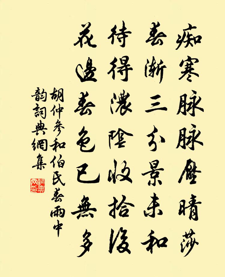 詩詞名句歷史字典書法欣賞書法字典國語詞典說文解字康熙字典古漢語字典標 題 作 者 詩 句 和伯氏春雨中韻作者:胡仲參 朝代:宋代和伯氏春雨中韻原文痴寒脈脈壓晴莎,春漸三分景未和。待得濃陰收拾後,花邊春色已無多。詩詞問答問:和伯氏春雨中韻的作者是誰?答:胡仲參問:和伯氏春雨中韻寫於哪個朝代?答:宋代胡仲參和伯氏春雨中韻書法欣賞和伯氏春雨中韻書法作品詩詞推薦賀新郎(用前韻再賦)辛棄疾〔宋代〕肘後俄生柳。嘆人生、不如意事,十常 * 。右手淋浪才有用,閒卻持螯左手。謾贏得、傷今感舊。投閣先生惟寂贈薛濤白居易〔唐代〕蛾眉山勢接雲霓,欲逐劉郎北路迷。若似剡中容易到,春風猶隔武陵溪。對食戲作陸游〔宋代〕米如玉粒喜新舂,菜出煙畦旋摘供。但使胸中無愧怍,一餐美敵紫駝峰。寄王料院三首岳珂〔宋代〕一葉扁舟興浩然,筆床茶灶舊因緣。帆歸西塞秋風外,人在南樓夜月前。情不自由君憶我,老無所用我知天。何時隔浦蓮近/隔浦蓮近拍彭元遜〔宋代〕夜寒晴早人起。見柳知新翠。撼樹試花意。兩蜂狂救墮蕊。見著羞懶避。春都在,時節到愁地。屏間字。香痕半掏浙江潮圖釋智愚〔宋代〕怒勢自驚殊莫擬,靜心人見骨毛寒。平生一對風波眼,今日晴窗不忍看。讀五代史曾鞏〔宋代〕唐衰非一日,遠自開元中。尚傳十四帝,始告歷數窮。由來根本強,暴戾豈易攻。嗟哉梁周間,卒莫相始終。興無夏日珠溪賦八音體方岳〔宋代〕金篩薜羅月,玉戛琅玕風。石根一睡美,幽尚誰與同。絲棼俗士懷,顛倒崔烈銅。竹筇肯俱來,獨予兩詩窮。匏瓠菩薩蠻曾覿〔宋代〕雲煙漠漠秋容老。茅檐映水人家好。林葉未凋疏。遠山橫有無。平生耕釣事。若個安身事。勸君早歸來。碧香新瓮自喻王周〔唐代〕予念天之生,生本空疏器。五歲稟慈訓,憤悱讀書志。七歲辨聲律,勤苦會詩賦。九歲執公卷,倜儻乾名意。乞薦登江亭晚望賈島〔唐代〕浩渺浸雲根,煙嵐沒遠村。鳥歸沙有跡,帆過浪無痕。望水知柔性,看山欲倦魂。縱情猶未已,回馬欲黃昏。再和二首郭印〔宋代〕涉海必假舟航,登山當尋蹊徑。每嘆修身錯路,譬如飲藥加病。逢人須是問津,有心未免擊磬。況遇先覺先知,早水調歌頭(和吳鶴林舍人送楊帥韻)李曾伯〔宋代〕萬里長淮北,青是漢時山。幾年壁壘相望,高枕度春閒。不道草廬豪傑,手袖伊吾長劍,馳志在樓蘭。鍾鼓令秋肅沁園春(奉柬章史君再游西園)黃機〔宋代〕問訊西園,一春幾何,君今再游。記流觴亭北,偷拈酒戲,凌雲台上,暗度詩鬮。略略花痕,差差柳意,十日不來聖俞惠詩復以二章為謝司馬光〔宋代〕我得聖俞詩,於家果何如。留為子孫寶,勝有千金珠。王母歌(一作玉女歌)韋應物〔唐代〕眾仙翼神母,羽蓋隨雲起。上游玄極杳冥中,下看東海一杯水。海畔種桃經幾時,千年開花千年子。玉顏眇眇何處羅湖八首劉克莊〔宋代〕衡岳仙都跡已陳,雲台玉局敕猶新。暮年擬乞沖虛觀,長向山中祝聖人。懷南塘朱省閱衛宗武〔宋代〕我如蟄戶居,跬步不可移。君有遠行役,暑途方驅馳。覘知所如往,謂已杭雙溪。人苟懷忠信,蠻貊其行之。平生憲司後園葺舊亭榜以明秀元少監有詩次韻郭印〔宋代〕爛漫煙光一目收,危亭葺就壯岑樓。三巴故國山川在,萬古長空日月流。江水奔騰無晝夜,石田耕穫漫春秋。興來僧了仙攜馬太守唱和求詩項安世〔宋代〕故國巴山里,寒砧楚戶邊。上人名籍籍,剌史札翩翩。世有羞儒服,吾方厭俗緣。更須求愈輩,章句待磨研。名句推薦昔聞洞庭水,今上岳陽樓杜甫《登岳陽樓》 分明小像沉香縷,一片傷心欲畫難。納蘭性德《於中好·送梁汾南還為題小影》 願隨孤月影,流照伏波營。沈如筠《閨怨二首·其一》 飛雪過江來,船在赤欄橋側。呂渭老《好事近·飛雪過江來》 渡頭餘落日,墟里上孤煙。王維《輞川閒居贈裴秀才迪》 想牧之、千載尚神遊,空山冷。吳潛《滿江紅·齊山繡春台》 花開紅樹亂鶯啼,草長平湖白鷺飛。徐元傑《湖上》 表獨立兮山之上,雲容容兮而在下;屈原《九歌》 陪都歌舞迎佳節,遙祝延安景物華。 * 《元旦口占用柳亞子懷人韻》 弱水三千,我只取一瓢飲。曹雪芹《紅樓夢·第九十一回》