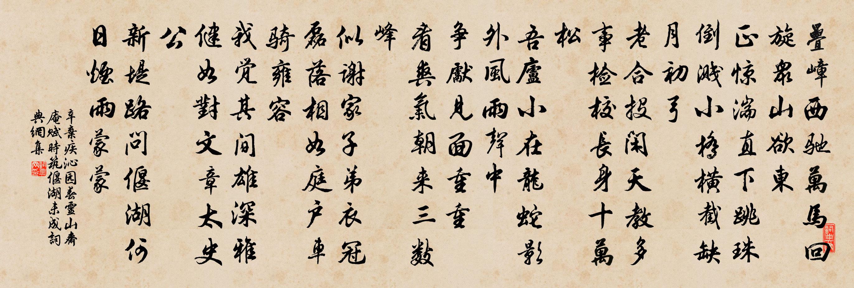 在這種地方,詞人輕輕點到即止,順勢落到自己山中結廬的事上來。齊庵,是辛棄疾在靈山修建的一所茅廬。他說,這房子選的地點還是不錯的,“在龍蛇影外,風雨聲中。”每當皓月當空,可以看到狀如龍蛇般盤屈的松影,又可以聽到聲如風雨的萬壑松濤,別有一番情趣啊!