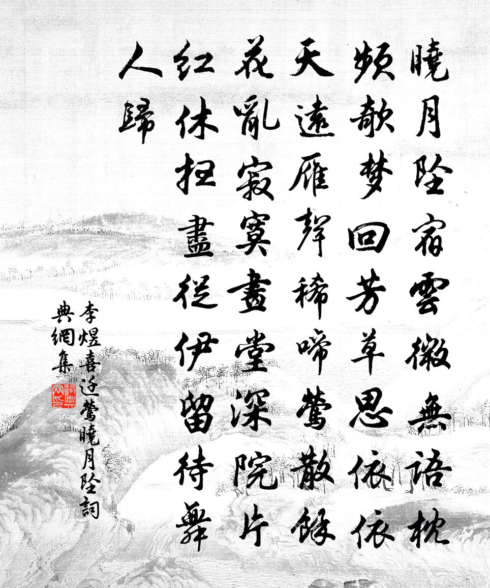 拂曉的月亮墜下藍天,夜空雲霧已經微淡,默默無語倚在枕上。夢醒仍戀芳草綿綿,雁聲消失遙遠天邊。