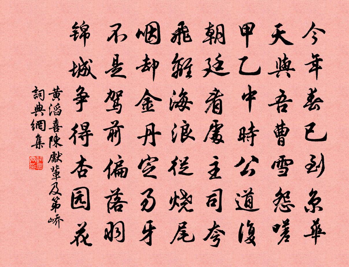 詩詞名句歷史字典書法欣賞書法字典國語詞典說文解字康熙字典古漢語字典標 題 作 者 詩 句 喜陳先輩及第嶠作者:黃滔 朝代:唐代喜陳先輩及第嶠原文今年春已到京華,天與吾曹雪怨嗟。甲乙中時公道復,朝廷看處主司夸。飛離海浪從燒尾,咽卻金丹定易牙。不是駕前偏落羽,錦城爭得杏園花。詩詞問答問:喜陳先輩及第嶠的作者是誰?答:黃滔問:喜陳先輩及第嶠寫於哪個朝代?答:唐代黃滔喜陳先輩及第嶠書法欣賞喜陳先輩及第嶠書法作品注釋全唐詩:卷705-34詩詞推薦望薊門祖詠〔唐代〕燕台一望客心驚,笳鼓喧喧漢將營。萬里寒光生積雪,三邊曙色動危旌。沙場烽火連胡月,海畔雲山擁薊城。少小祝英台近周密〔宋代〕燭搖花,香裊穗,獨自奈春冷。過了收燈,才始作花信。無端雨外餘酲,鶯邊殘夢,又還動、惜芳心性。忍重省。西瞻堂程公許〔宋代〕子長愛奇隘八荒,岷雪千仞瓊佩鏘,太守德厚民不忘,倚公筆椽輝耿光。西瞻大書揭高堂,倚欄起我意激昂。鏤冰崧嶺石泉陳文蔚〔宋代〕高城石井下成池,對自初分混沌時。雖小古今無涸溢,卻憐江海有盈虧。臨江仙 壽黃鎮撫王旭〔元代〕莫怪今年秋色晚,黃花留過重陽。要隨仙客九霞觴。助添無量壽,滿意泛清香。富貴功名天已了,何須更問行藏。玉漏遲葛立方〔宋代〕窗戶明環堵。山容黛染,水光綃舞。荷蓋擎煙,花映步波神女。嫩臉鉛華掩素,無語向、薰風凝佇。晴又雨。征鞞秋詞二首秦觀〔宋代〕無數青莎繞玉階,夕陽紅淺過牆來。西風莫道無情思,未放芙蓉取次開。酬本部韋左司顧況〔唐代〕好鳥依佳樹,飛雨灑高城。況與二三子,列坐分兩楹。文雅一何盛,林塘含餘清。府君未歸朝,遊子不待晴。白雲晚釋文珦〔宋代〕殘陽下西岑,暝色起平坂。林下一僧歸,鐘聲煙際遠。戀繡衾陸游〔宋代〕不惜貂裘換釣篷。嗟時人、誰識放翁。歸棹借、樵風穩,數聲聞、林外暮鍾。幽棲莫笑蝸廬小,有雲山、煙水萬重控巴台何異〔宋代〕閱武弓刀勁利,留賓歌舞清妍。紅映連檣燈火,翠浮隔岸人煙。漫述二首蘇籀〔宋代〕跏趺圍褐越雞晨,灑落生緣治水薪。一藝湛酣任疏放,百家雜揉識疵醇。舂炊斷斷西疇穡,書記翩翩東郭{皴皮換和正父游榕溪韻張栻〔宋代〕隔岸高低露碧山,眼明使作故園看。直從榕影度輕舫,更傍溪光撫曲欄。鴻雁來希空悵望,梅花開早未初寒。喜君晚春四首張耒〔宋代〕薔薇倒架筍過鄰,夢澤茫茫欲晚春。綠暗紅稀君莫嘆,滿枝梅杏欲嘗新。答王太祝卷梅堯臣〔宋代〕朝回泥塗不可出,飢馬倦仆驅之頑。閉門獨與古人語,黃卷未終聞扣關。賢哉公族肯來顧,詩袖大篇令我刪。珠光小橋宋庠〔宋代〕野水危梁渡,凌虛一徑橫。鄭車求代涉,漢櫂且專行。濠詠觀魚樂,圯書跪履情。斜陽葭菼岸,鷗鳥為誰驚。次韻馮涪州見府李石〔宋代〕寄語巴中客,頻頻鑷鬢霜。峽雲春夢遠,江月夜珍藏。才刃應多暇,詞鋒恨太剛。僧鄰雨花地,何日再長堂。玩花與衛象同醉司空曙〔唐代〕衰鬢千莖雪,他鄉一樹花。今朝與君醉,忘卻在長沙。長垣道中作司馬光〔宋代〕極目王畿四坦然,方輿如地蓋如天。始知恃險不如德,去勻勝殘已百年。益壽美金花侯善淵〔元代〕無為清淨。不動不搖頤性命。一派寒光。遍照蓬壺入大方。無窮無測。或去或來如過客。道自通靈。目送歸魂入杳名句推薦聖人苟可以強國,不法其故;苟可以利民,不循其禮。商鞅《商君書·更法》 樂民之樂者,民亦樂其樂;憂民之憂者,民亦憂其憂。孟子《孟子·梁惠王章句下·第四節》 獨夜憶秦關,聽鍾未眠客。韋應物《夕次盱眙縣》 乘興南遊不戒嚴,九重誰省諫書函。李商隱《隋宮》 年年遊子惜余春,春歸不解招遊子。賀鑄《惜余春·急雨收春》 秋晚佳晨重物華,高台復帳駐鳴笳。宋祁《九日置酒》 假令風歇時下來,猶能簸卻滄溟水李白《上李邕》 行行重行行,與君生別離。佚名《行行重行行》 胸中有誓深于海,肯使神州竟陸沉?鄭思肖《二礪》 驟雨過,珍珠亂撒,打遍新荷。元好問《驟雨打新荷》